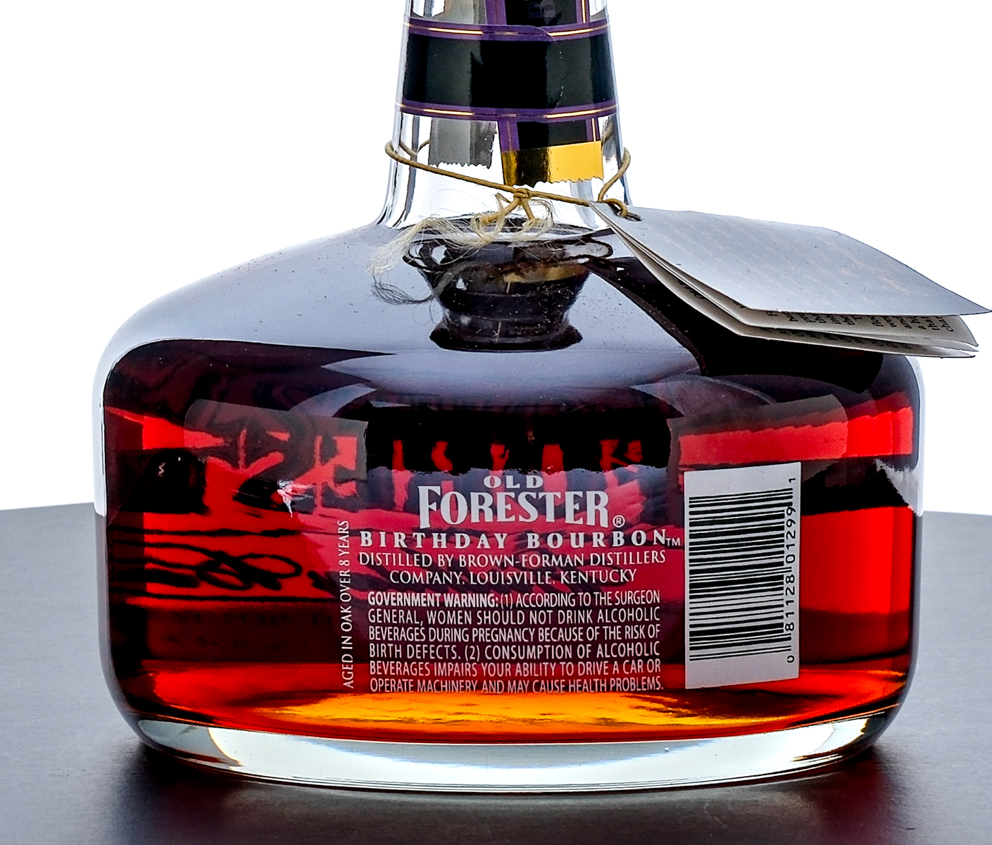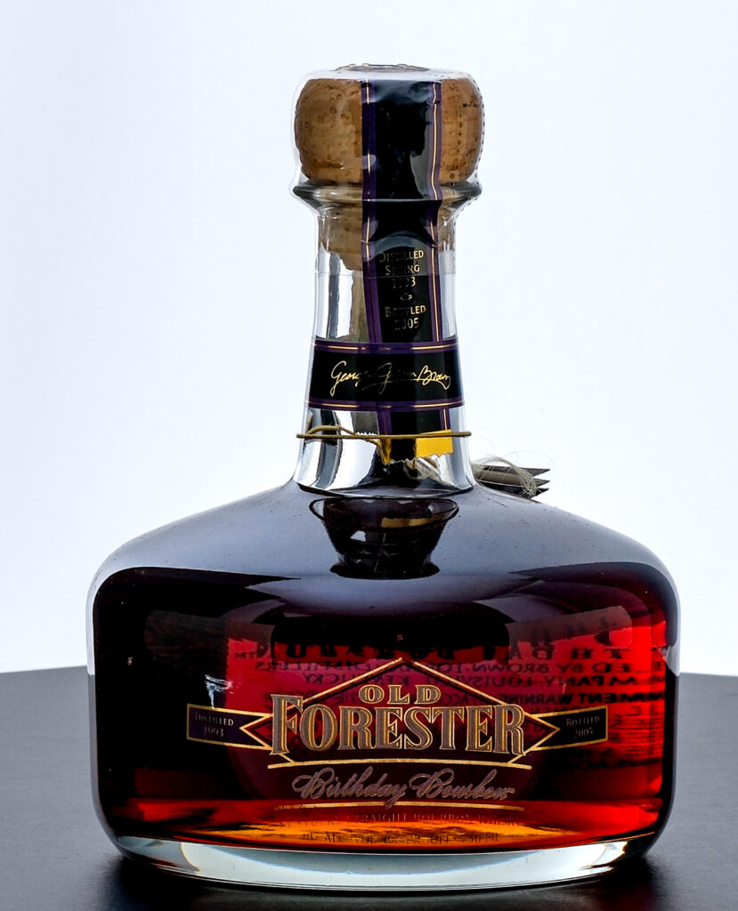 From The Collection of Michael Aronoff: Old Forester Kentucky Straight Bourbon, “Birthday Bourbon”. Aged in Oak for over 8 years. Distilled in 1995 & Bottled in 2004. 47% ALC/VOL (94 Proof). Plastic and paper seal intact. Hang tag also intact. Screen labels excellent. 750ml. Distilled by Brown-Forman Distillers Company, Louisville, Kentucky.