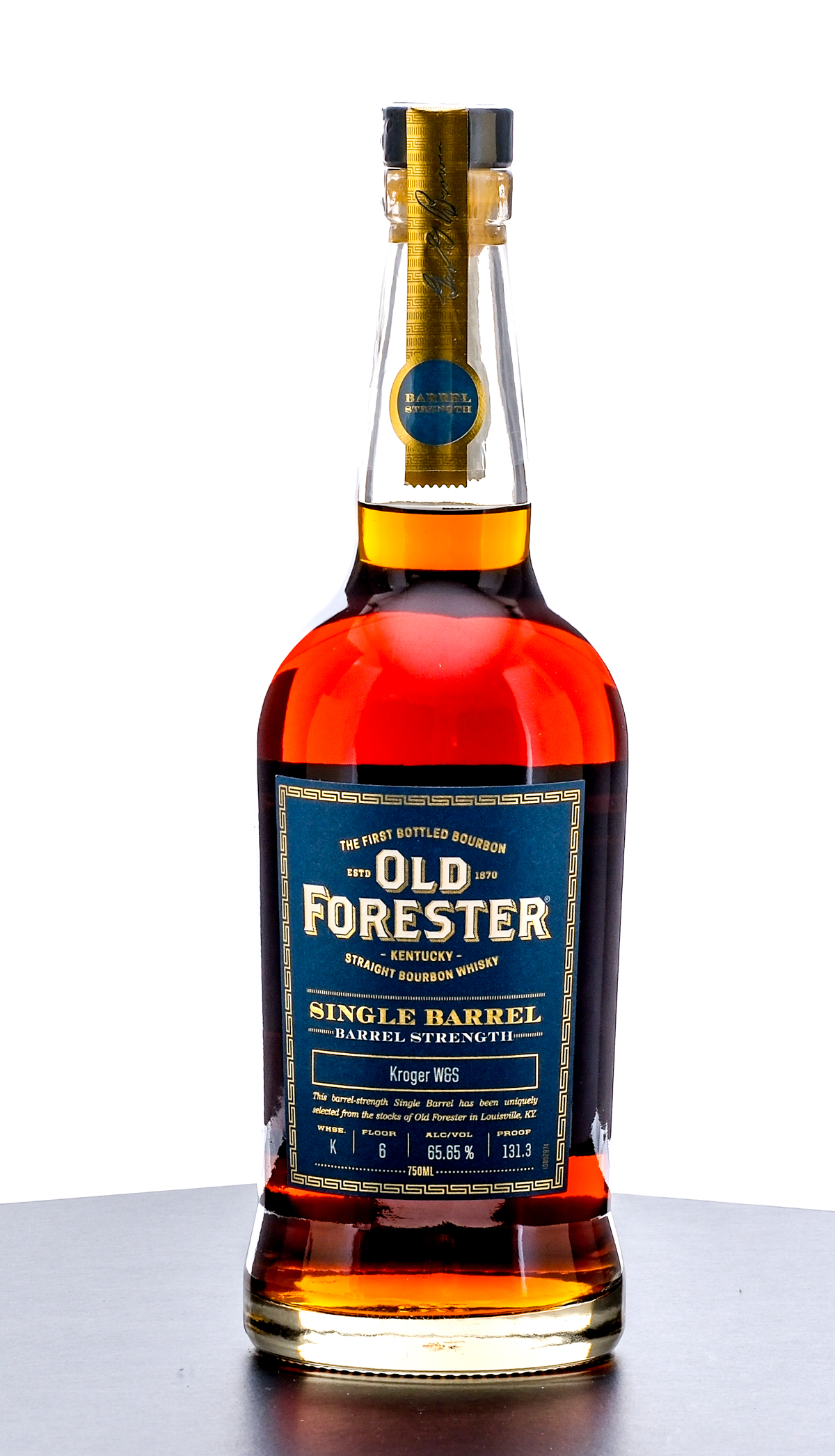 Old Forester Single Barrel Barrel Strength Kentucky Straight Bourbon Whiskey. Kroger W&S Store Select. Warehouse K, Floor 6. 65.65% ALC/VOL (131.3 Proof). Plastic and stamp seal intact. Printed labels excellent. 750ml. Distilled & bottled by Old Forester Distilling Co.