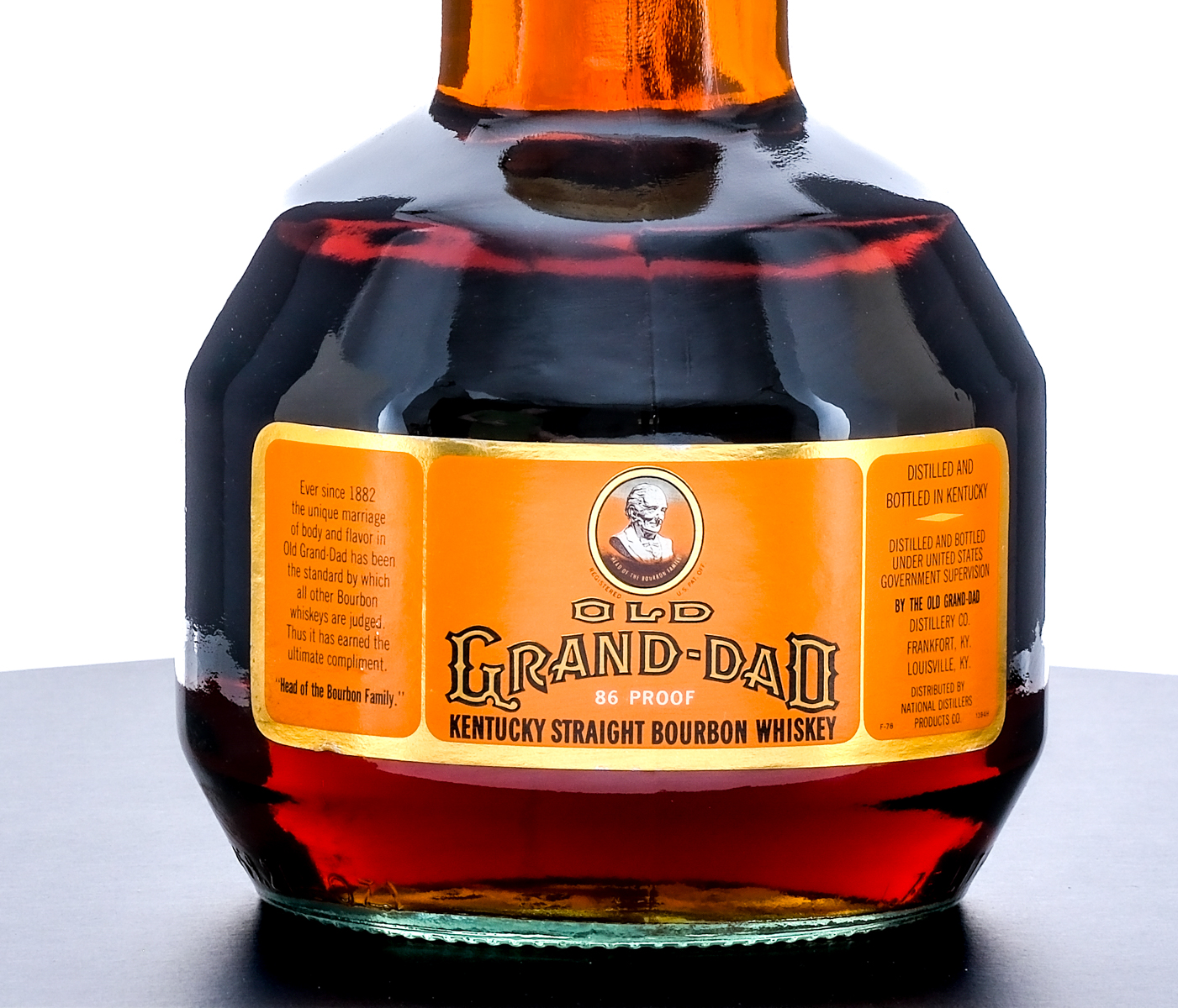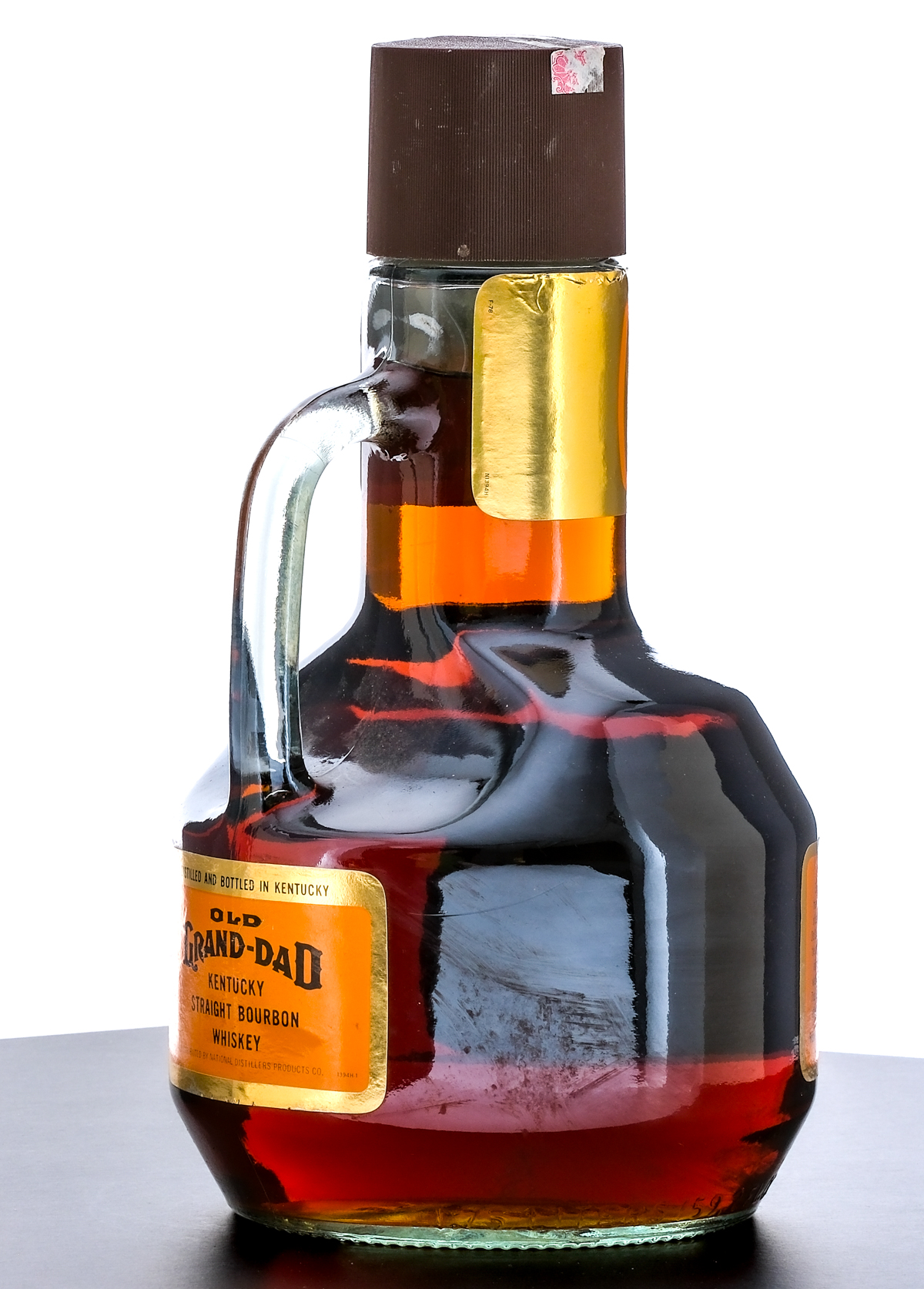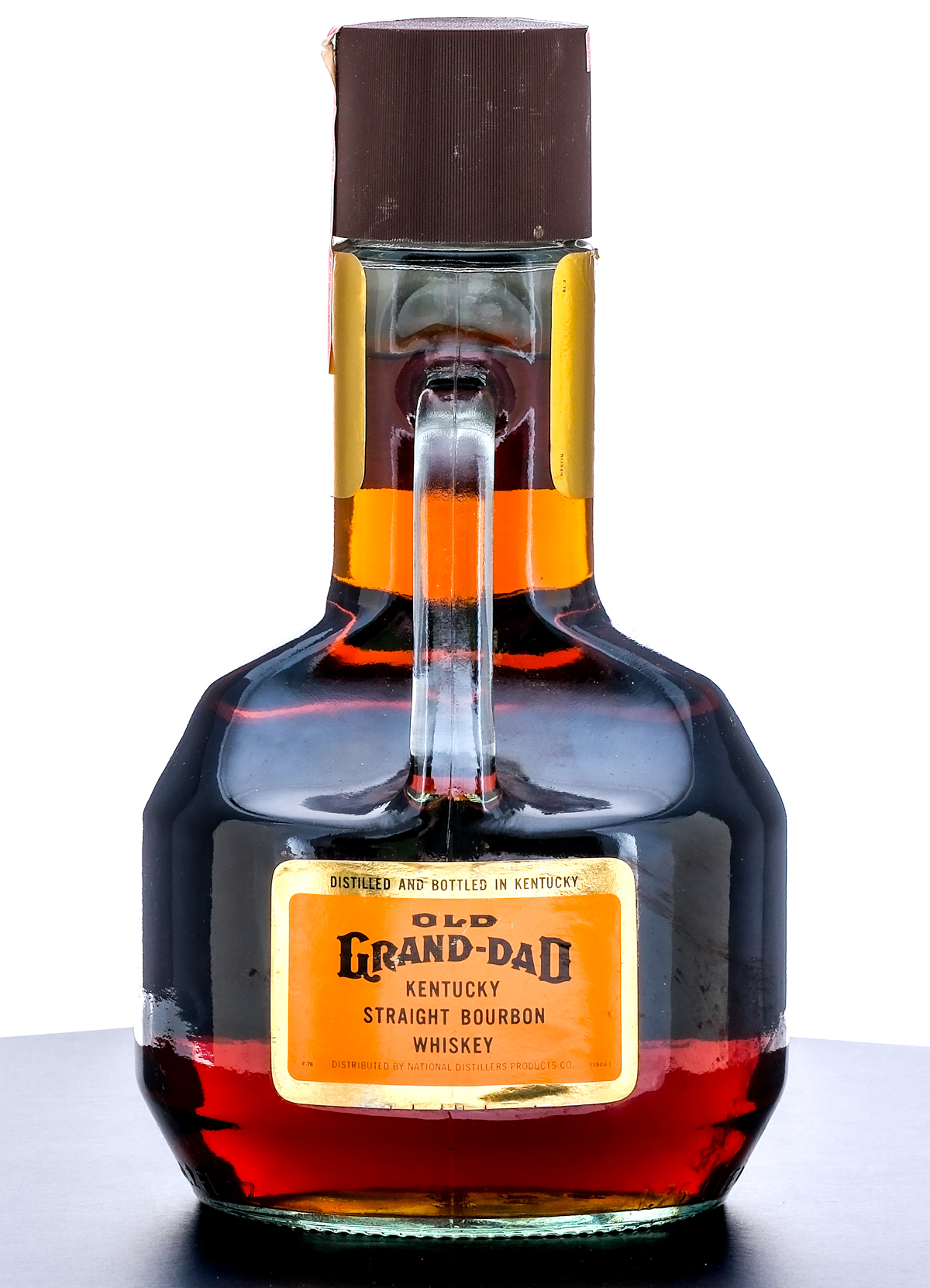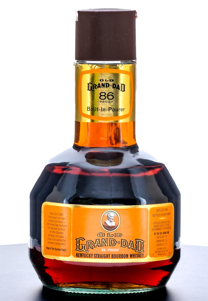 Old Grand-Dad Kentucky Straight Bourbon Whiskey. Circa 1977-1985 (possibly 1978?). Features Built-In Pourer. 86 Proof. Stamp seal intact though exhibiting losses throughout. Printed labels good given their age with small nicks, tears and losses in foil stamp prevalent. 1.75L. Distilled and bottled by The Old Grand-Dad Distillery Co. Distributed by National Distillers Products Co.