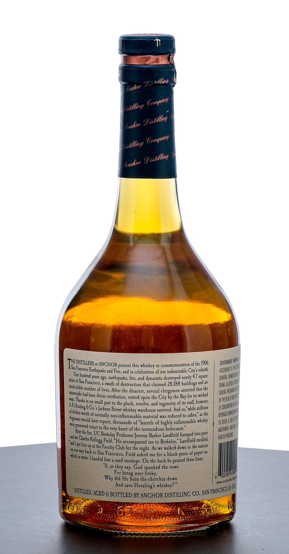 From The Collection of Michael Aronoff: Old Potrero Single Malt Hotaling’s Whiskey. Essay: MCMVI-MMVI. Pot distilled, and aged eleven years in American Oak barrels. 50% ALC/VOL (100 Proof). Foil seal very good. Printed labels good (exhibiting some nicks, staining and running of ink). 750ml. Distilled, aged & bottled by Anchor Distilling Company (San Francisco, CA).