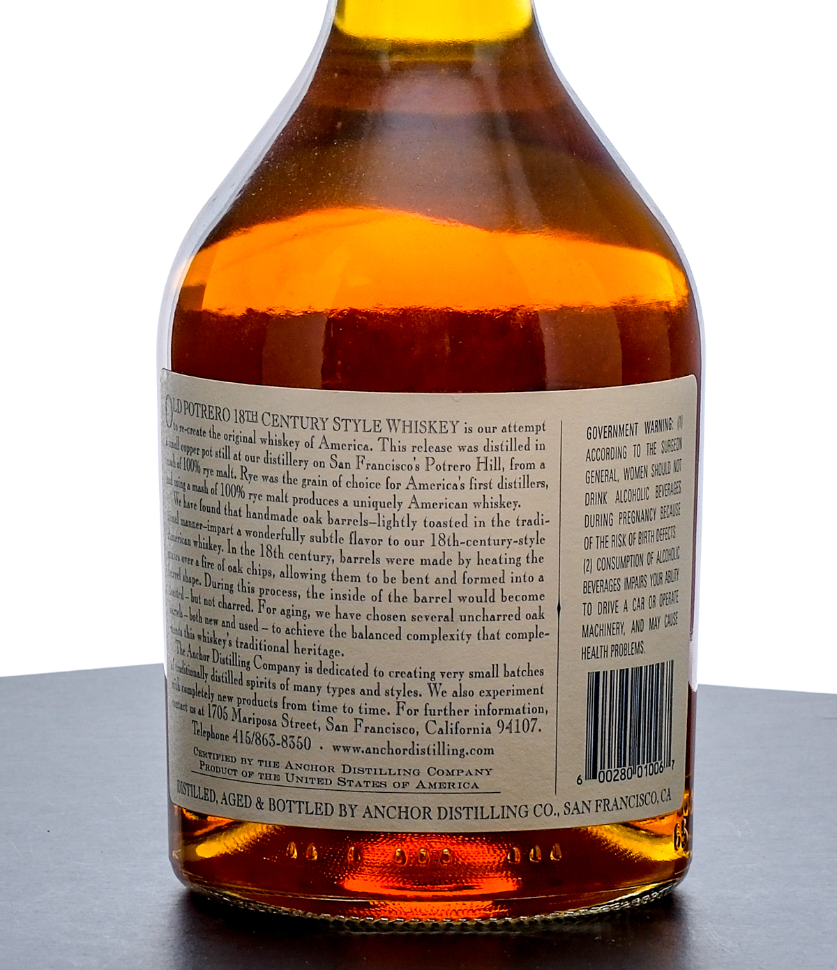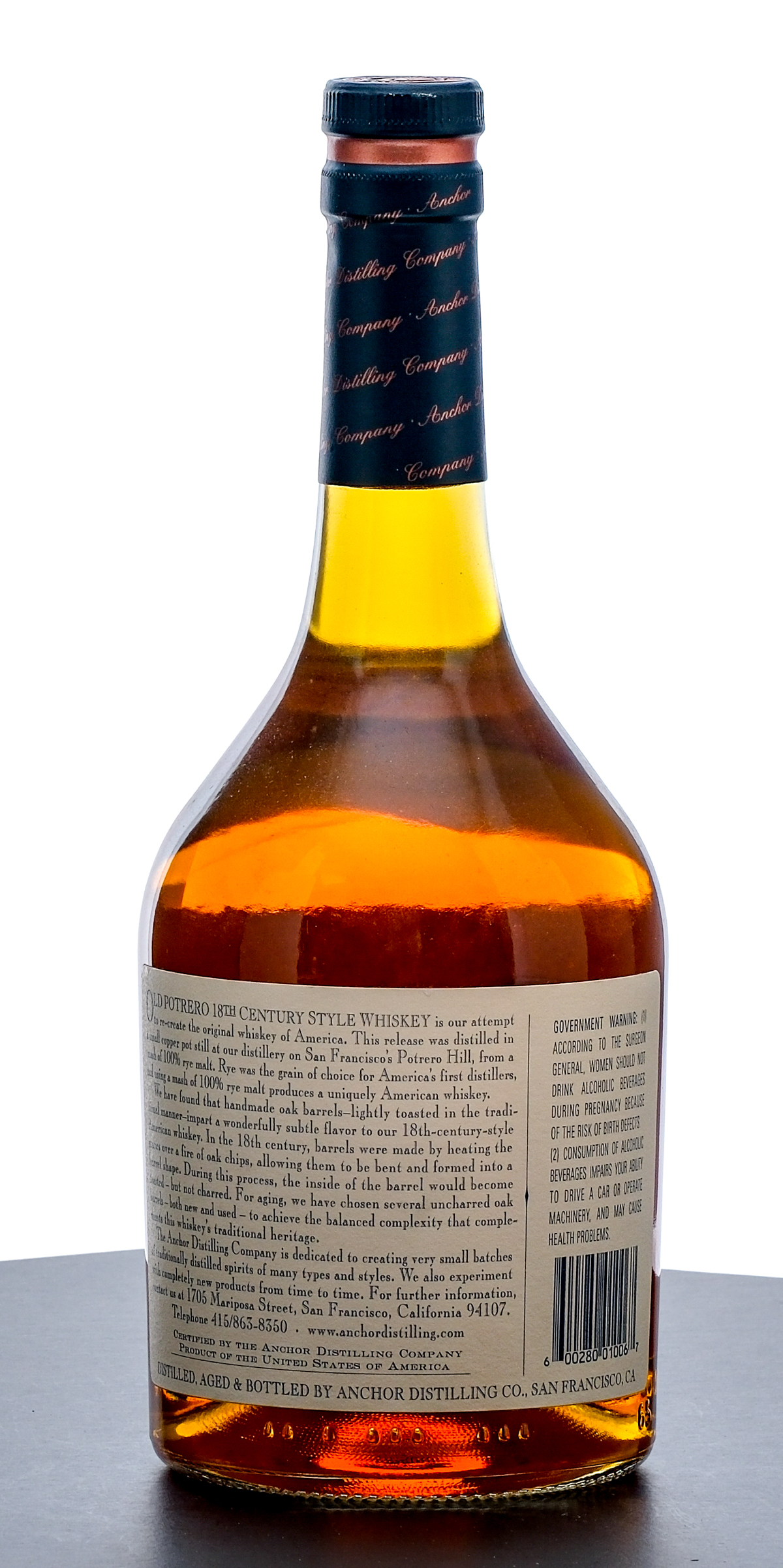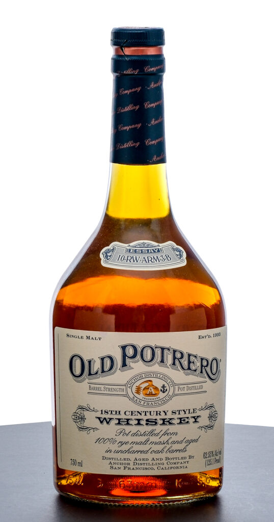 From The Collection of Michael Aronoff: Old Potrero 18th Century Style Single Malt Whiskey. Essay: 10-RW-ARM-3-B. Barrel strength. Pot distilled from 100% Rye Malt mash, and aged in uncharred Oak barrels. 62.55% ALC/VOL (125.1 Proof). Foil seal excellent. Printed labels likewise excellent. 750ml. Distilled, aged and bottled by Anchor Distilling Company (San Francisco, CA).