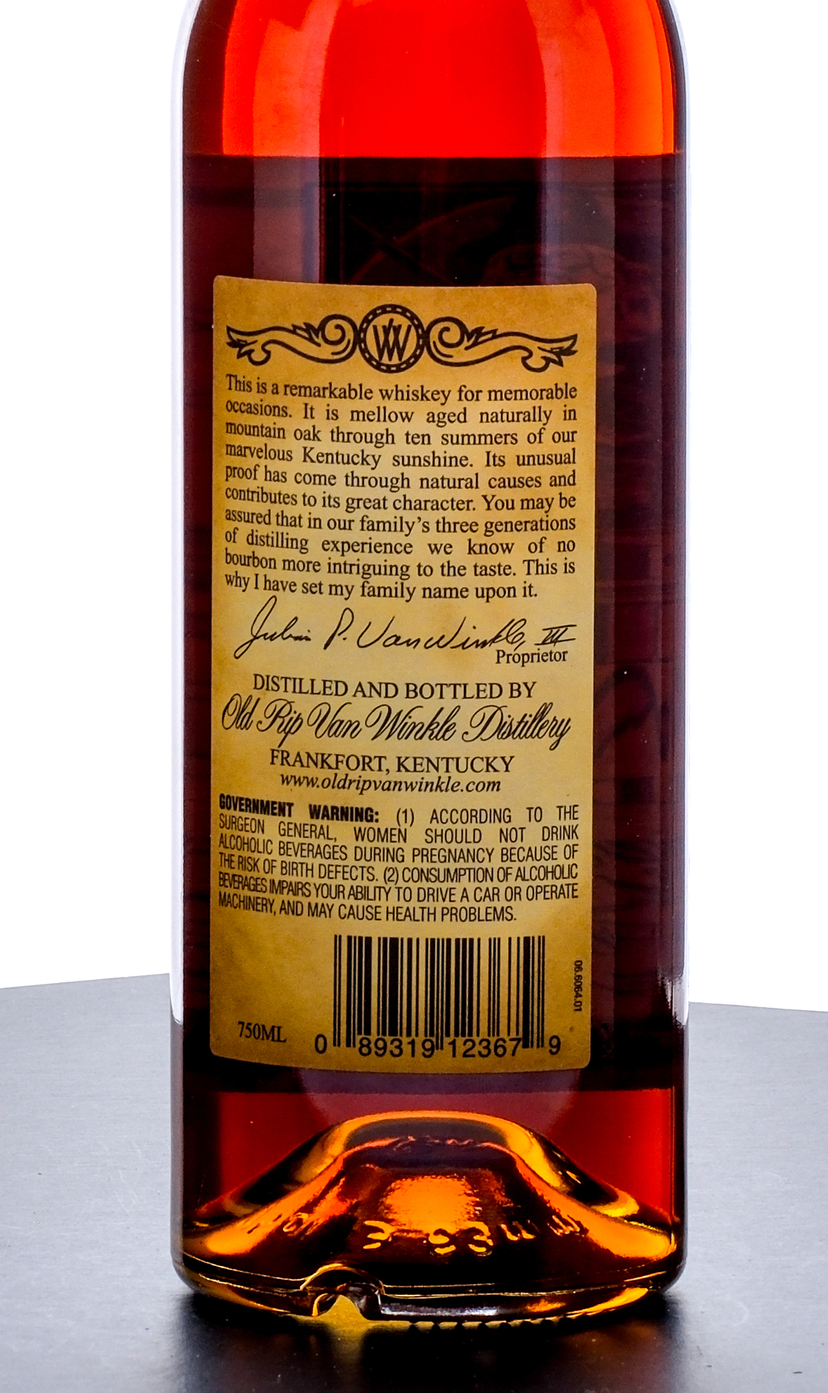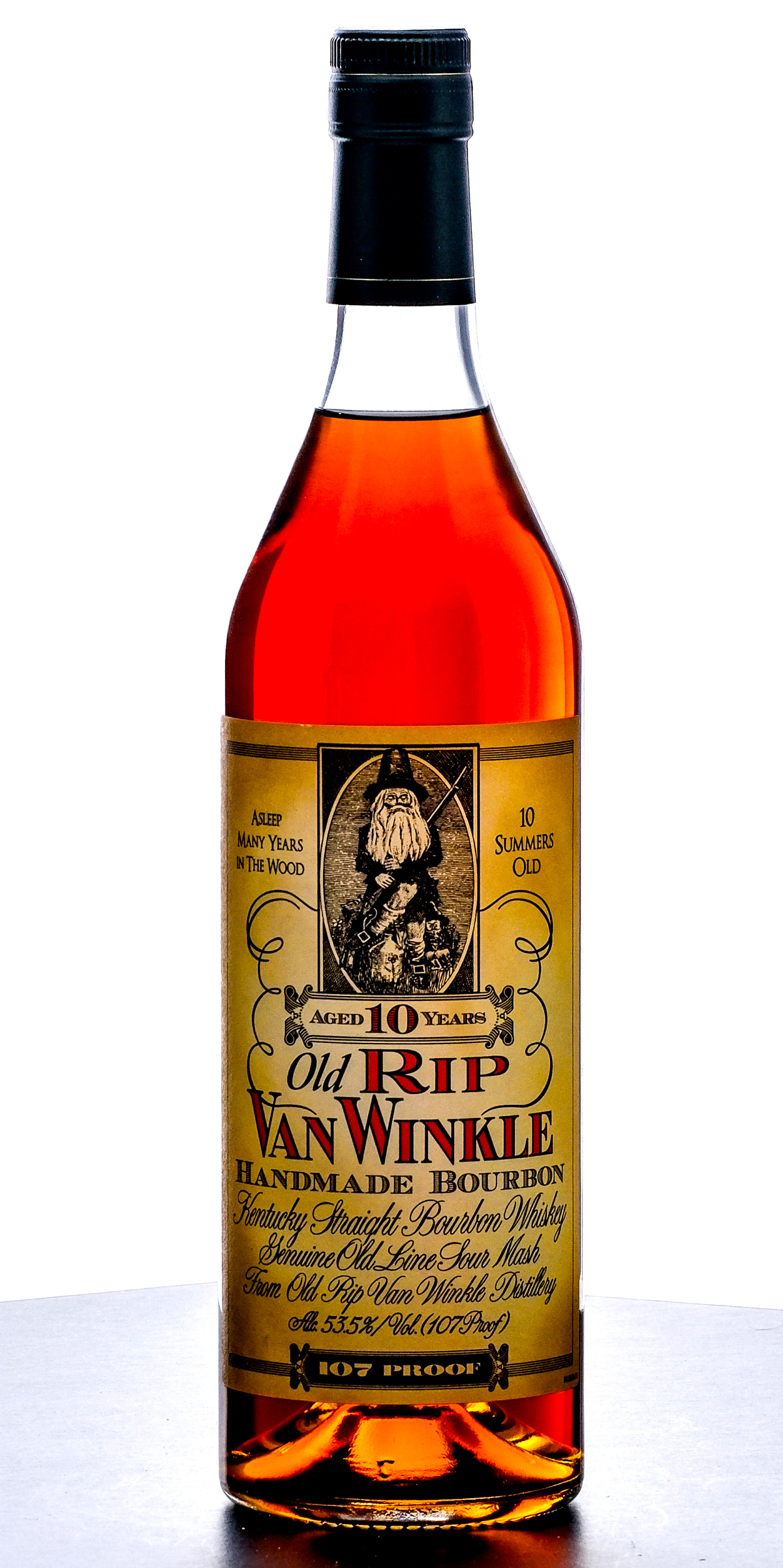 Old Rip Van Winkle 10 Year Kentucky Straight Bourbon Whiskey. Possibly 2013 (laser code misprinted so it is difficult to discern). 53.5% ALC/VOL (107 Proof). Foil seal very good (some loss in the hot foil stamp finish but seal is intact). Printed labels excellent. 750ml. Distilled and bottled by Old Rip Van Winkle Distillery.
