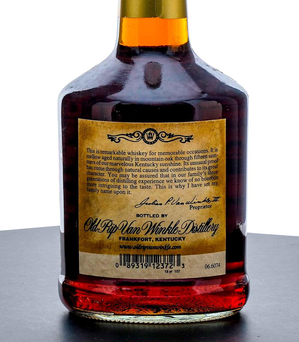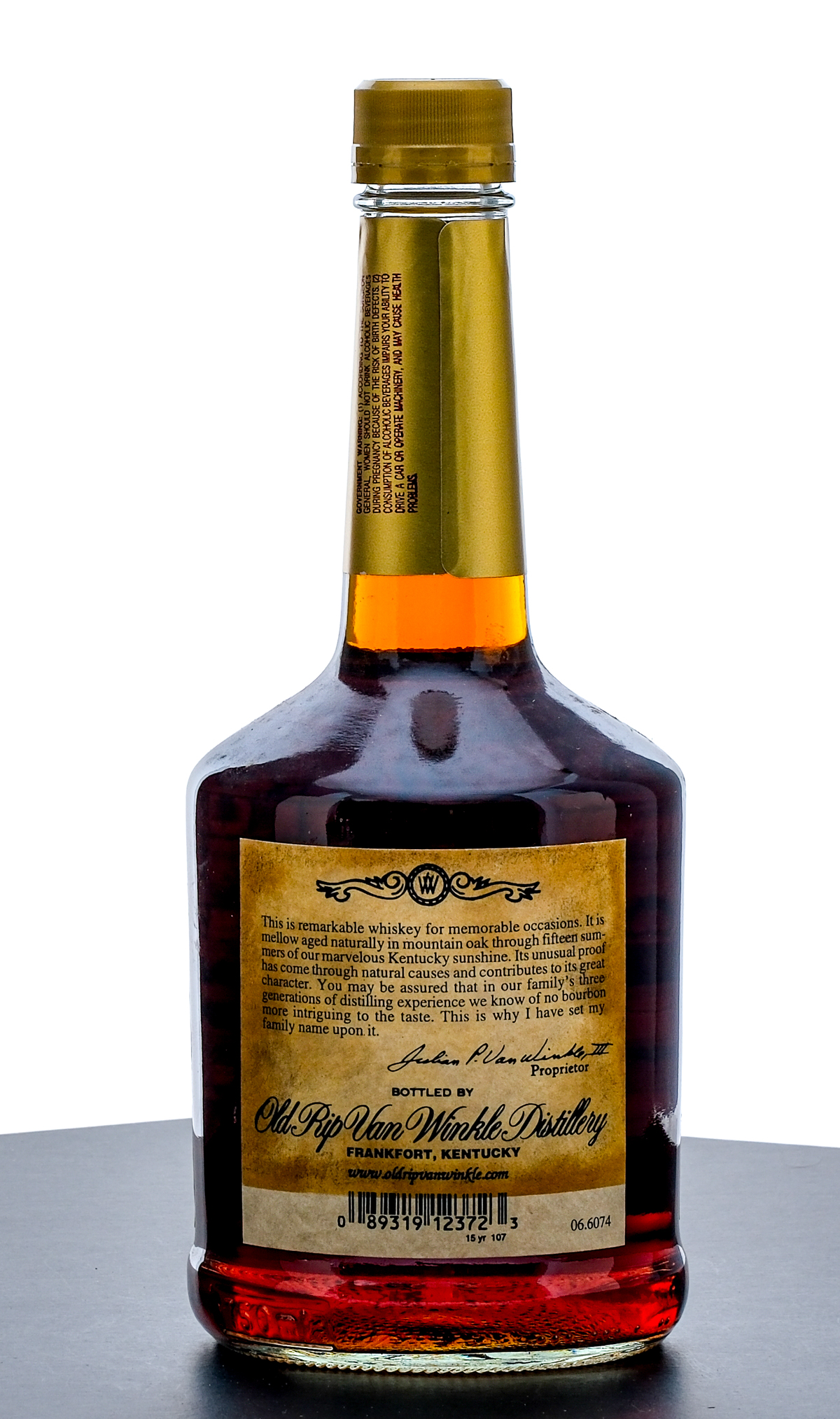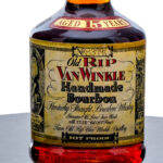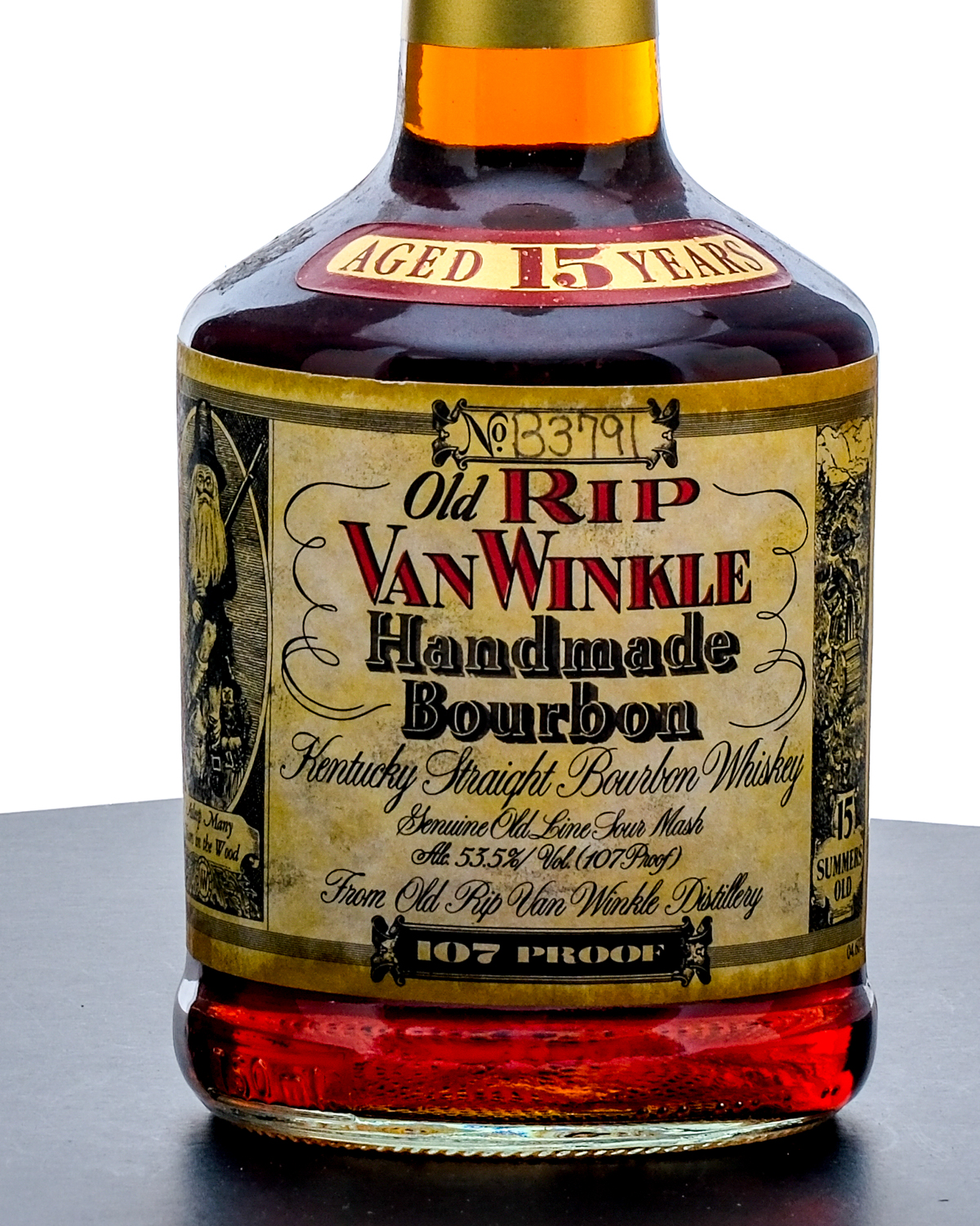 From The Collection of Michael Aronoff: Old Rip Van Winkle 15 Year Handmade Kentucky Straight Bourbon Whiskey. No. B3791. Circa 2002/2003 (based on Frankfort, KY bottling location and the Old Rip 15 “Squat” line being discontinued in 2004; replaced by Pappy Van Winkle 15 Year). Believed to be 2002 based on “02” molded in glass on bottom of bottle. Genuine old line Sour Mash. 55.5% ALC/VOL (107 Proof). Screw top seal intact. Printed labels good (exhibiting losses in finish and nicks throughout). 750ml. Bottled by Old Rip Van Winkle Distillery.