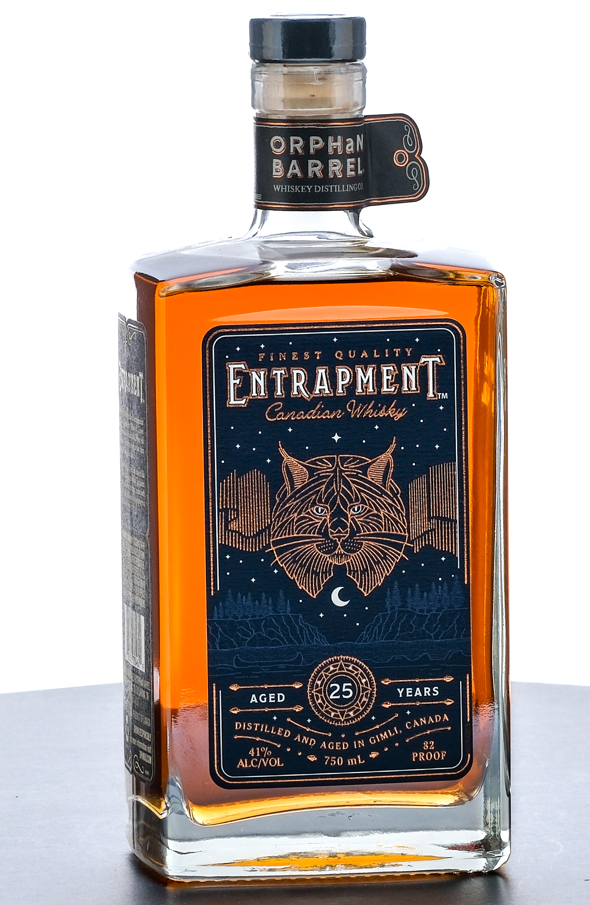 Orphan Barrel Entrapment 25 Year Canadian Whiskey (2017). Entrapped in weathered Oak barrels inside the Gimli Distillery, home of Crown Royal Canadian Whisky. Bottle No. 5474. 41% ALC/VOL (82 Proof). Plastic seal intact. Printed labels excellent. 750ml. Product of Canada. Imported and bottled by Orphan Barrel Whiskey Distilling Co. (Tullahoma, TN).