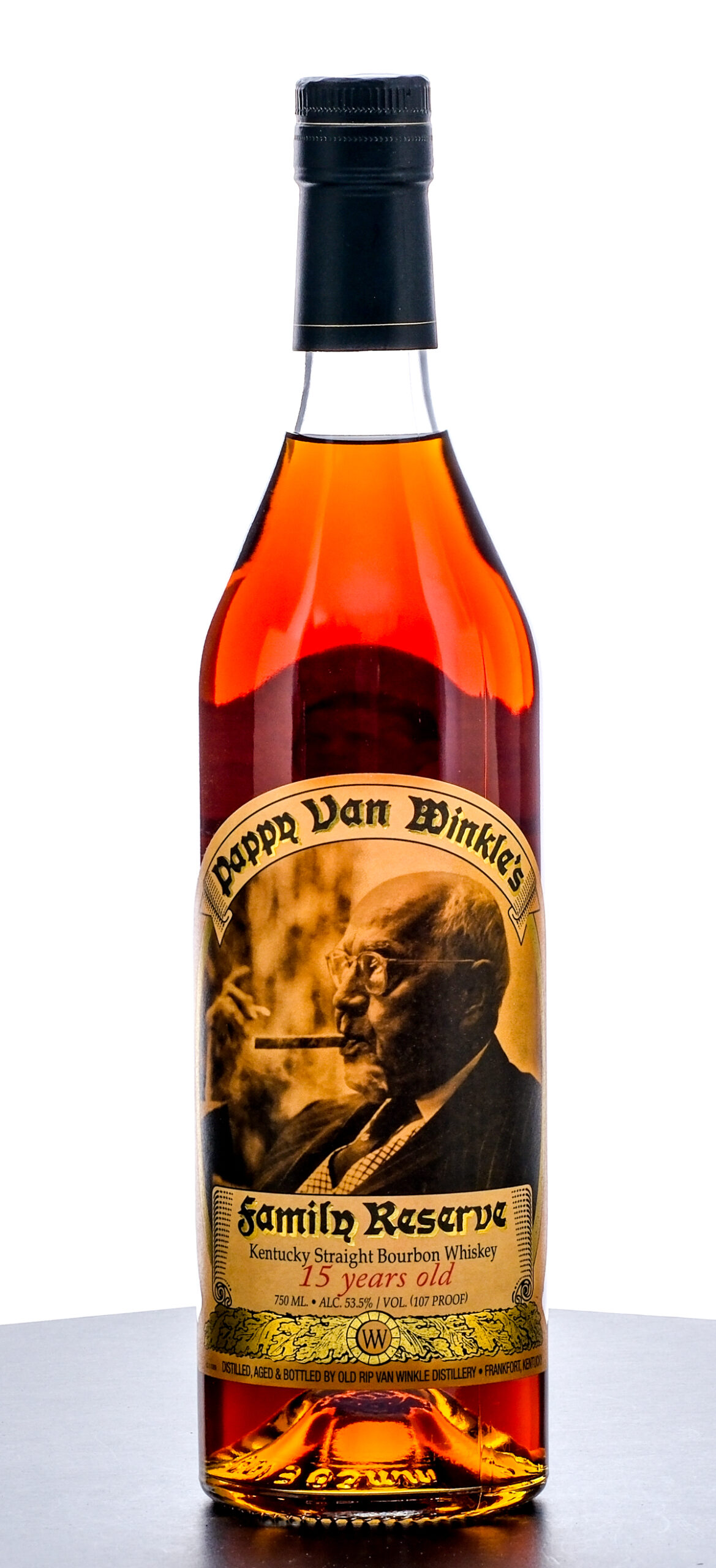Pappy Van Winkle’s 15 Year Family Reserve Kentucky Straight Bourbon Whiskey (2022). Laser code: L22238 01 20:15D. 53.5% ALC/VOL (107 Proof). Foil seal very good (exhibiting some minor nicks). Printed labels excellent. 750ml. Distilled, aged & bottled by Old Rip Van Winkle Distillery.