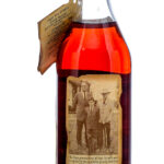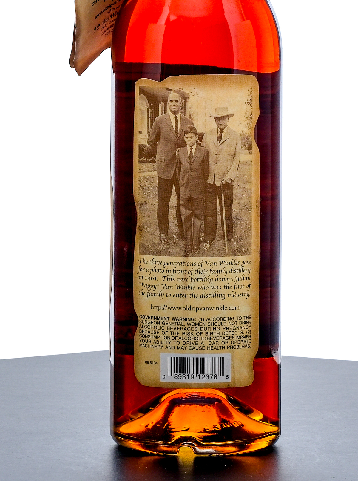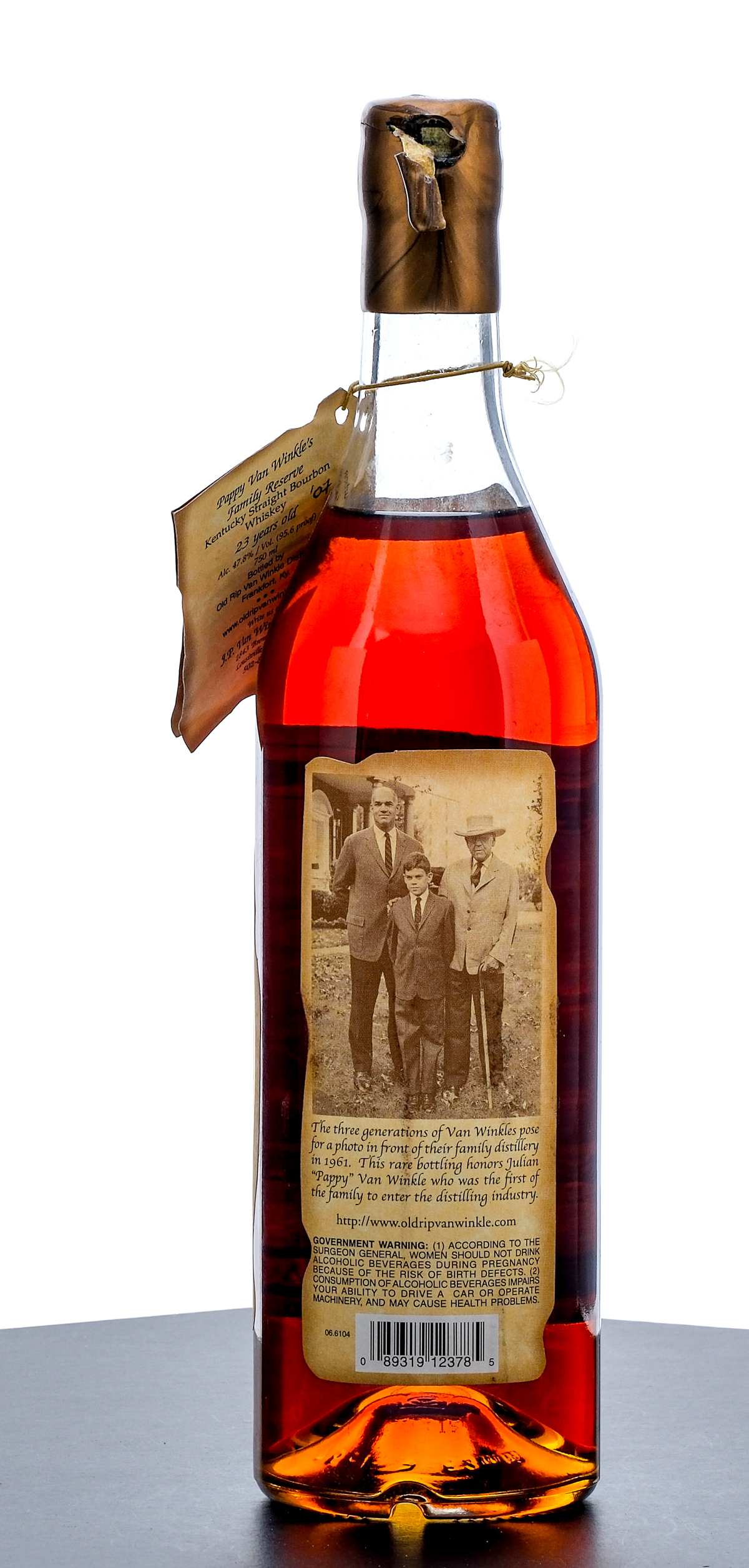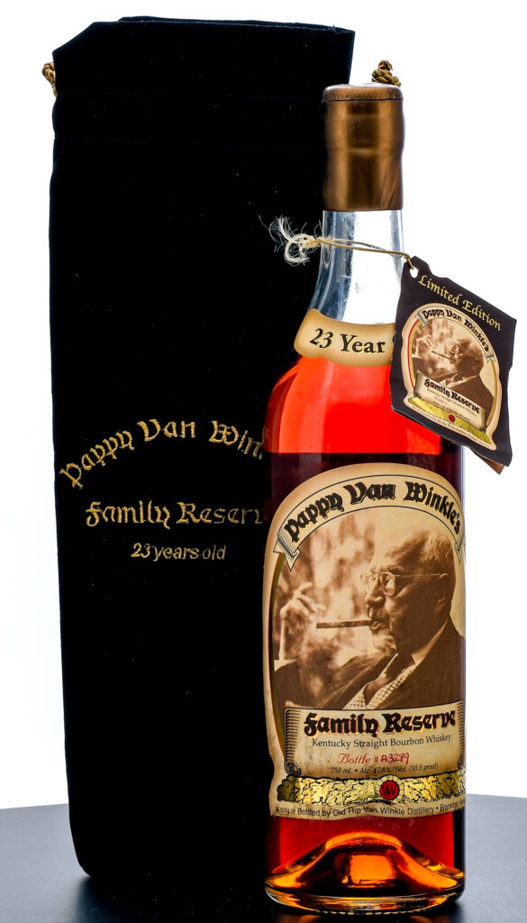From The Collection of Michael Aronoff: Pappy Van Winkle’s 23 Year Family Reserve Kentucky Straight Bourbon Whiskey. 2002 – 2005 (based on Frankfort bottling location and the wax seal and letter “A” preceding the Bottle #, both of which were discontinued in ’05). Limited Edition. Bottle # A3289. 47.8% ALC/VOL (95.6 Proof). Wax seal fair (exhibiting a hairline fracture around the circumference of the cap and some moderate loss around the pull tab portion). Printed labels good (both exhibit some staining and the bottom of the front facing label exhibits some wrinkling from being forced upward). Included embroidered drawstring bag in excellent condition. 750ml. Bottled by Old Rip Van Winkle Distillery.