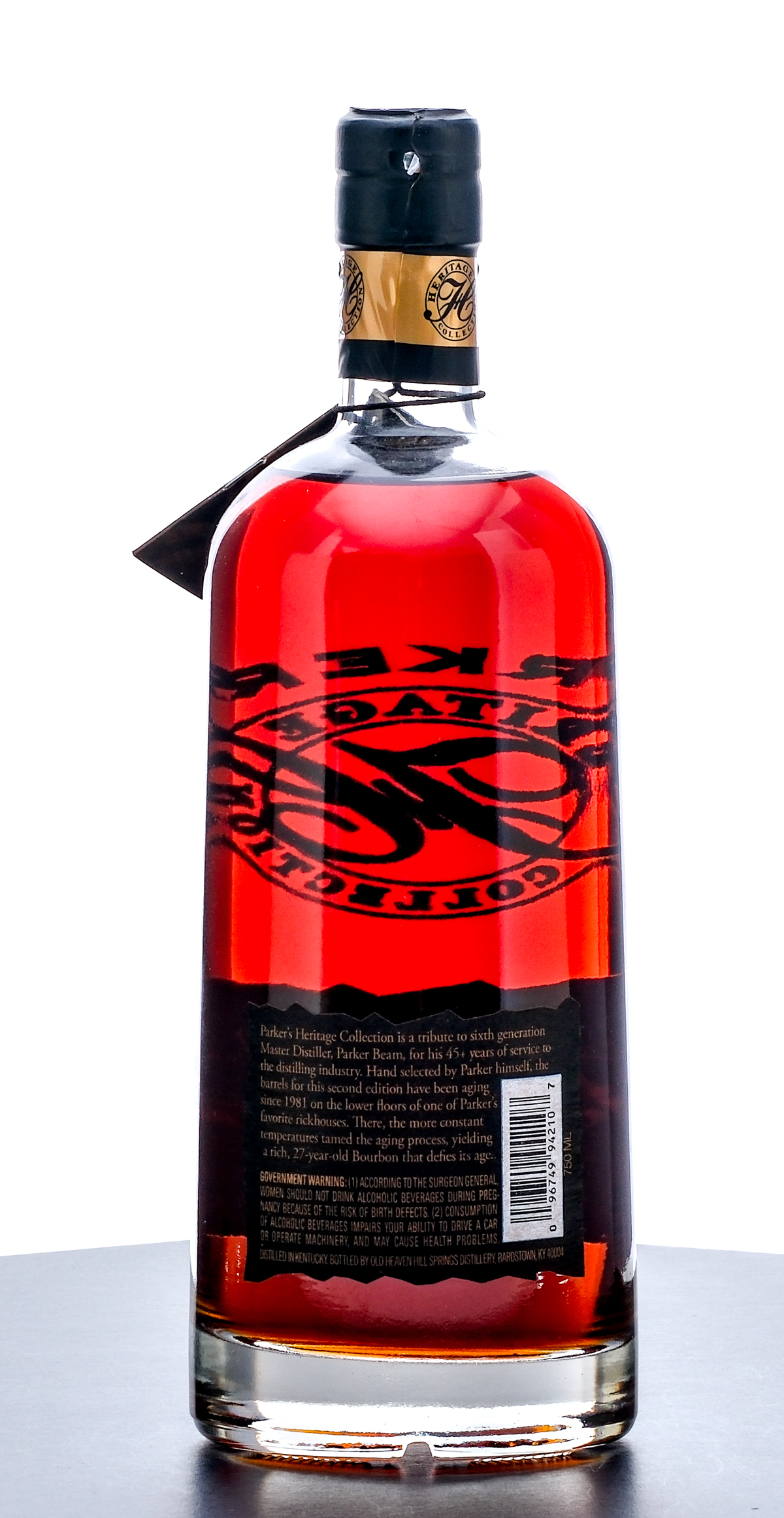 From The Collection of Michael Aronoff: Parker’s Heritage Second Edition 27 Year Kentucky Straight Bourbon Whiskey (2008). 48% ALC/VOL (96 Proof.) Foil seal excellent. Hang tag intact. Printed labels excellent. 750ml. Distilled and bottled by Old Heaven Hill Springs Distillery.