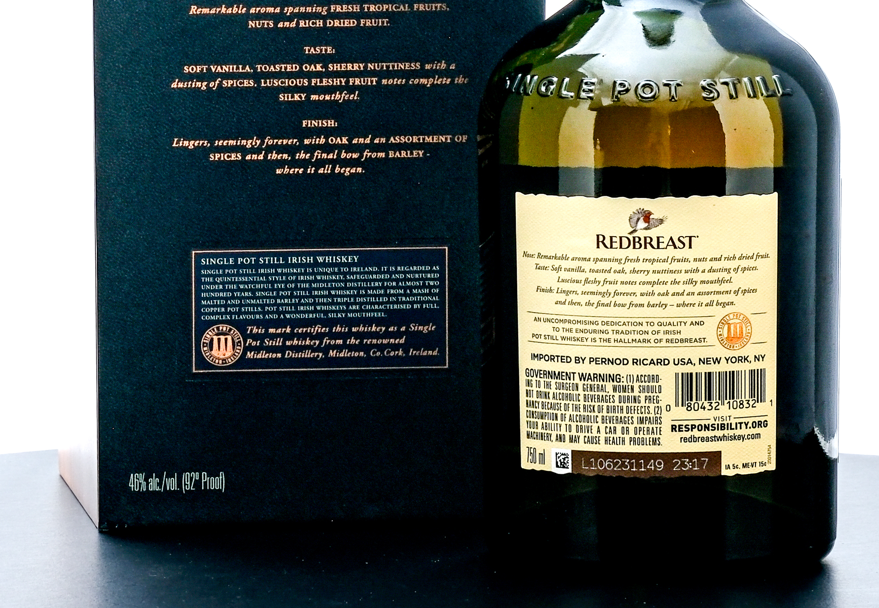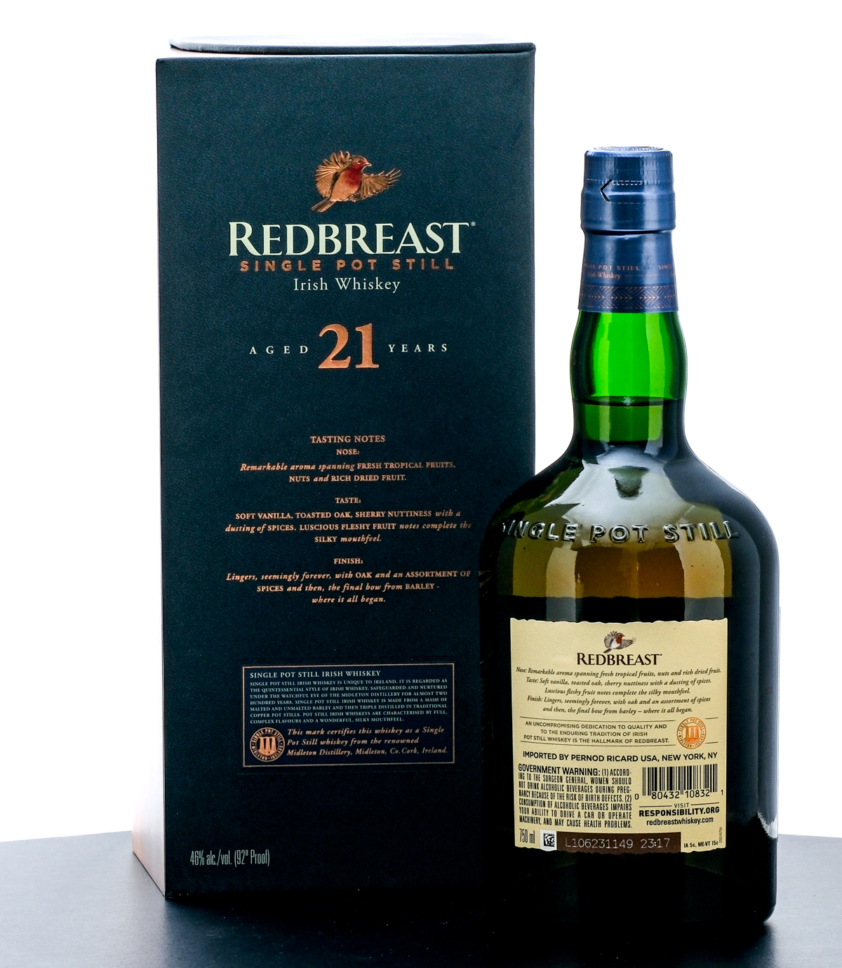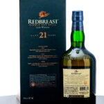 Redbreast 21 Year Single Pot Still Irish Whiskey (2021). Triple distilled & matured in the finest Oak casks. 46% ALC/VOL (92 Proof). Wood and cardboard presentation box excellent. Foil seal on bottle excellent. Printed labels likewise excellent. 750ml. Distilled, matured & Bottled in Bond by Irish Distillers. Imported by Pernod Ricard USA (New York, NY).