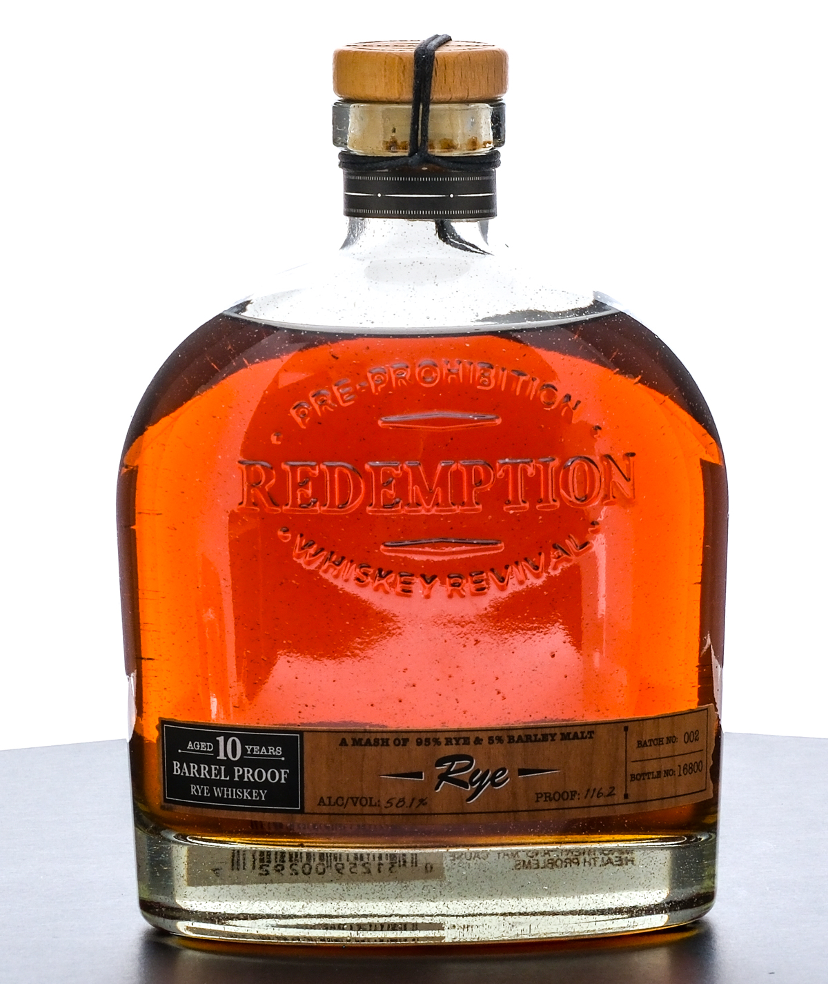 Redemption Pre-Prohibition Revival 10 Year Rye Whiskey. A Mash of 95% Rye & 5% Barley Malt. (2017). Batch No. 002. Bottle No. 16800. 58.1% ALC/VOL (116.2 Proof). String seal excellent. Laser and printed labels excellent. 750ml. Distilled in the Indiana Heartland. Bottled by Bardstown Barrel Selections.