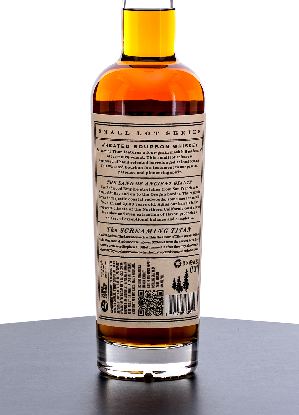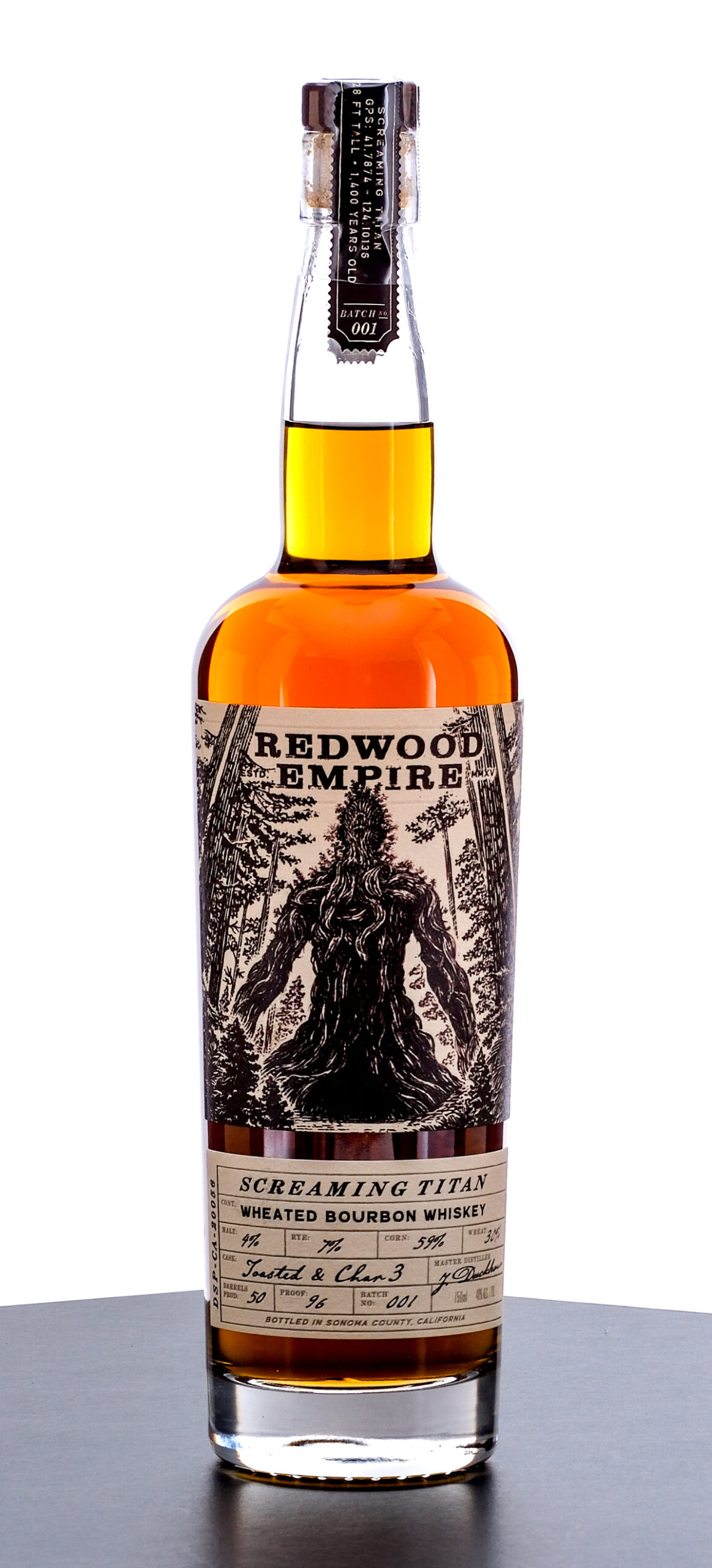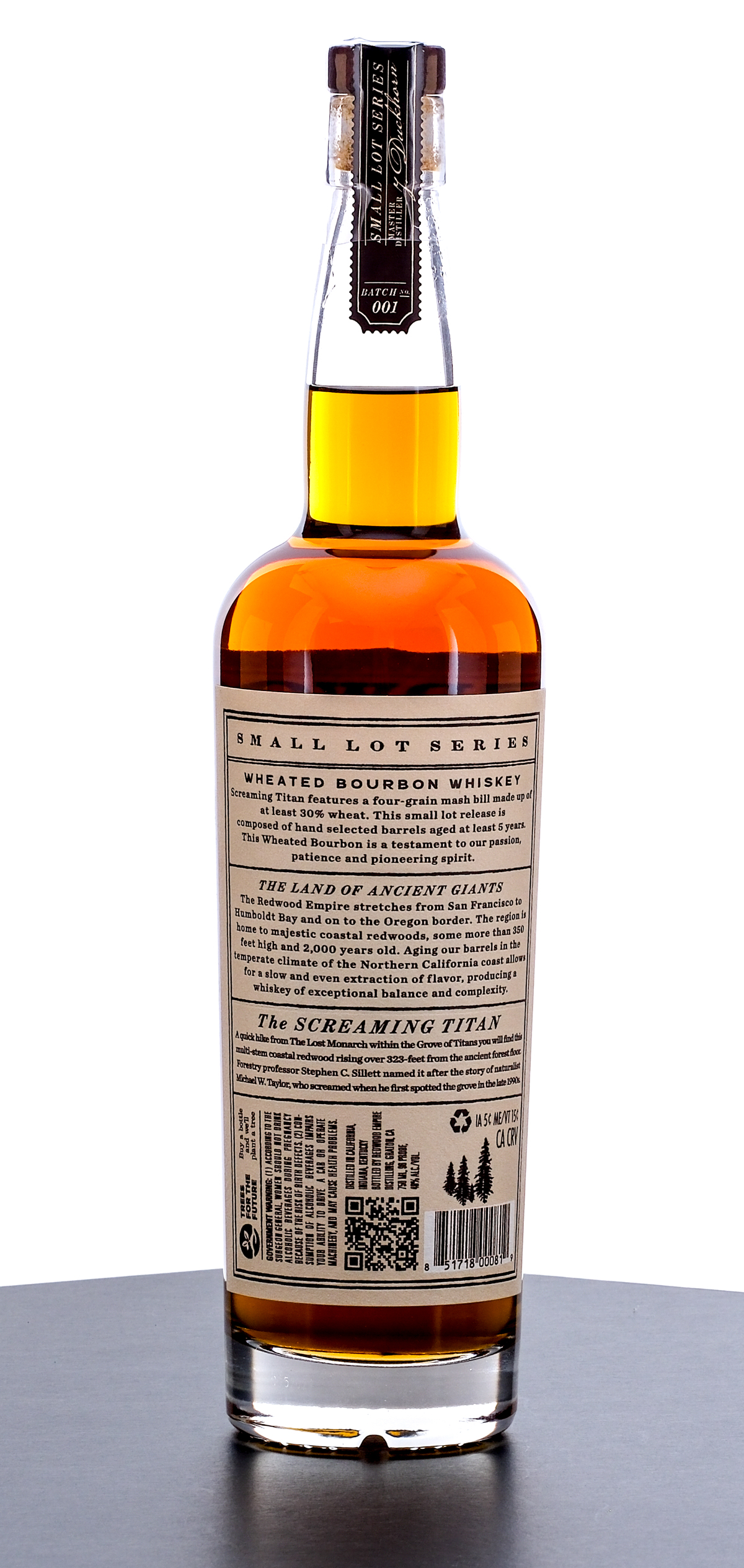 Redwood Empire Screaming Titan Wheated Bourbon Whiskey 2024. Batch No. 001. Small Lot Series.50 Barrels Produced. “Aged at least 5 years” Mash bill: Malt 4%, Rye 7%, Corn 59%, and Wheat 30% Cask: Toasted & Char 3. 48% ALC/VOL (96 Proof). Plastic and stamp seal intact. Printed Labels excellent. 750ml. Distilled in CA, IN, KY. Bottled by Redwood Empire Distilling. (Graton CA)