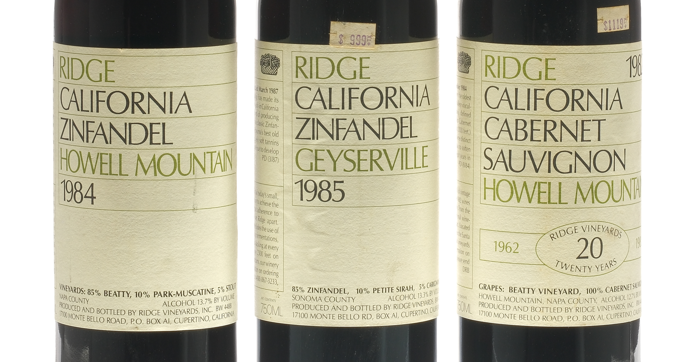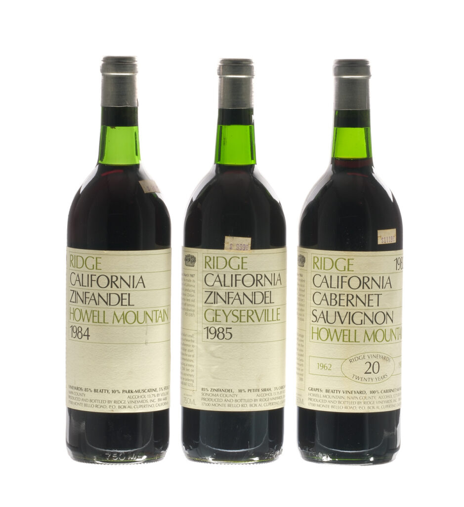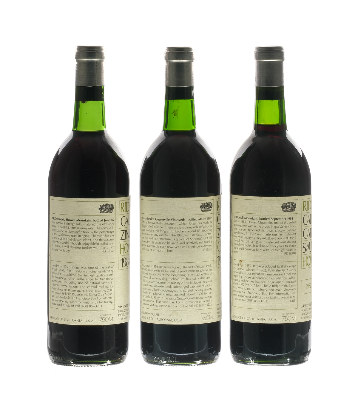 1982 cab sauv Howell Mountain. Level just above Base neck. 1984 zinfandel Howell Mountain level at Base Neck. 1985 zinfandel Geyserville at Base Neck. Labels excellent. Wine California Ridge USA California Red blend 1982,84,85 3 750ml