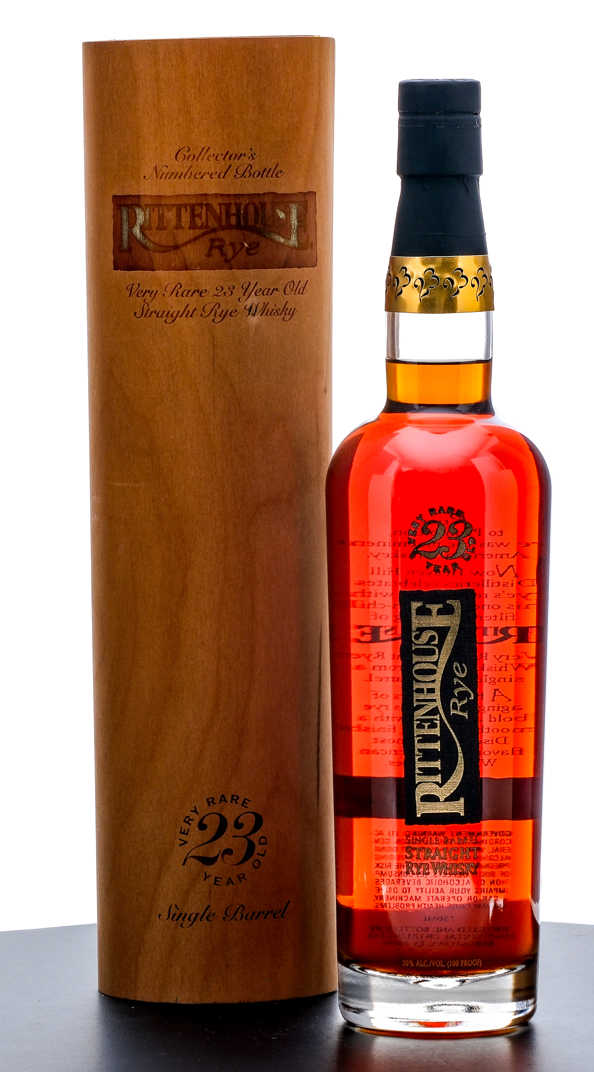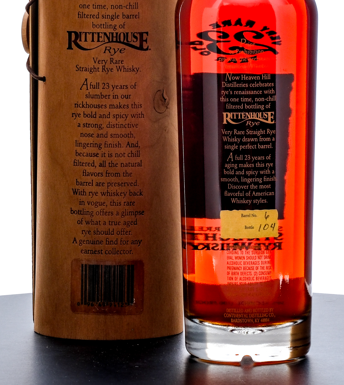 From The Collection of Michael Aronoff: Rittenhouse 23 Year Old Very Rare Single Barrel Straight Rye Whiskey. Originally distilled in 1984, the resulting 100 barrels (stored in the lowest levels of the Heaven Hill facilities to mitigate changes in environment) of Rye were bottled three separate times between 2005 and 2010; at 21 years, at 23 years and, finally, at 25 years old. Barrel No. 6. Bottle 104. 50% ALC/VOL (100 Proof). Wooden tube is in fair condition (its chief detriment being the circular piece of wood that the chord latches around is cracked, with a piece missing). Foil seal on bottle excellent. Screened and printed labels very good (though exhibiting minor losses). 750ml. Distilled and bottled by Continental Distilling Co. (Bardstown, KY).