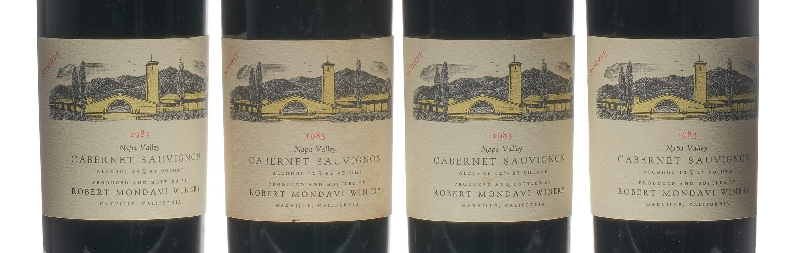 Reserve. Fill Level = Base Neck/Top Shoulder. Foil and label good to very good. Foil degraded on two bottles. Wine California Napa Valley Robert Mondavi Winery USA Napa Valley Cabernet Sauvignon 1983 4 750ml