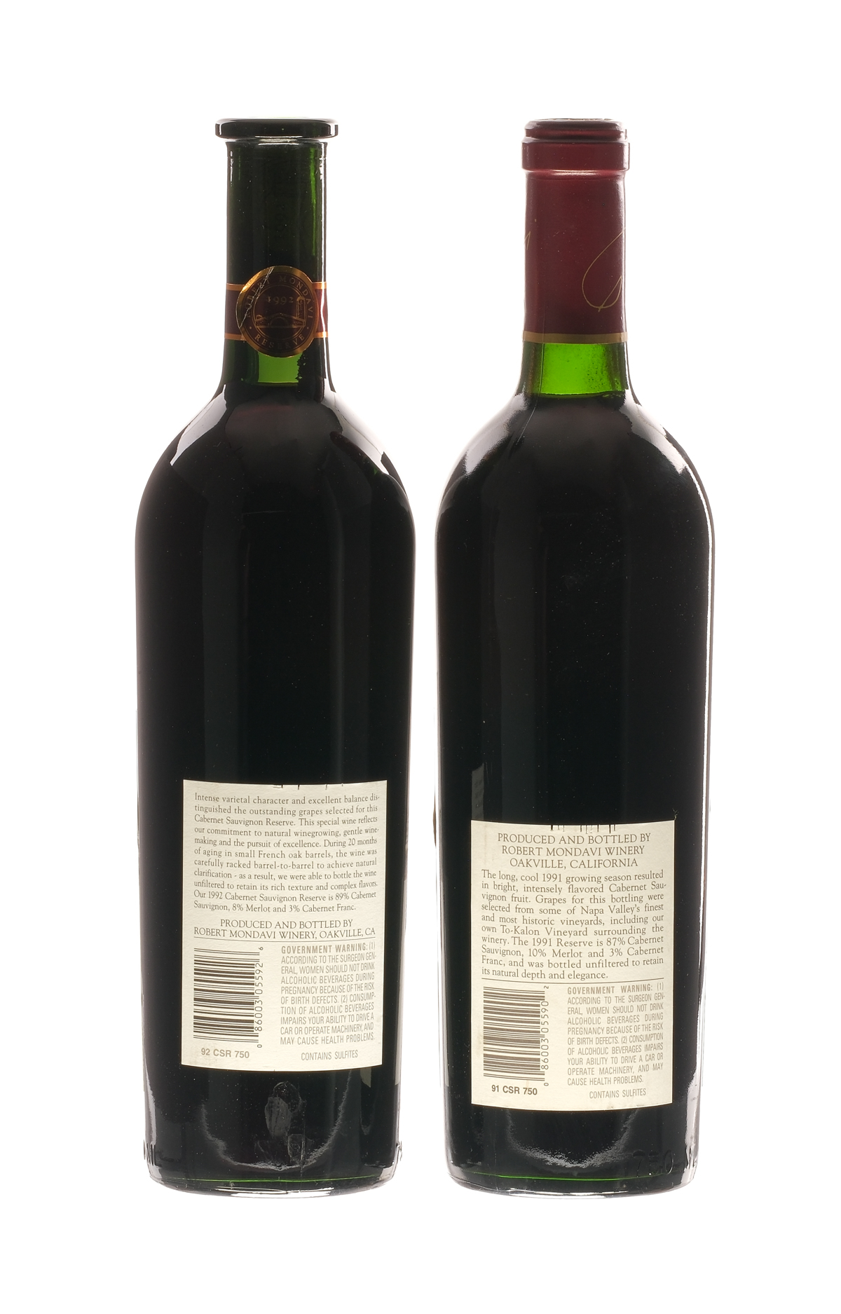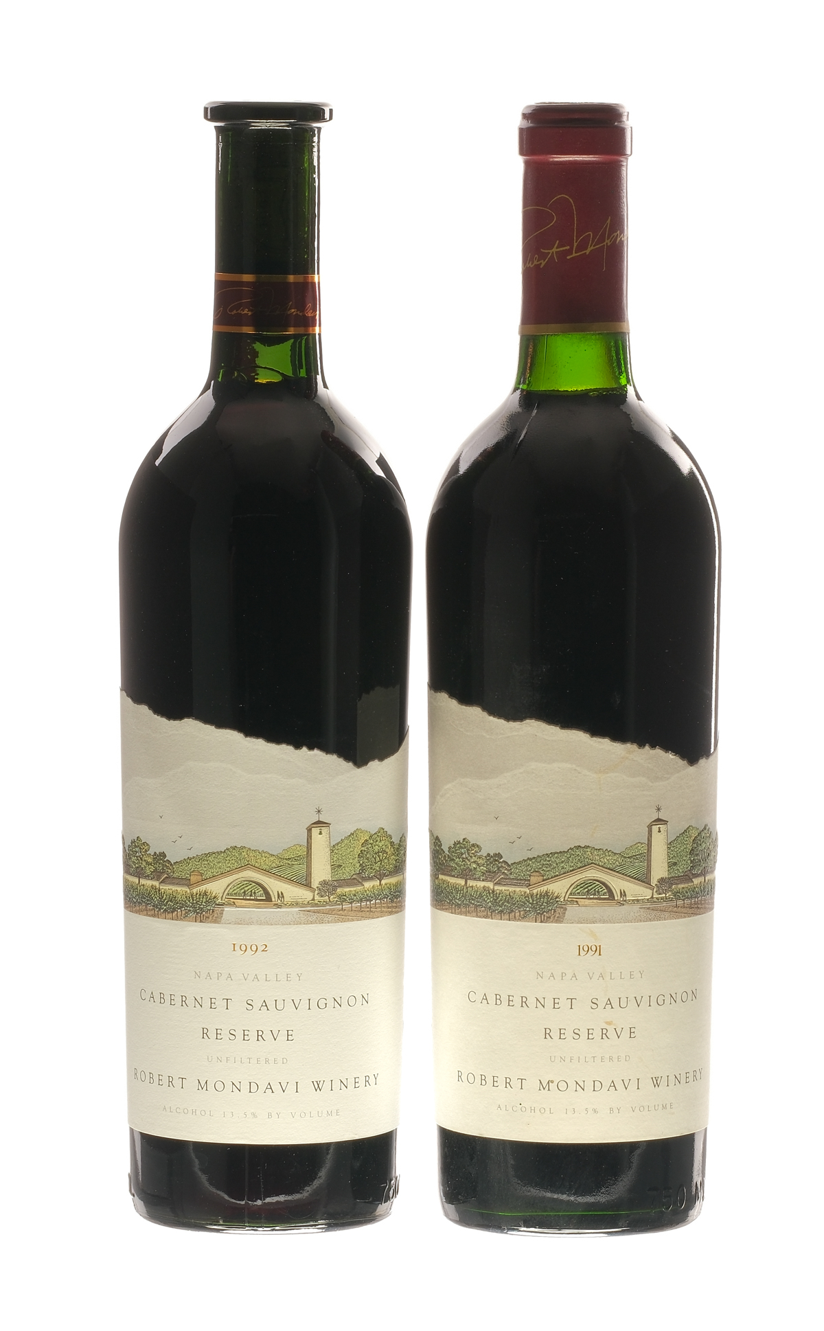 Reserve, unfiltered, some staining on label. Foil loose. 91 Fill Level = Top Shoulder. 92 Fill Level = Base Neck. Wine California Napa Valley Robert Mondavi Winery USA Napa Valley Cabernet Sauvignon 1991, 92 2 750ml