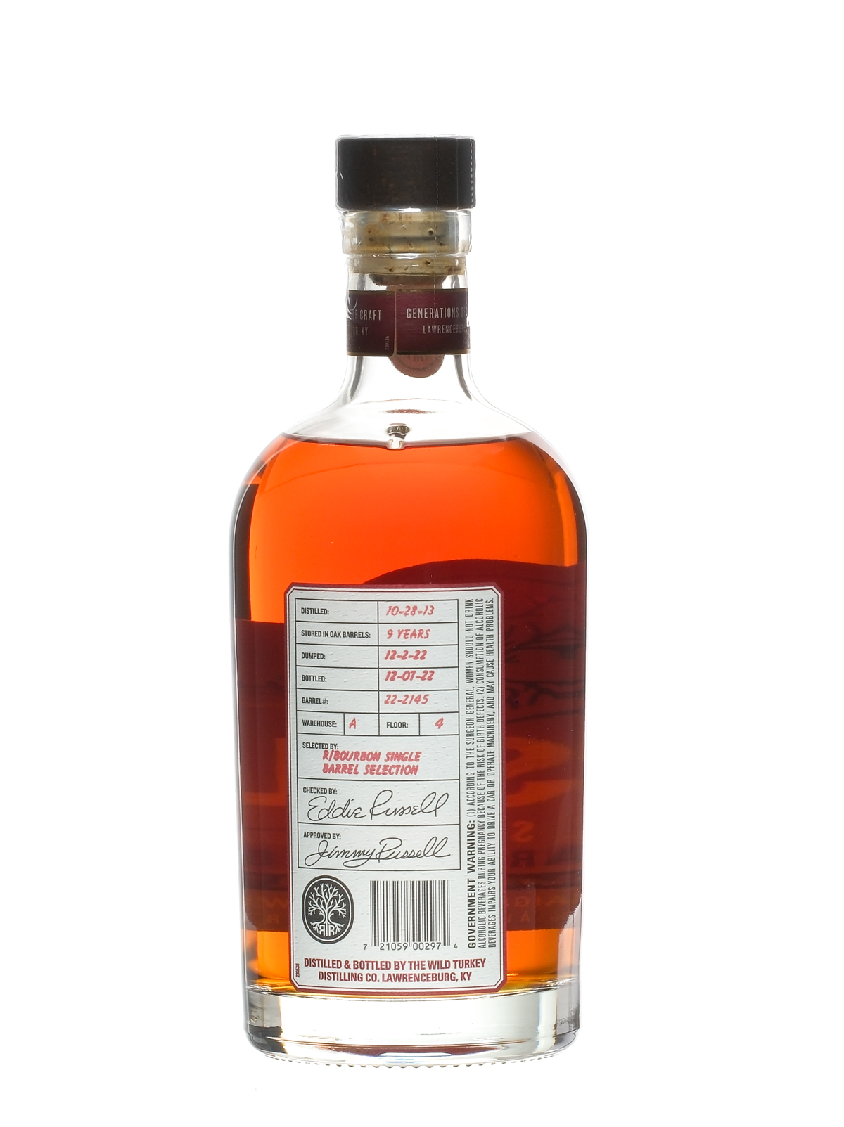 Selected by R/Bourbon Single Barrel Selection. Warehouse A. Floor 4. Oak barrel # 22-2145. Distilled 10-28-13. Dumped 12-2-22. Bottled 12-07-22. 55% ALC/VOL. 110 Proof. Plastic wrap intact. Labels excellent. Whiskey Bourbon Wild Turkey USA Kentucky 2023 9 Years 1 750ml