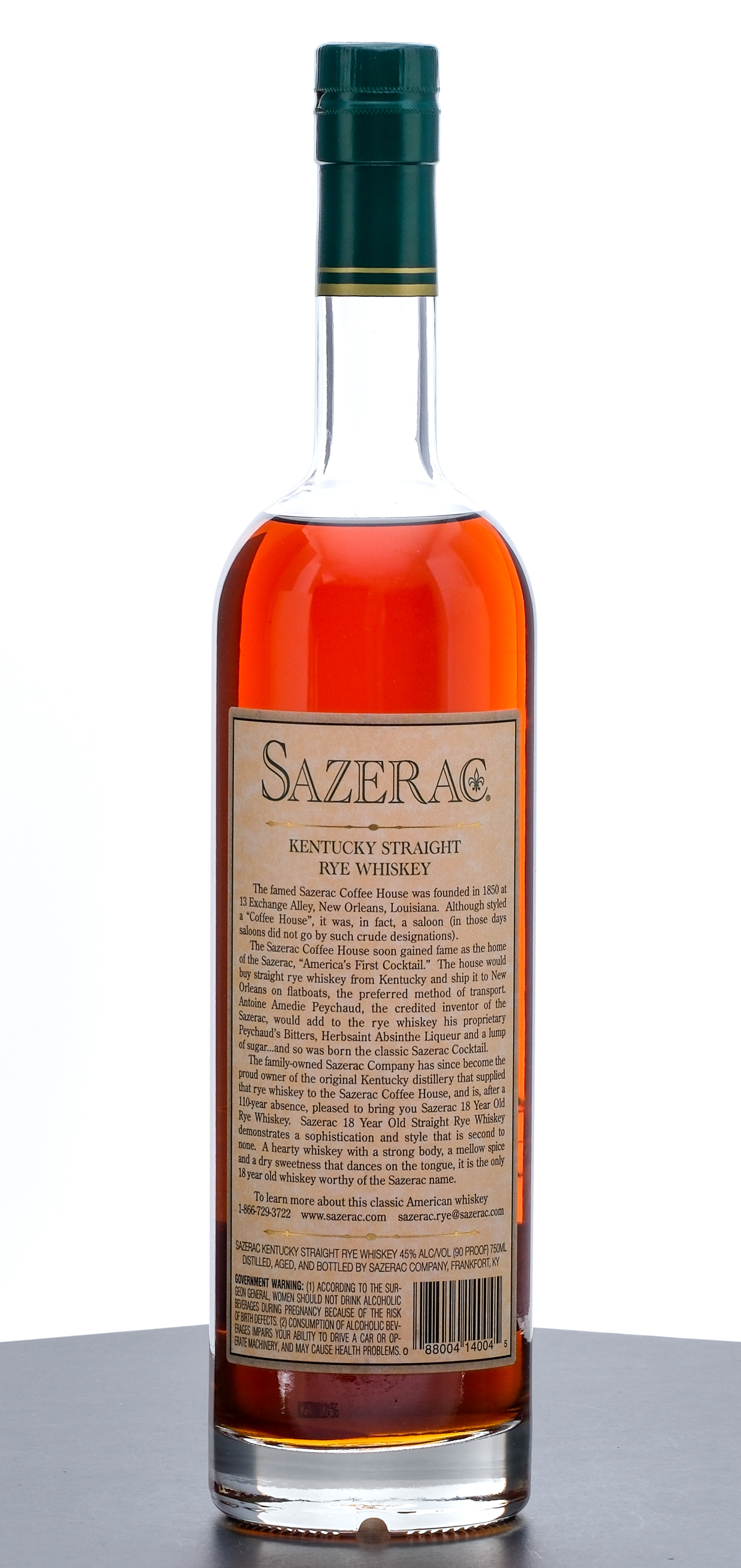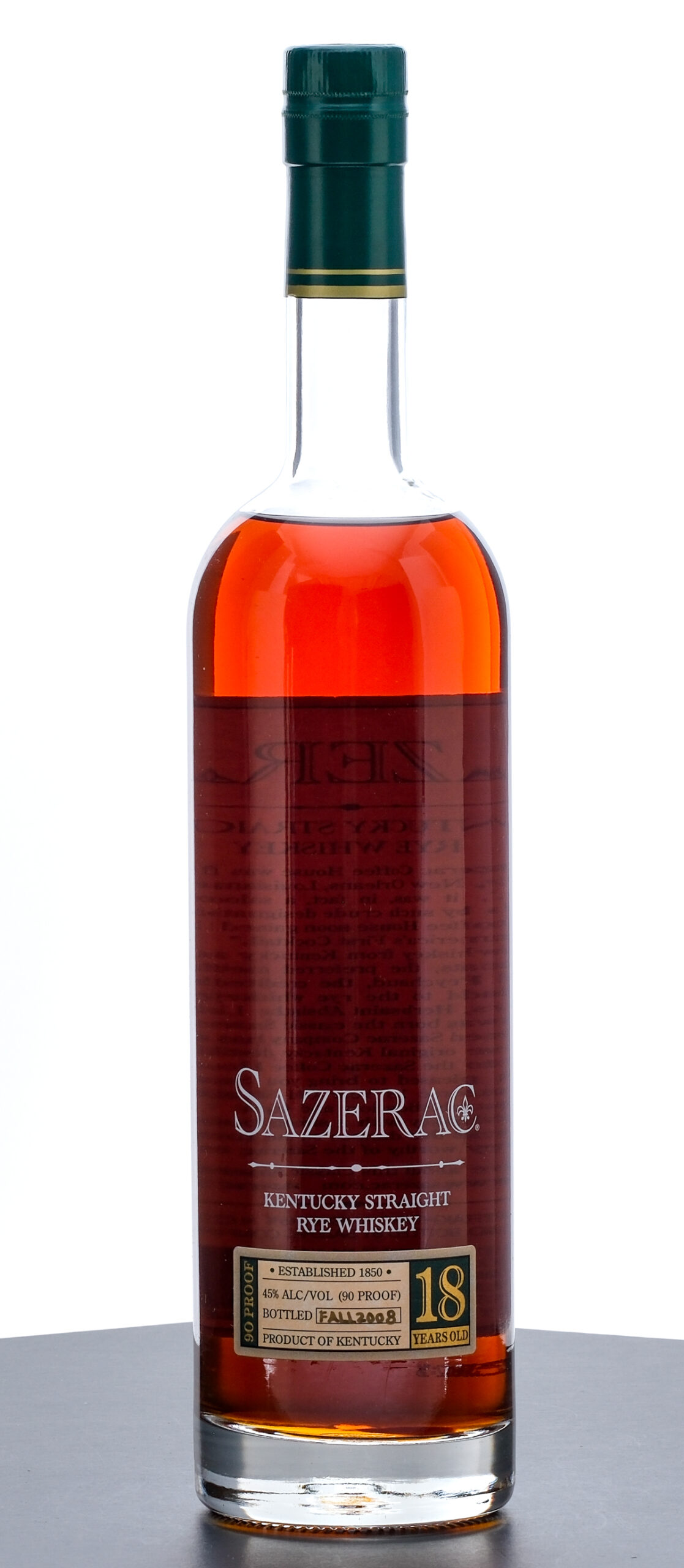 From The Collection of Michael Aronoff: Sazerac 18 Year Kentucky Straight Rye Whiskey. Bottled Fall 2008. 45% ALC/VOL (90 Proof.) Laser Code (characters crowded together) believed to read: K2530612:56. Foil seal excellent. Screened and printed labels likewise excellent. 750ml. Distilled, aged & bottled by Sazerac Company.