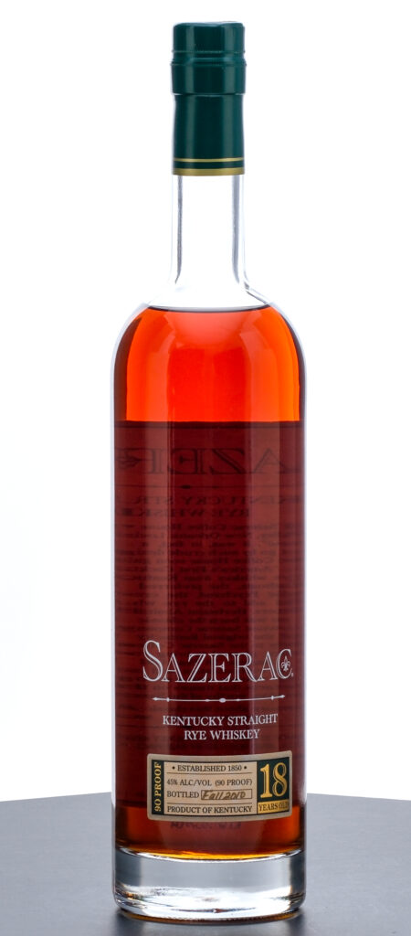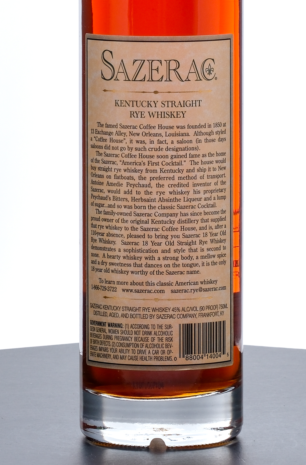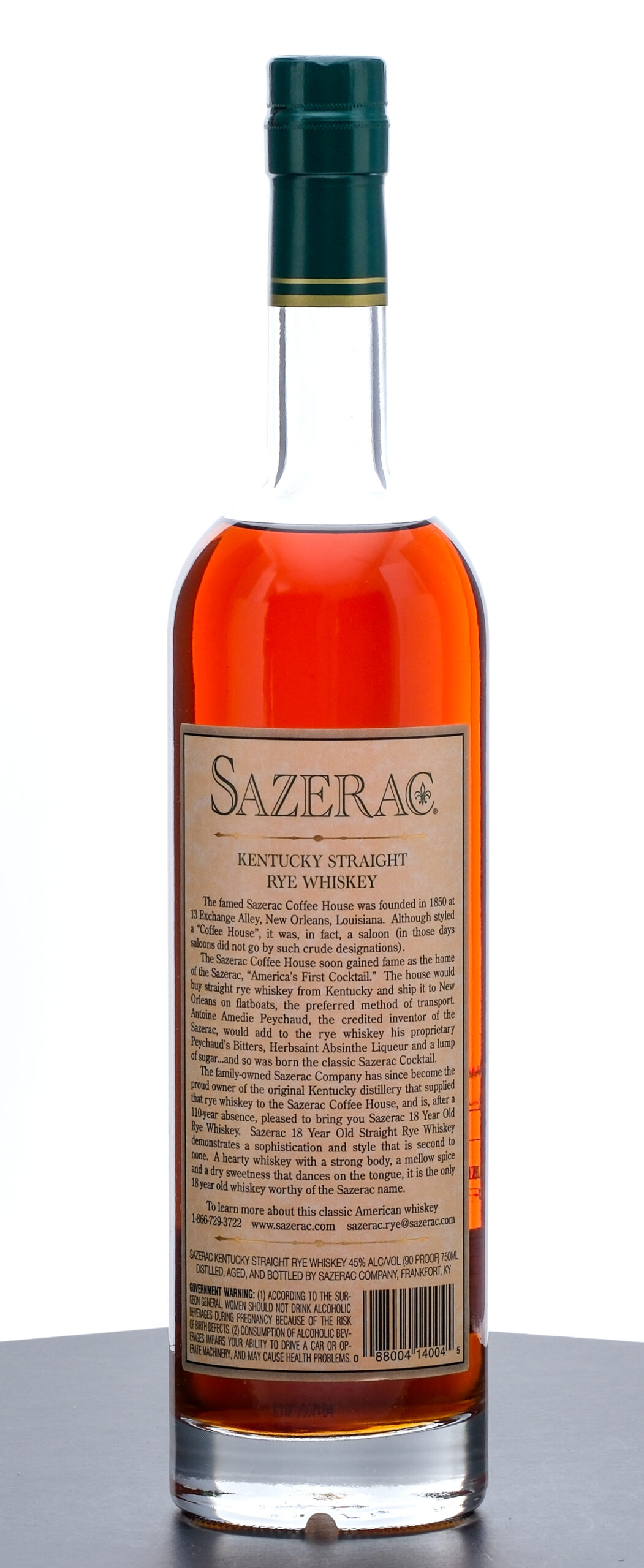From The Collection of Michael Aronoff: Sazerac 18 Year Kentucky Straight Rye Whiskey. Bottled Fall 2010. 45% ALC/VOL (90 Proof.) Laser Code: K1801007:04. Foil seal excellent. Screened and printed labels likewise excellent. 750ml. Distilled, aged & bottled by Sazerac Company.