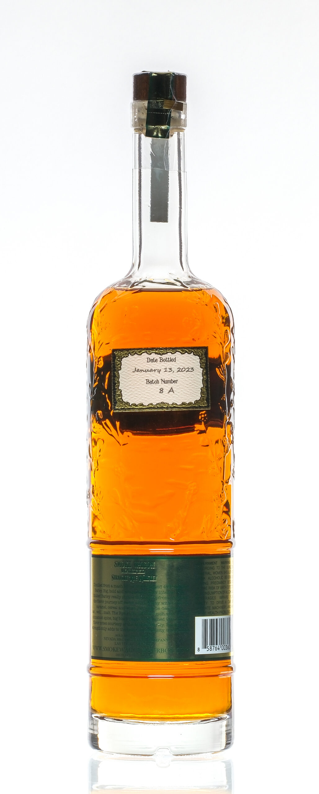 Date Bottled: January 13, 2023. Batch Number: 8A. 58.15% ALC/VOL. Wax stamp intact. Plastic seal intact. Labels largely excellent (the bottling info label on the back is loosening however). Whiskey Rye Nevada H&C USA Indiana 2023 1 750ml