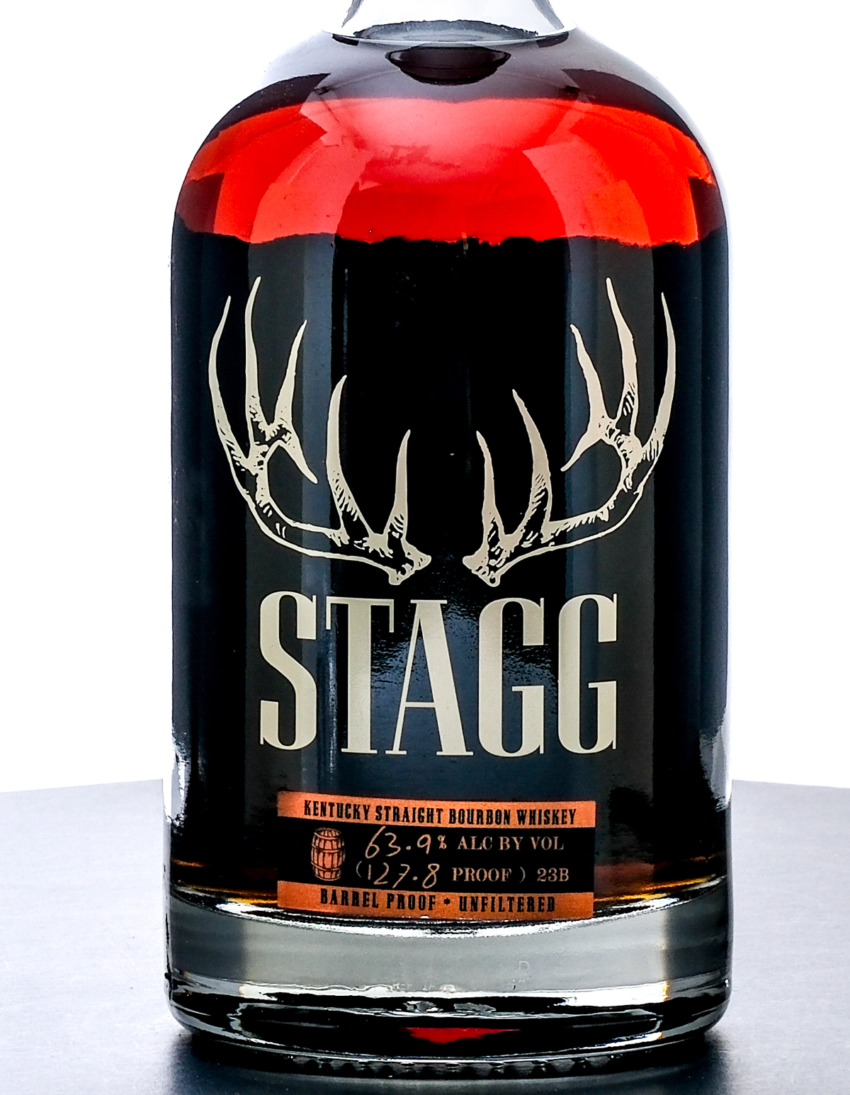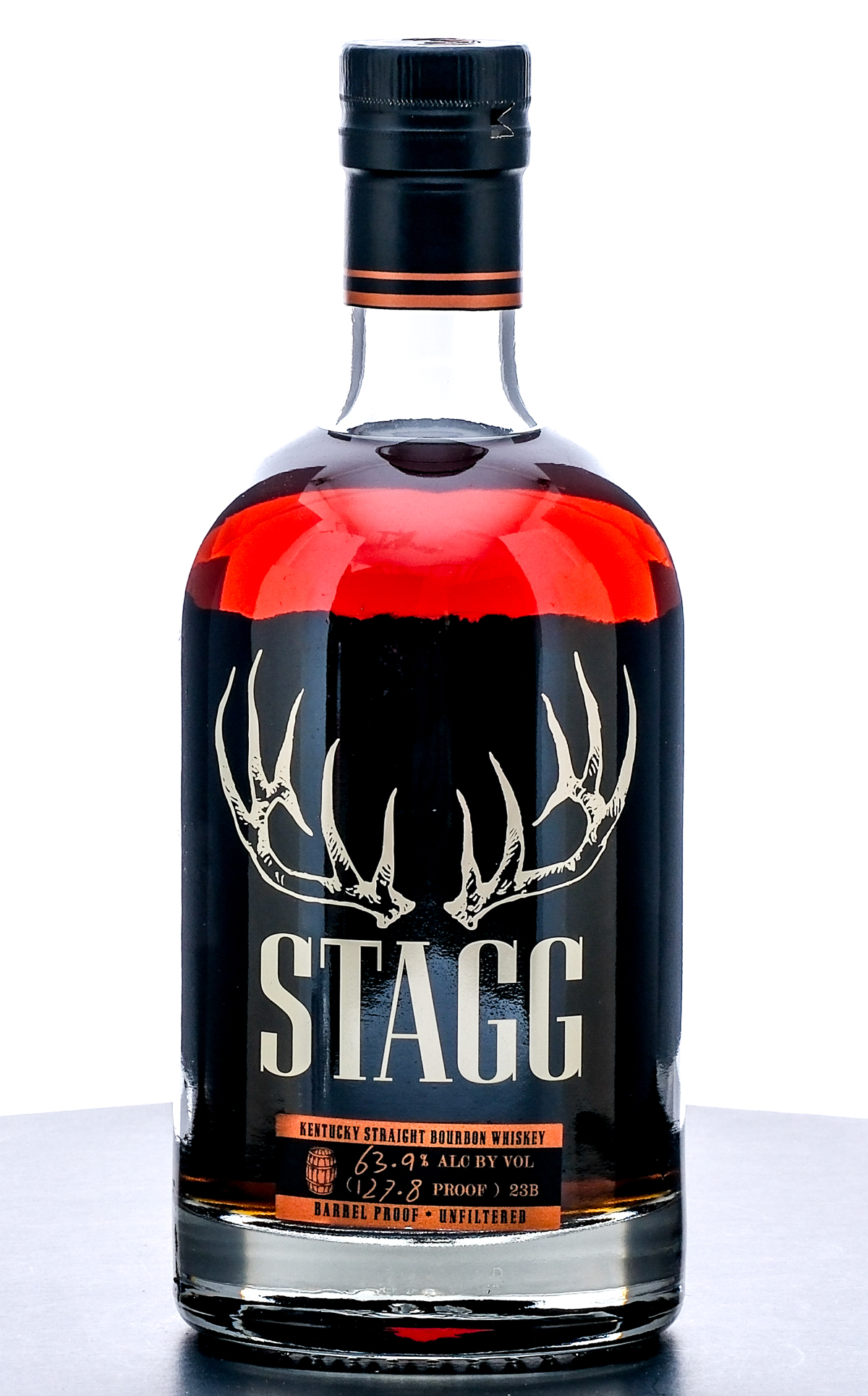 Stagg Kentucky Straight Bourbon Whiskey Barrel Proof-Unfiltered 23B (Fall, 2023). 63.9% ALC/VOL (127.8 Proof). Laser Code: L23066 01 07:42D. Foil seal excellent. Screened and Printed labels excellent. 750ml. Distilled, Aged & Bottled by Buffalo Trace Distillery Frankfort, KY.