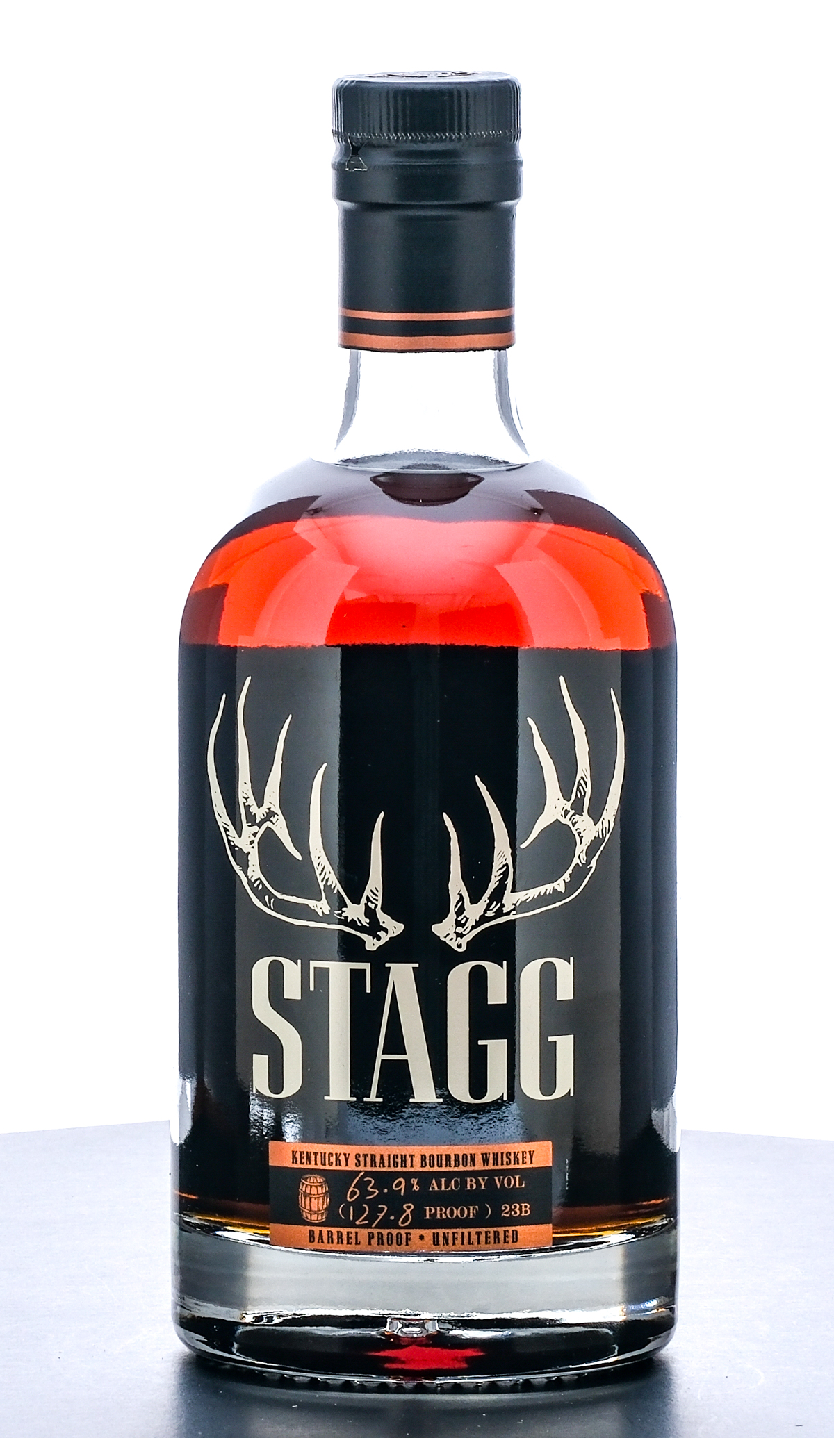 Stagg Kentucky Straight Bourbon Whiskey Barrel Proof-Unfiltered 23B (2023). 63.9% ALC/VOL (127.8 Proof). Laser Code: L23066 01 15:55D. Foil seal excellent. Laser and Printed labels excellent. 750ml. Distilled, Aged & Bottled by Buffalo Trace Distillery Frankfort, KY.