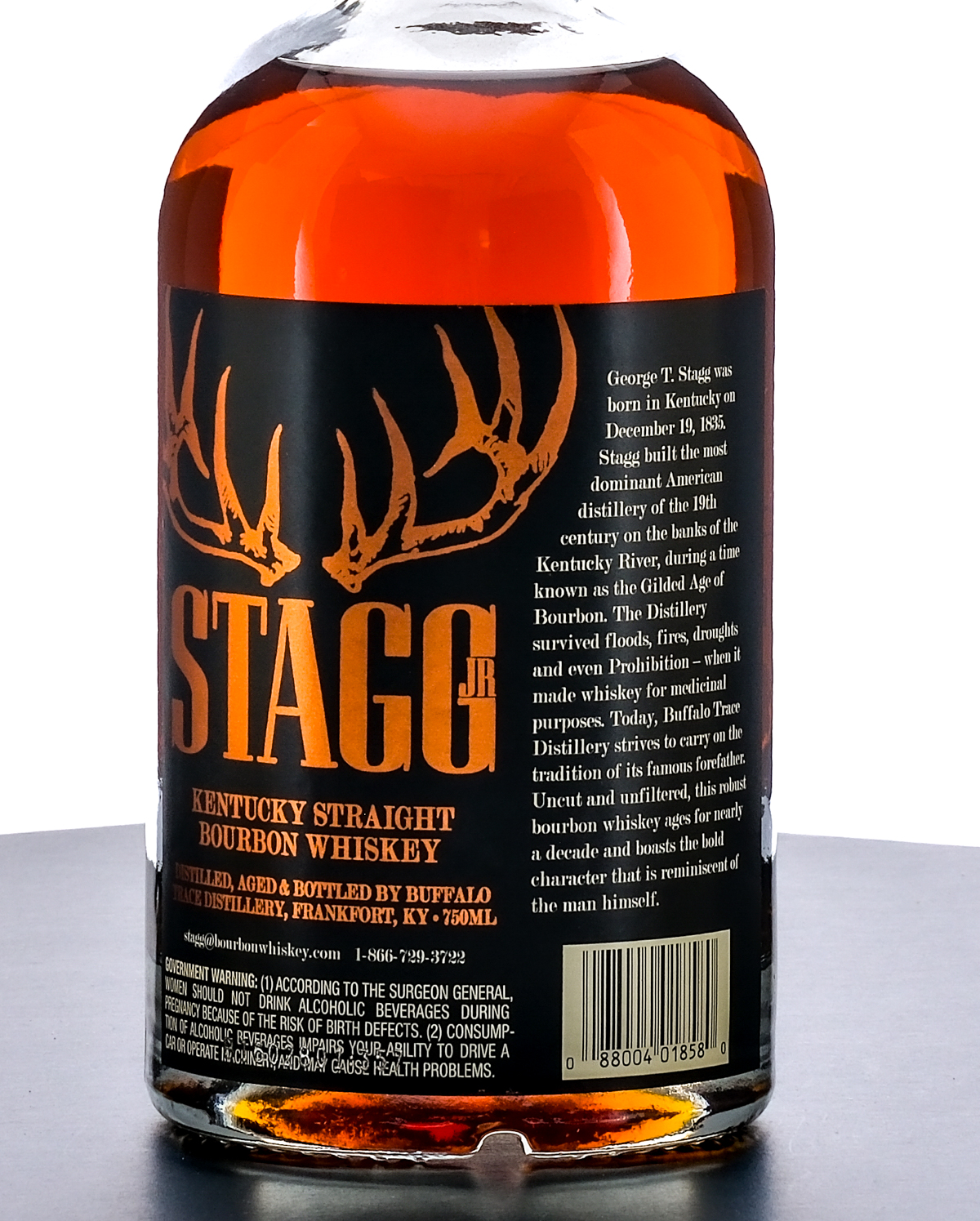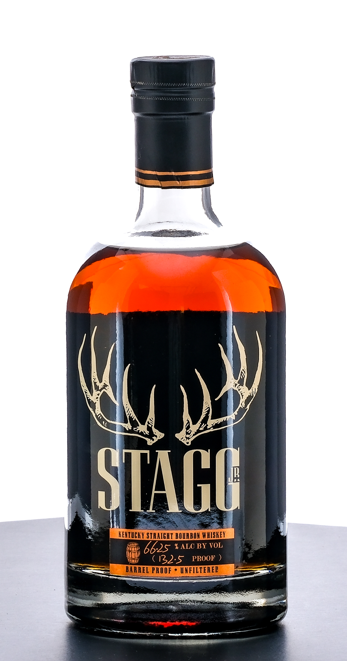 Stagg Jr. Barrel Proof Kentucky Straight Bourbon Whiskey (Spring 2016). Batch 6. Laser code unreadable (located beneath rear label). 66.25% ALC/VOL (132.5 Proof). Foil seal excellent. Screened and printed labels likewise excellent. 750ml. Distilled, aged & bottled by Buffalo Trace Distillery.