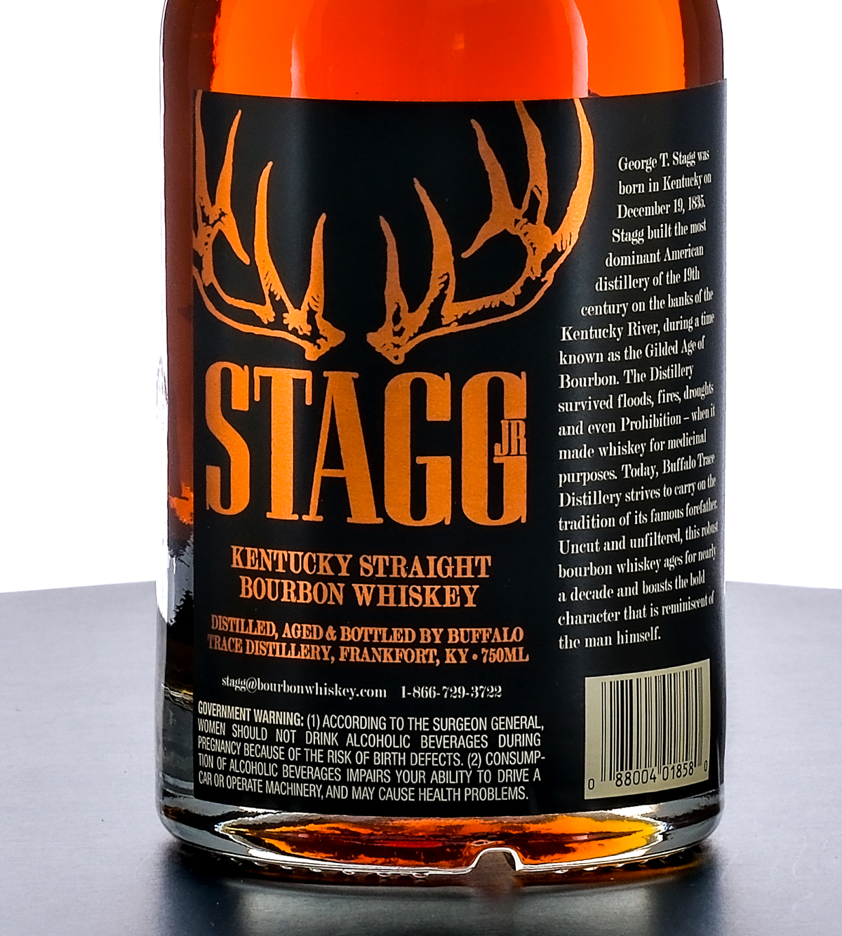 Stagg Jr. Barrel Proof Kentucky Straight Bourbon Whiskey (Spring 2016). Batch 6. Laser code: B1602801:347. 66.25% ALC/VOL (132.5 Proof). Foil very good but slightly loose (spins). Screened and printed labels excellent. 750ml. Distilled, aged & bottled by Buffalo Trace Distillery.