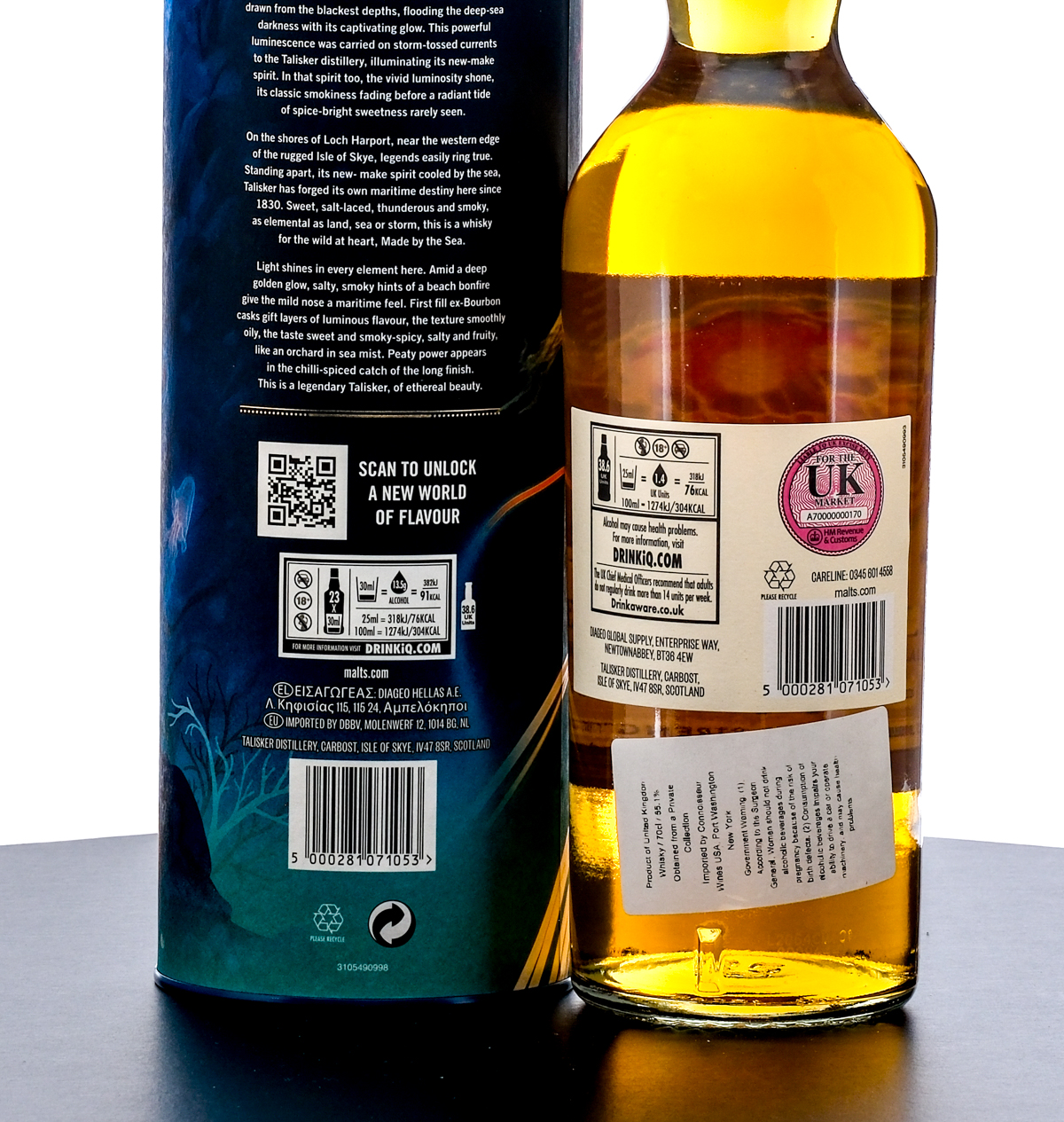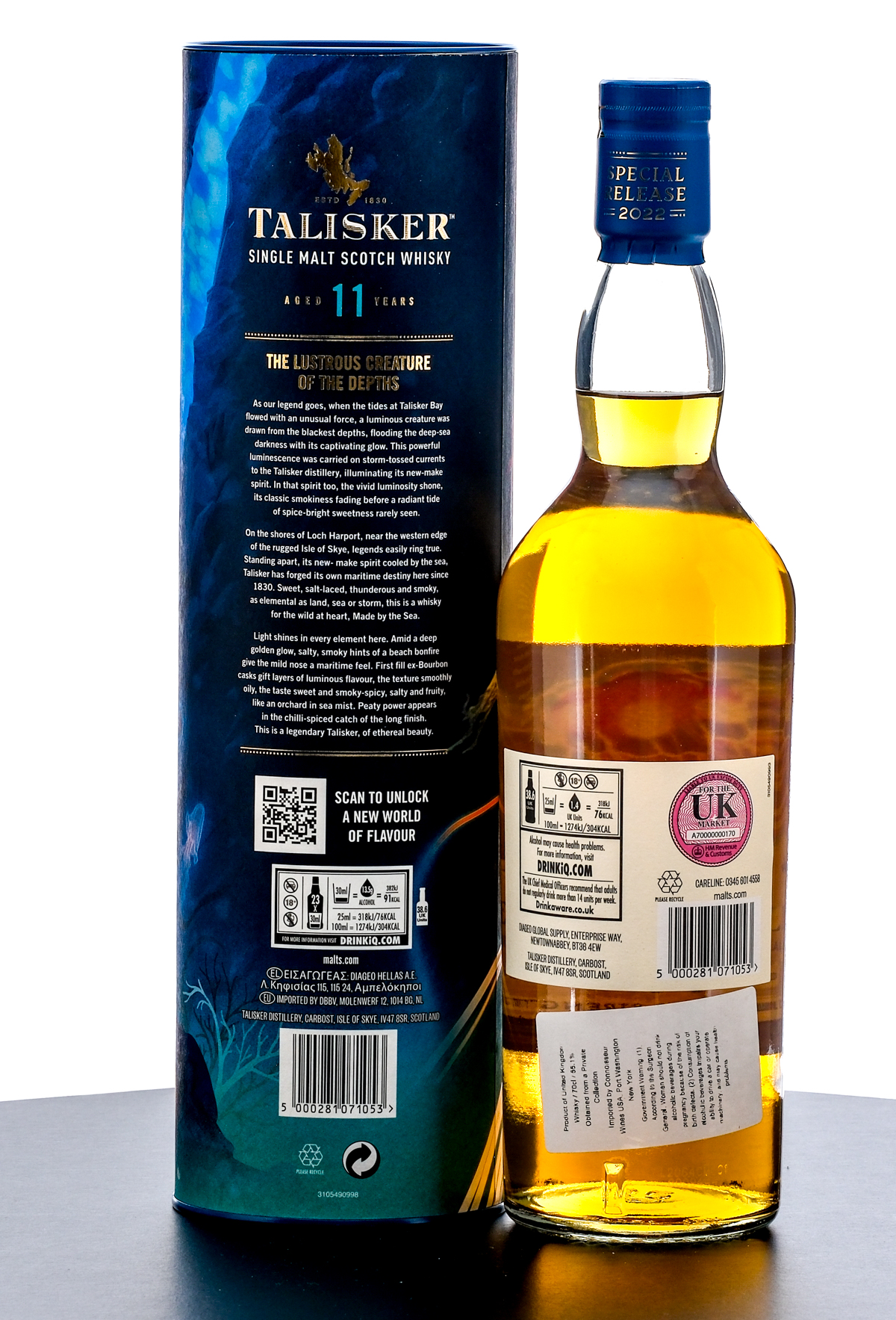 Talisker 11 Year Single Malt Scotch Whiskey. Special Release 2022. Lightly peated stocks from ex-Bourbon casks. Intended for the UK market. Additional label affixed to rear indicates “bottle obtained from private collection” and “imported by Connoisseur Wines USA (Port Washington, NY). 55.1% ALC/VOL. Cardboard tube excellent. Foil seal and printed labels on bottle likewise excellent. 70cl. Distilled, matured and bottled by Talisker Distillery.