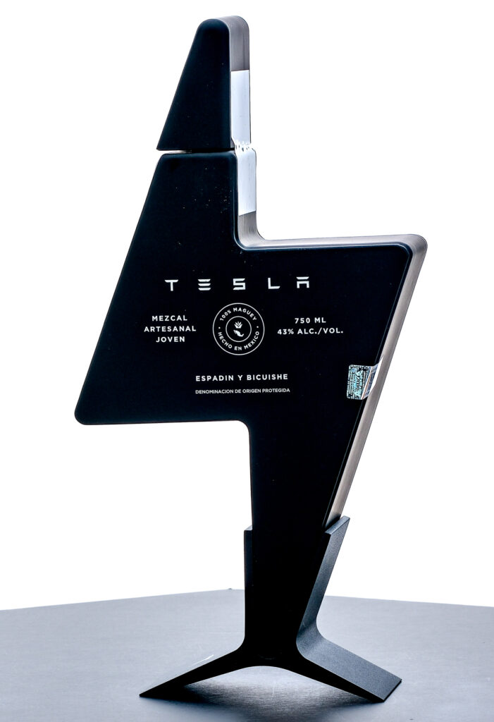 Tesla Artesanal Joven Mezcal (2024). 100% Maguey Espadin y Bicuishe. 43% ALC/VOL. Seal intact. Includes stand. Screened labels excellent. 750ml. Asociación de Maguey y Mezcal.