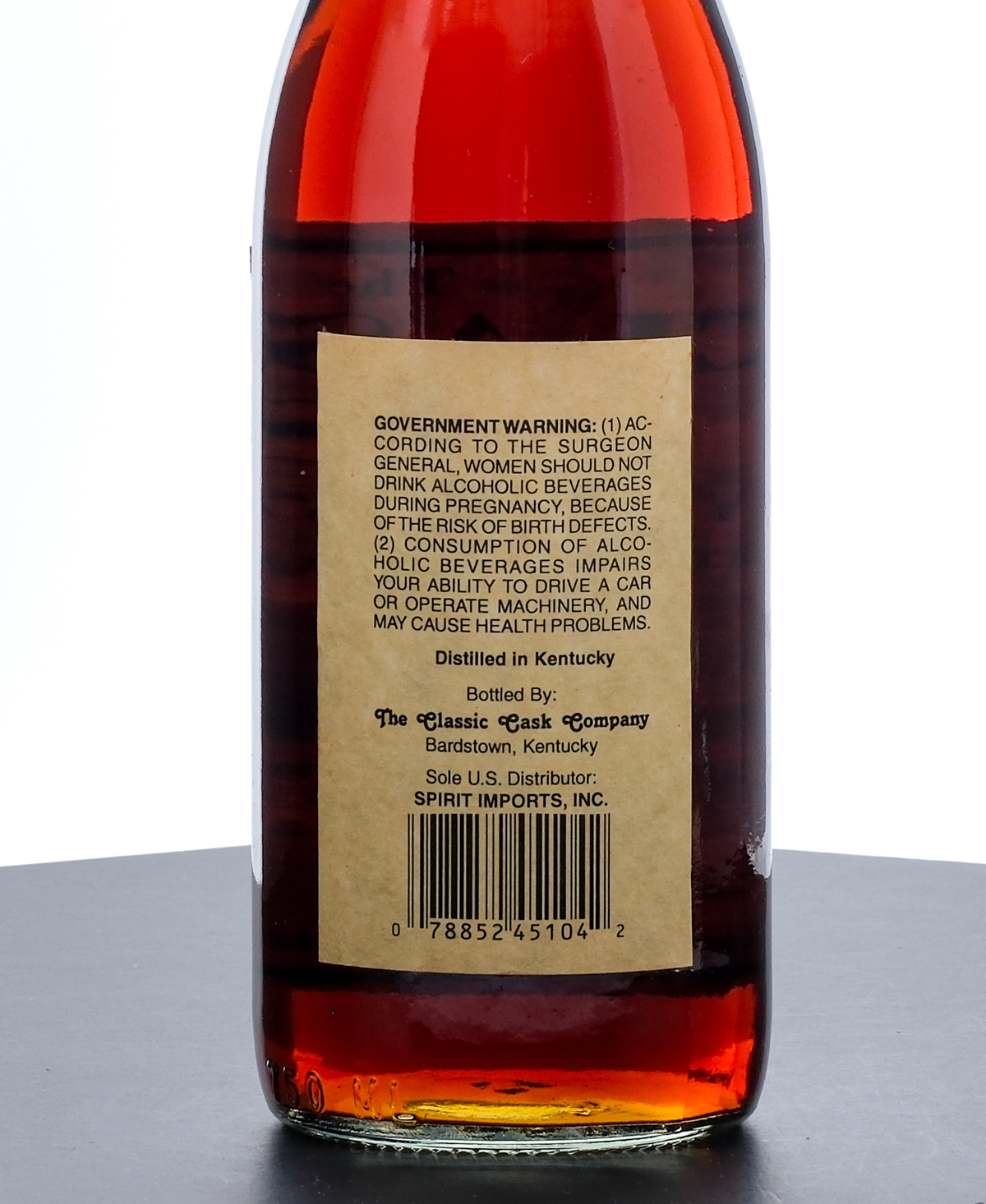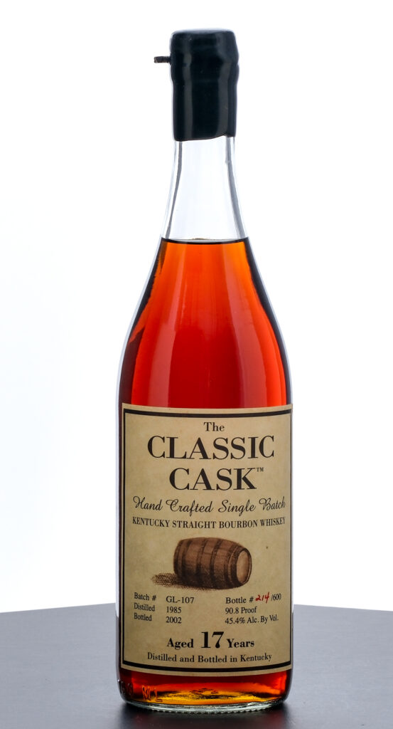 From The Collection of Michael Aronoff: The Classic Cask 17 Year Hand Crafted Single Batch Kentucky Straight Bourbon Whiskey (2002). Batch #: GL-107. Bottle # 214/600. Distilled 1985. Bottled 2002. 45.4% ALC/VOL (90.8 Proof). Wax seal intact (possible loss around pull tab portion). Printed labels excellent. 750ml. Bottled by: The Classic Cask Company. Sole U.S. Distributor: Spirit Imports, Inc.