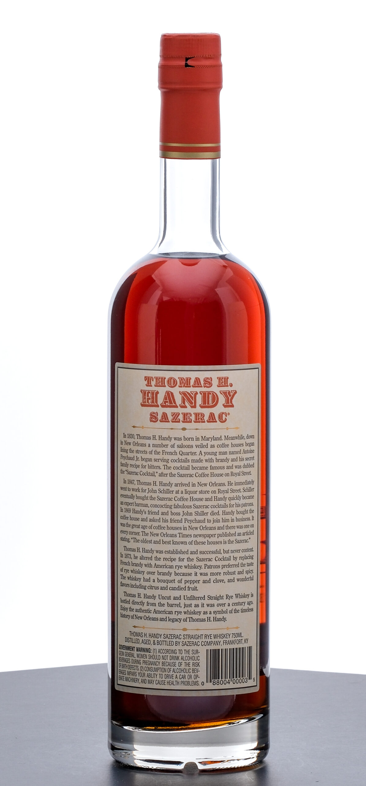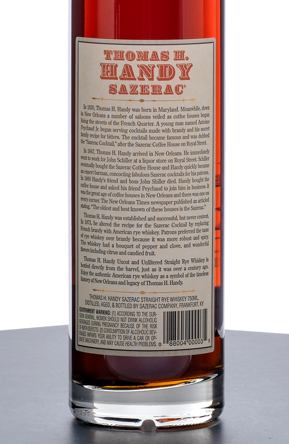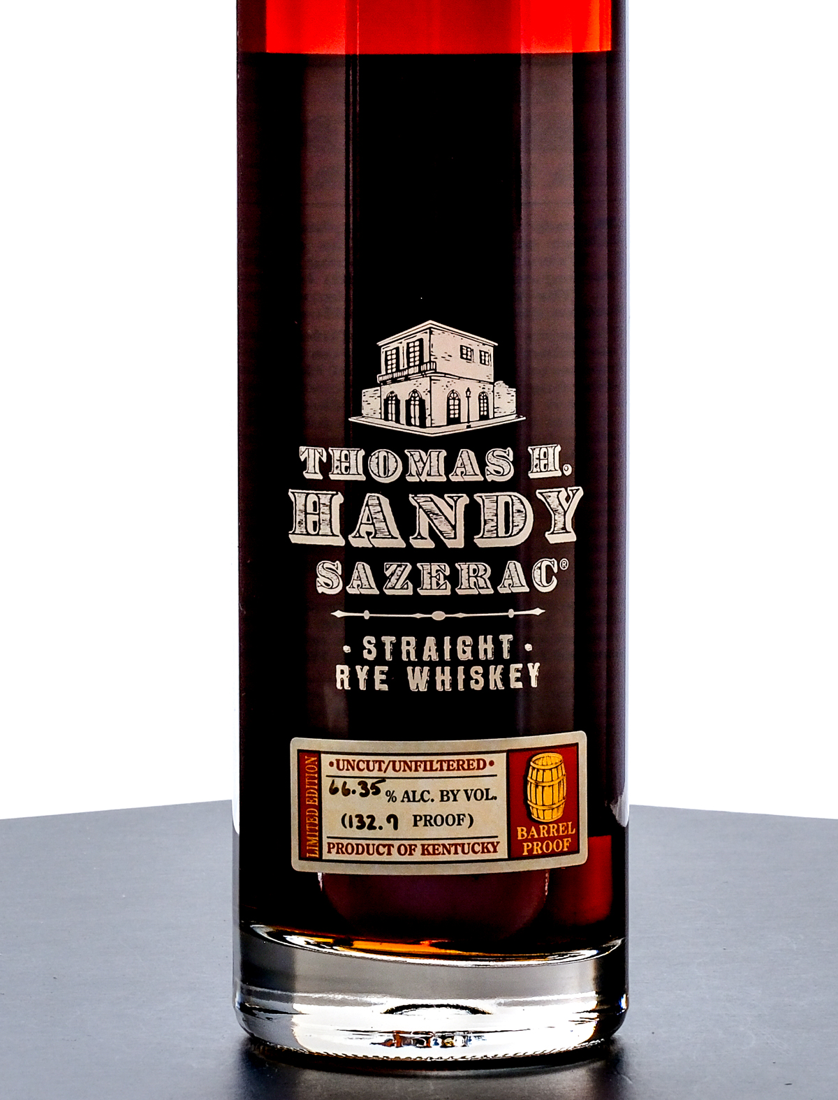 From The Collection of Michael Aronoff: Thomas H Handy Sazerac Barrel Proof Straight Rye Whiskey (2006). Limited Edition. 8.5 Year. 66.35% ALC/VOL (132.7 Proof). Foil seal excellent. Screened and printed labels likewise excellent. 750ml. Distilled, aged & bottled by Sazerac Company (Frankfort, KY).