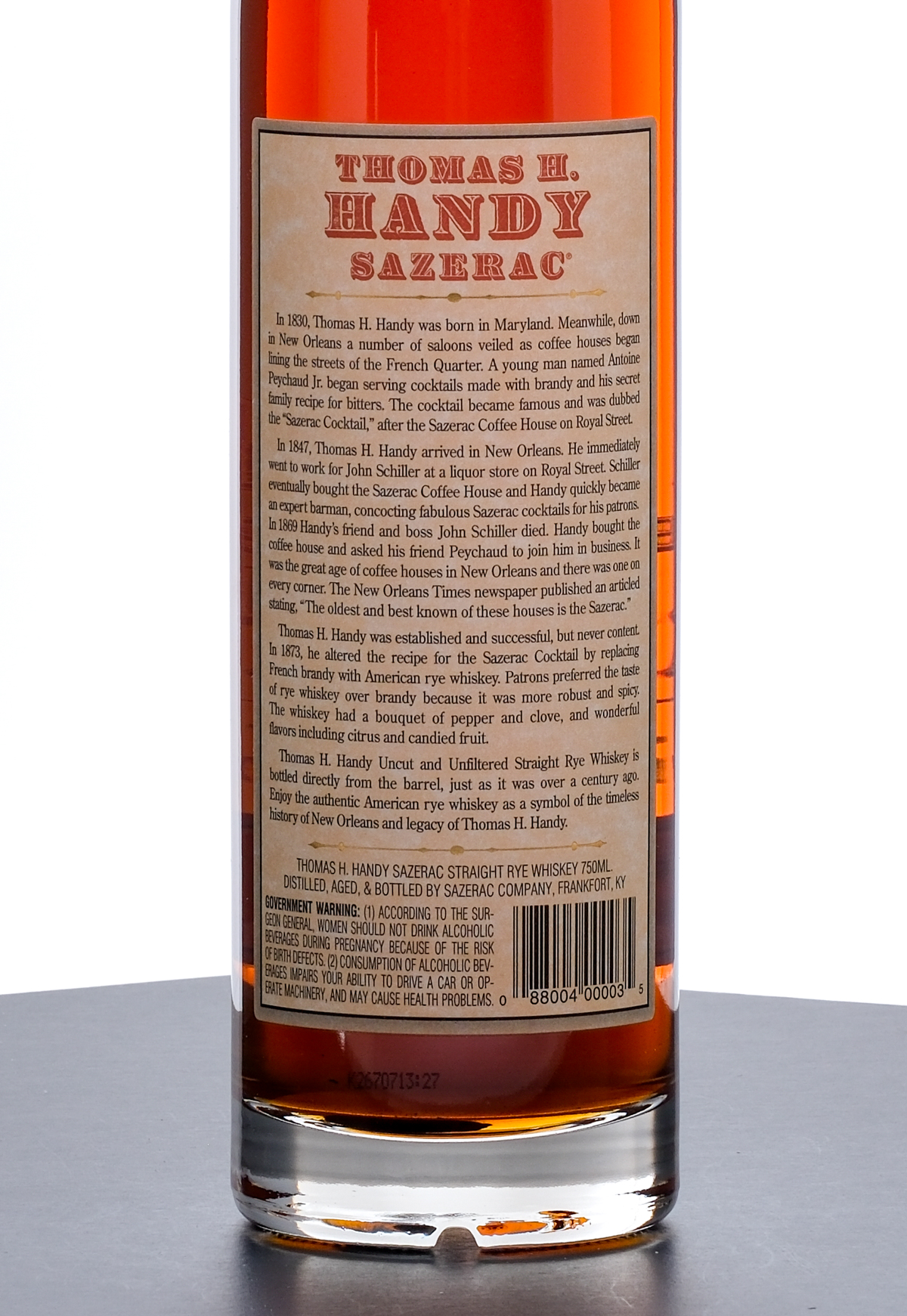 From The Collection of Michael Aronoff: Thomas H Handy Sazerac Barrel Proof Straight Rye Whiskey (2007). Limited Edition. 6.5 Year. Laser Code: K2670713:27. 67.4% ALC/VOL (134.8 Proof). Foil seal excellent. Screened and printed labels likewise excellent. 750ml. Distilled, aged & bottled by Sazerac Company (Frankfort, KY).