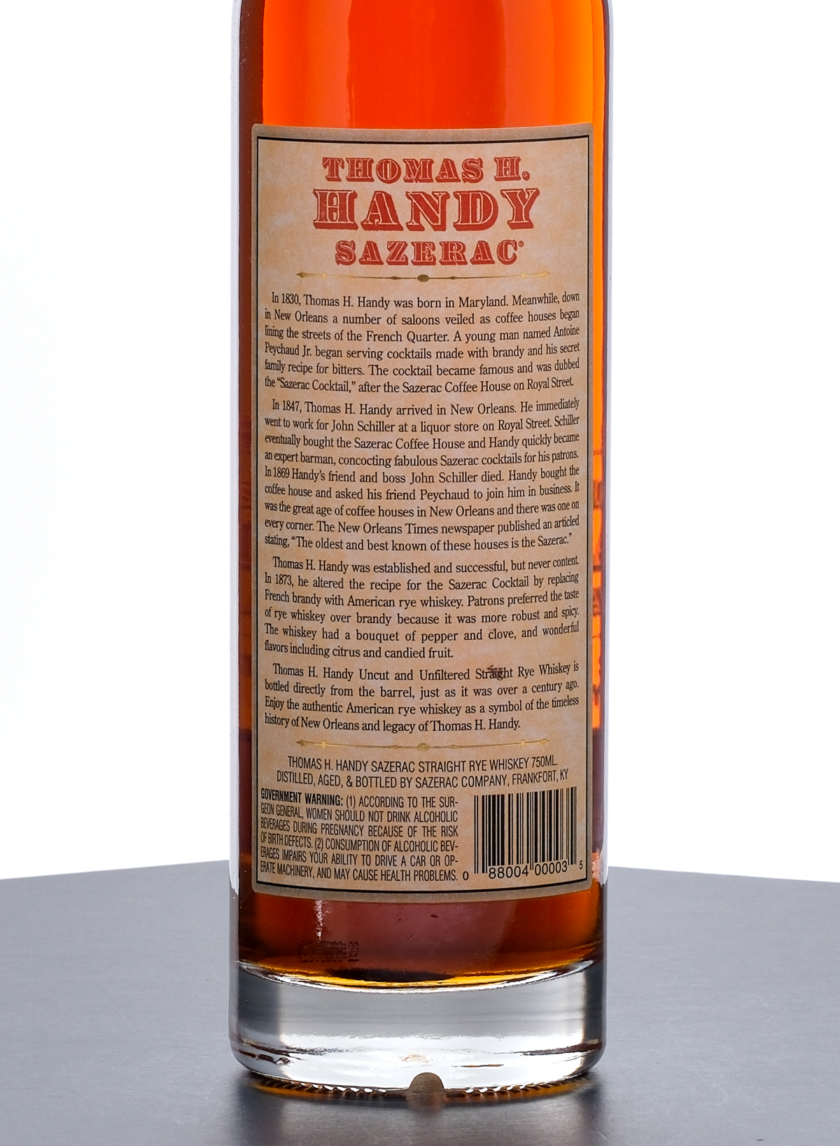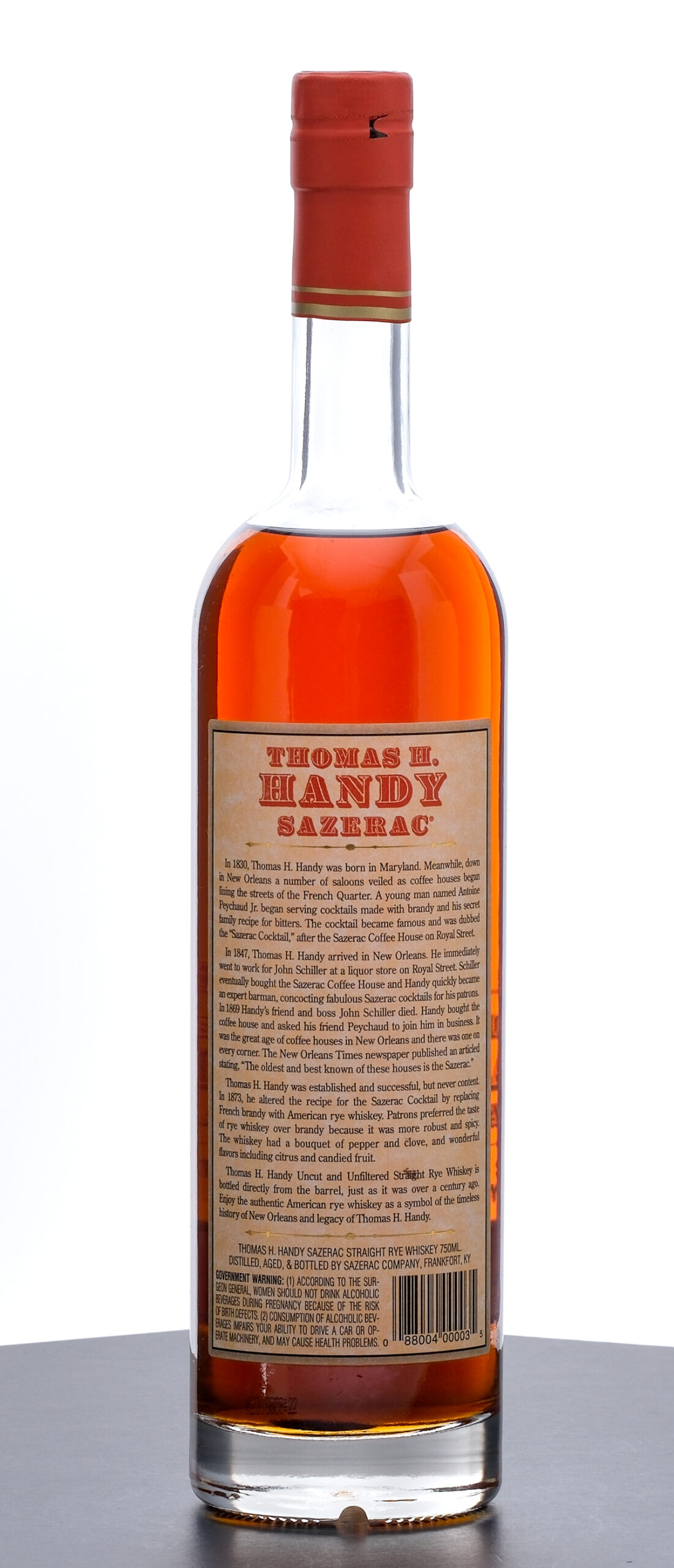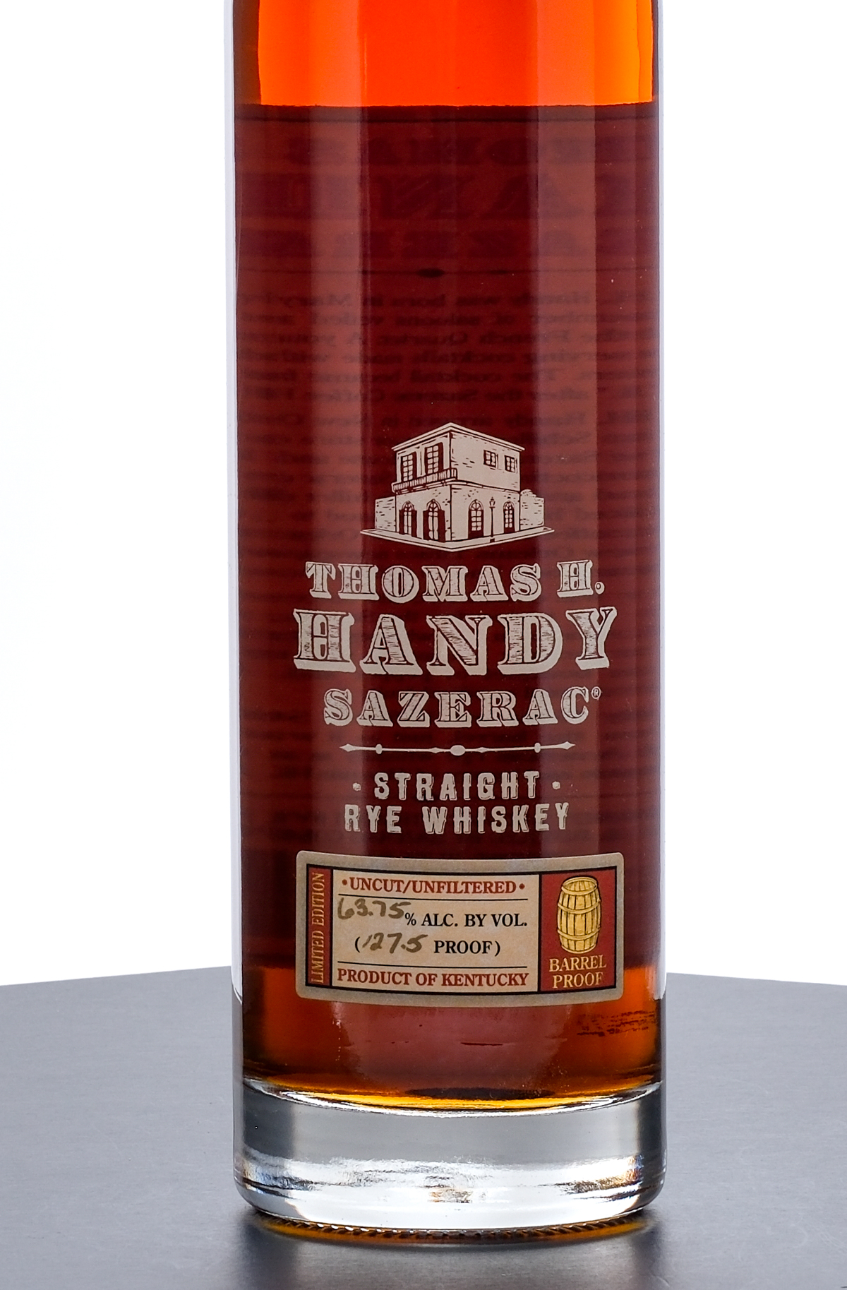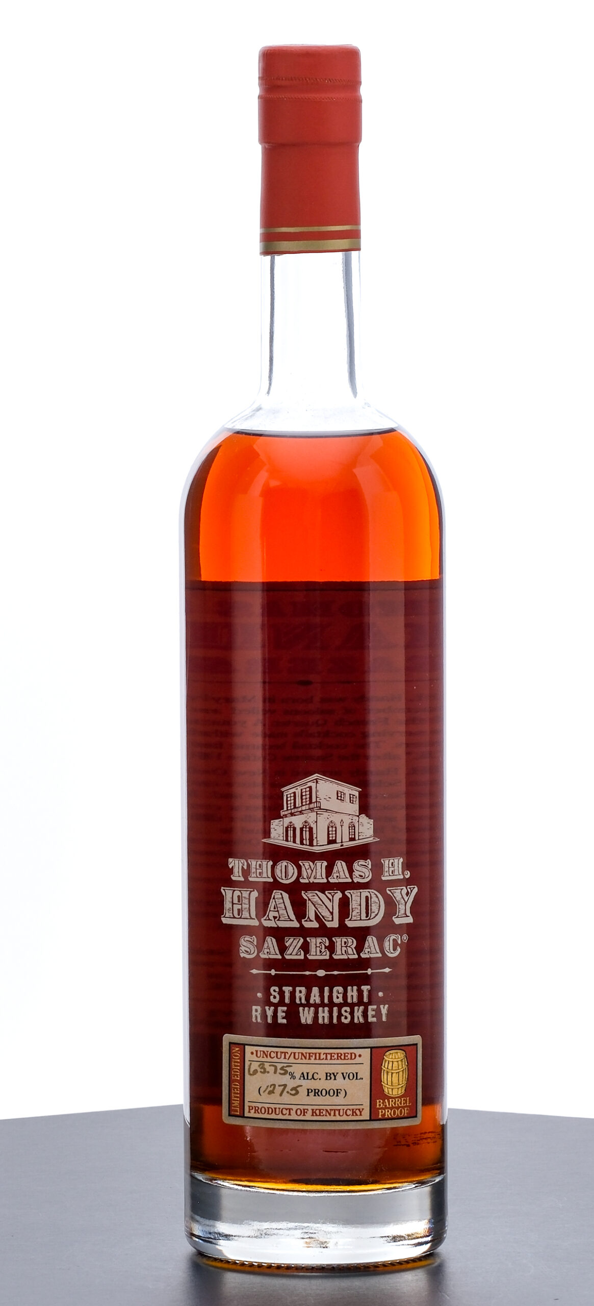 From The Collection of Michael Aronoff: Thomas H Handy Sazerac Barrel Proof Straight Rye Whiskey (2008). Limited Edition. 6.5 Year. Laser Code: K2390808:02. 63.75% ALC/VOL (127.5 Proof). Foil seal excellent. Screened and printed labels likewise excellent. 750ml. Distilled, aged & bottled by Sazerac Company (Frankfort, KY).