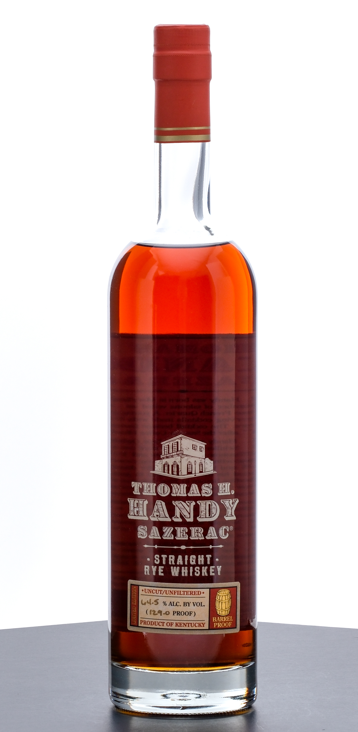 From The Collection of Michael Aronoff: Thomas H Handy Sazerac Barrel Proof Straight Rye Whiskey (2009). Limited Edition. 7.2 Year. Laser Code: K2030912:56. 64.5% ALC/VOL (129 Proof). Foil seal excellent. Screened and printed labels likewise excellent. 750ml. Distilled, aged & bottled by Sazerac Company (Frankfort, KY).