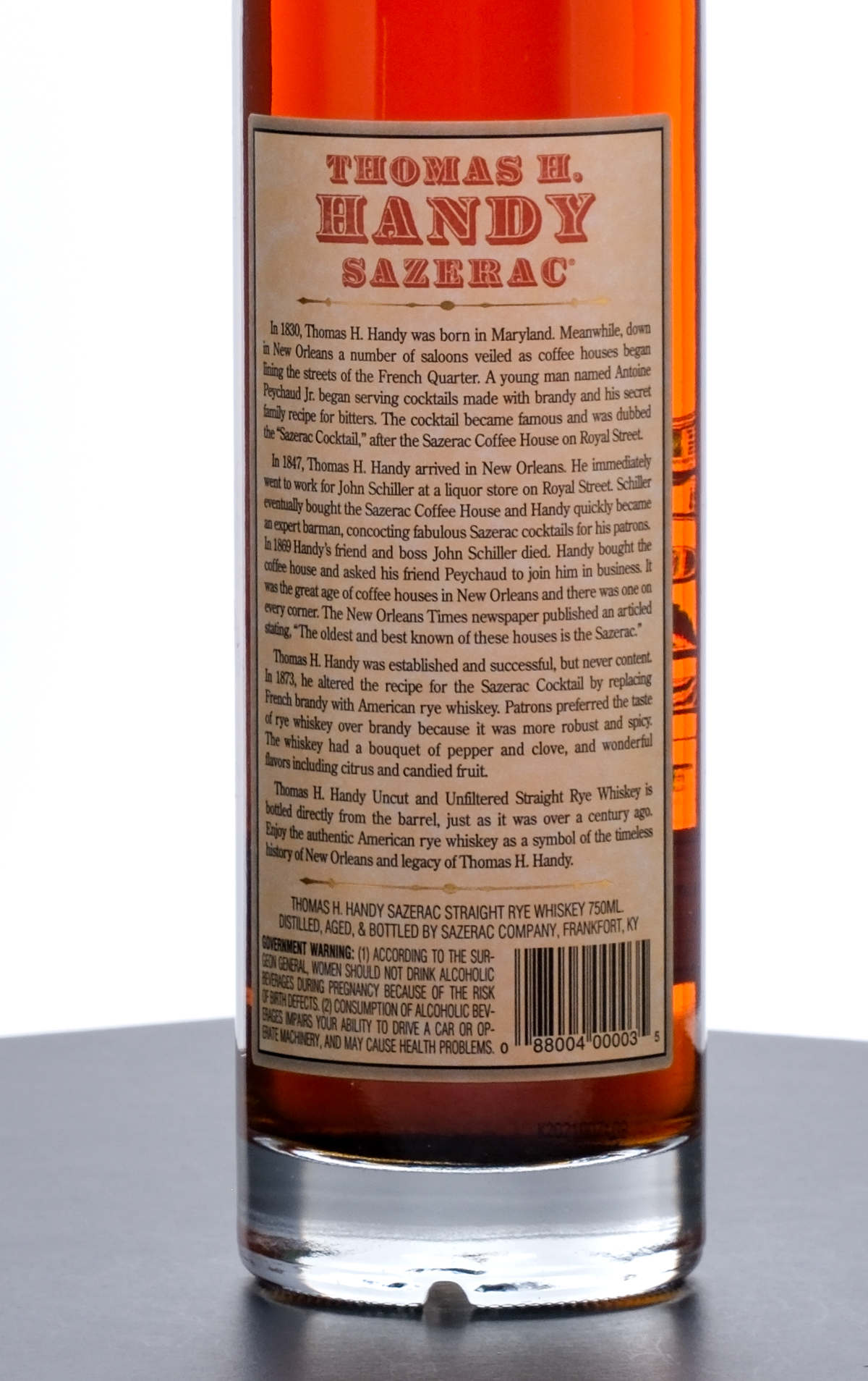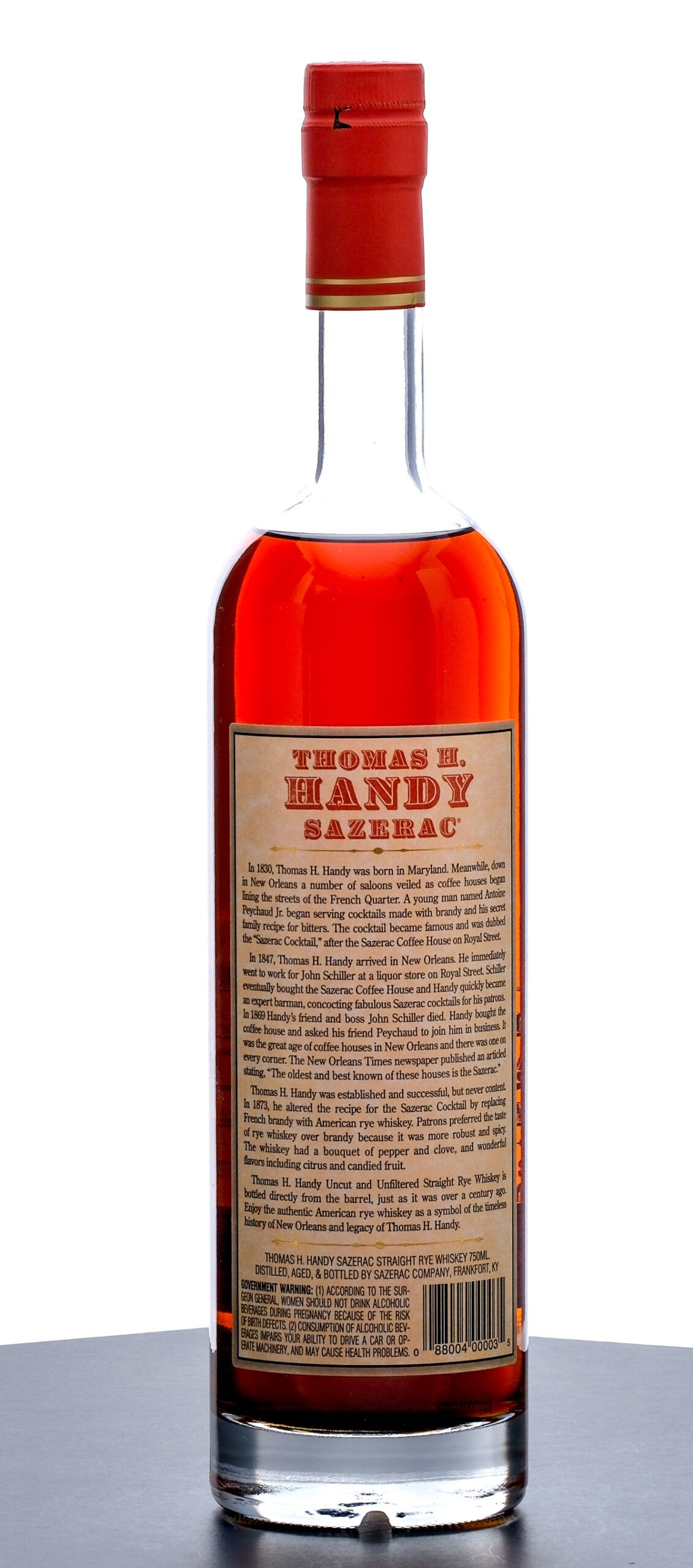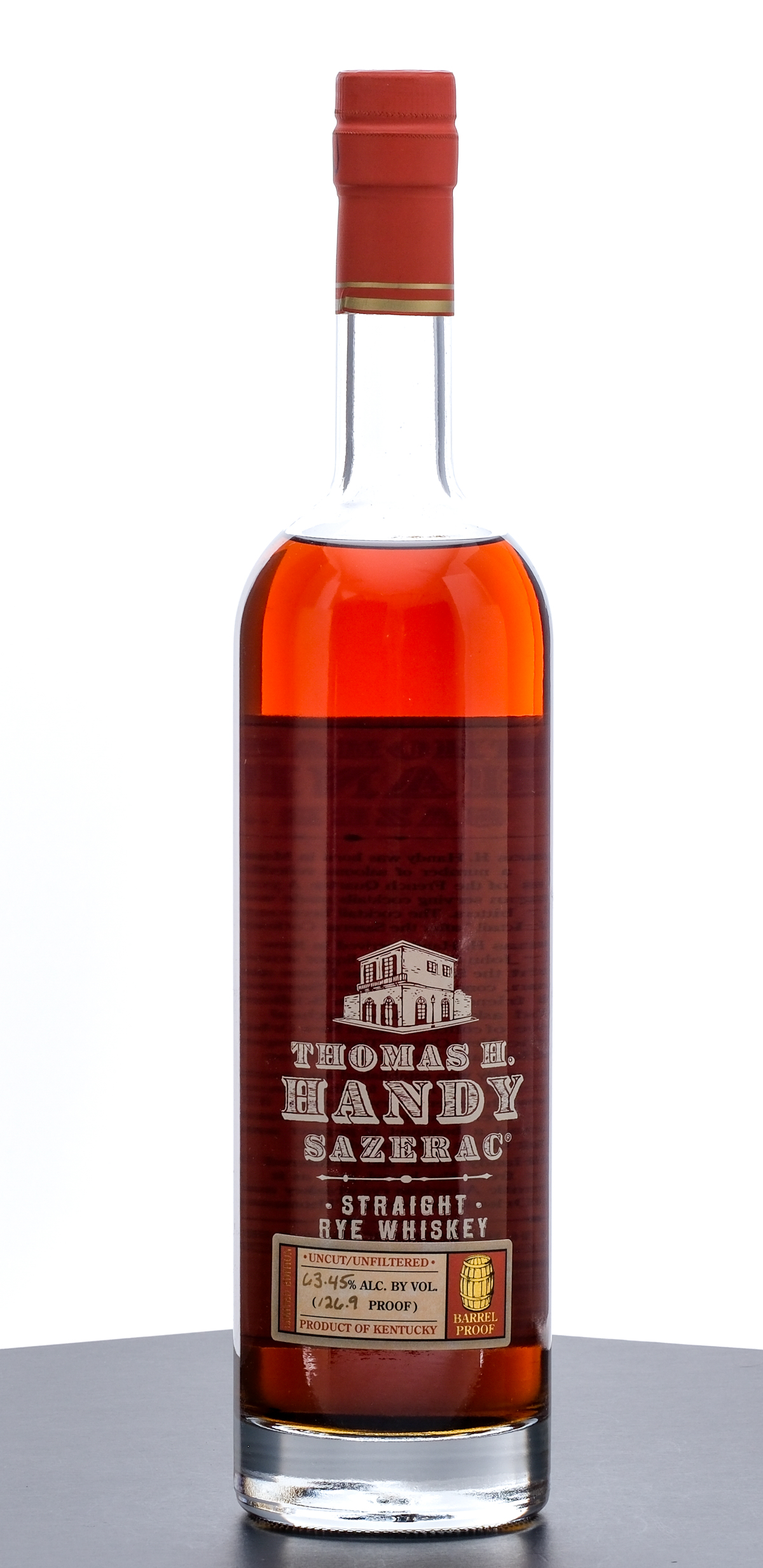 From The Collection of Michael Aronoff: Thomas H Handy Sazerac Barrel Proof Straight Rye Whiskey (2010). Limited Edition. 6.5 Year. Laser Code: K2021007:08. 63.45% ALC/VOL (126.9 Proof). Foil seal uncompromised but exhibits a streak of marker ink. Screened and printed labels excellent. 750ml. Distilled, aged & bottled by Sazerac Company (Frankfort, KY).