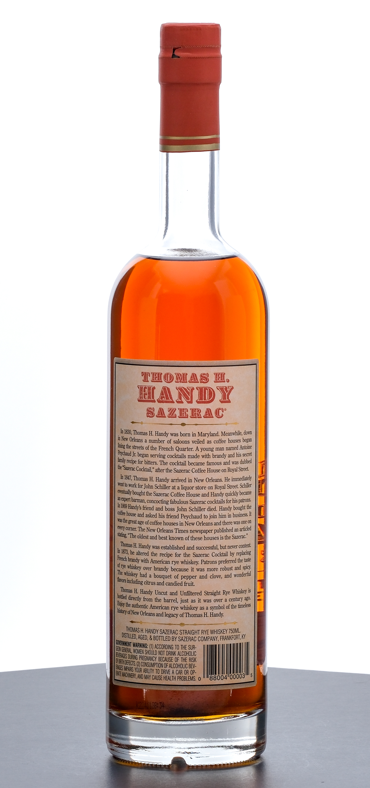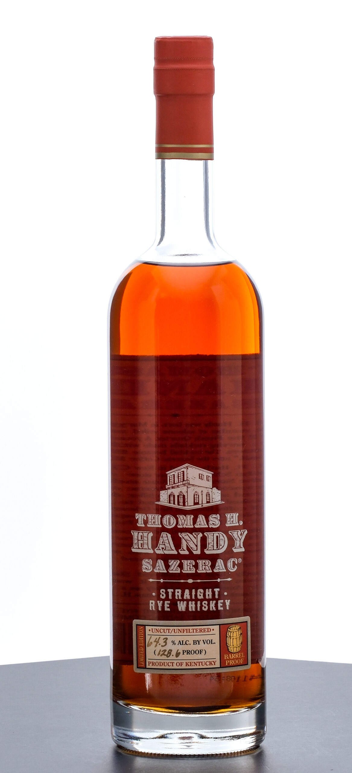 From The Collection of Michael Aronoff: Thomas H Handy Sazerac Barrel Proof Straight Rye Whiskey (2011). Limited Edition. 6 Year. Laser Code: K2241108:34. 64.3% ALC/VOL (128.6 Proof). Foil seal excellent. Screened and printed labels likewise excellent. 750ml. Distilled, aged & bottled by Sazerac Company (Frankfort, KY).