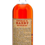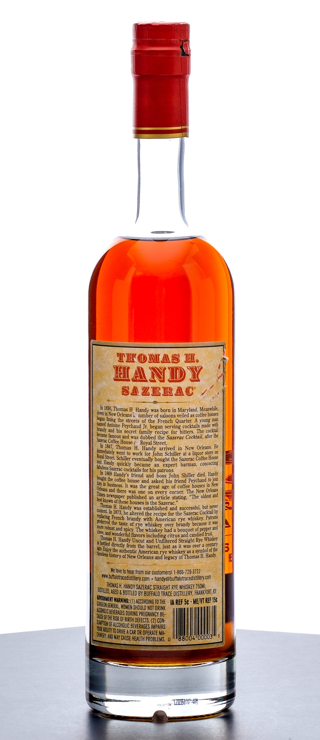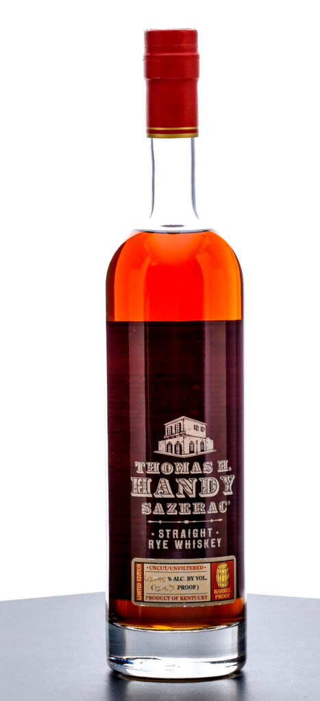 Thomas H Handy Sazerac Barrel Proof Straight Rye Whiskey (2023). Limited Edition. Laser code: L232350112:48M. 62.45% ALC/VOL (124.9 Proof). Foil excellent. Screened labels likewise excellent. Printed labels in good condition, front label exhibits some minor color losses while the back label looks like Wolverine handled it a little too rough and scratched up the top right corner. 750ml. Distilled, aged & bottled by Buffalo Trace Distillery.