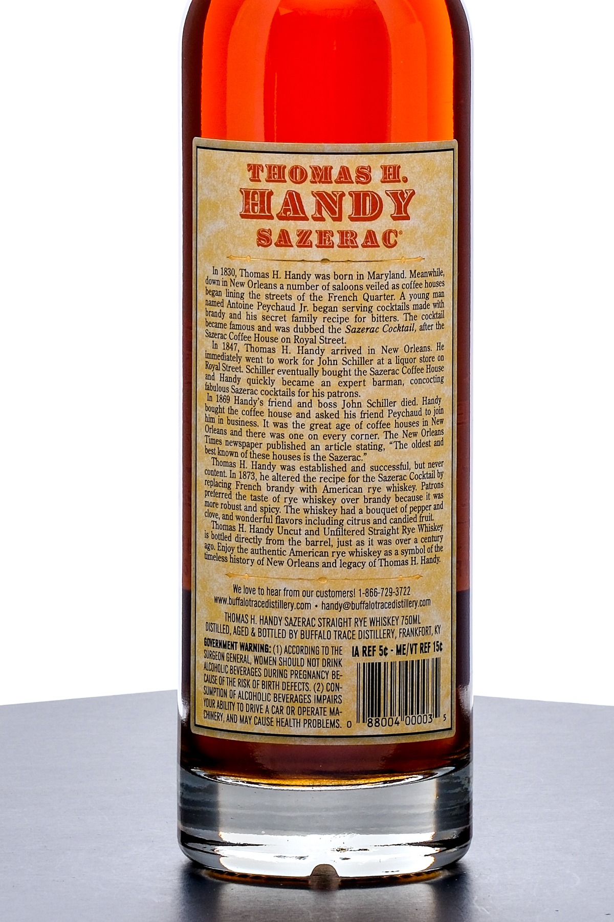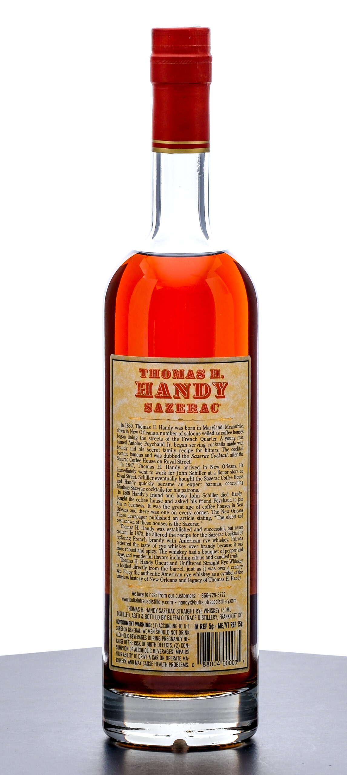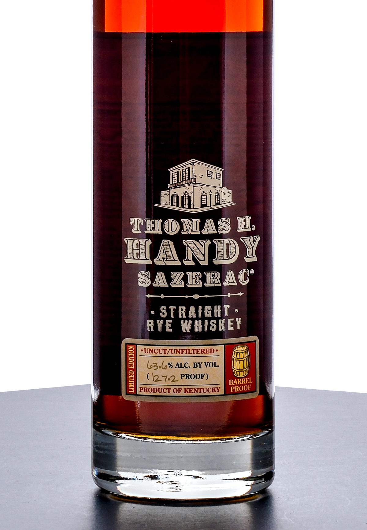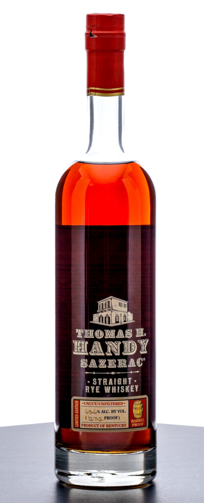 Thomas H. Handy Sazerac Limited Edition Straight Rye Whiskey Barrel Proof (2024). Laser Code: L2427501 13:41D. 63.6% ALC/VOL (127.2 Proof). Foil seal excellent. Screened and printed labels excellent. 750ml. Distilled, Aged & Bottled by Buffalo Trace Distillery.