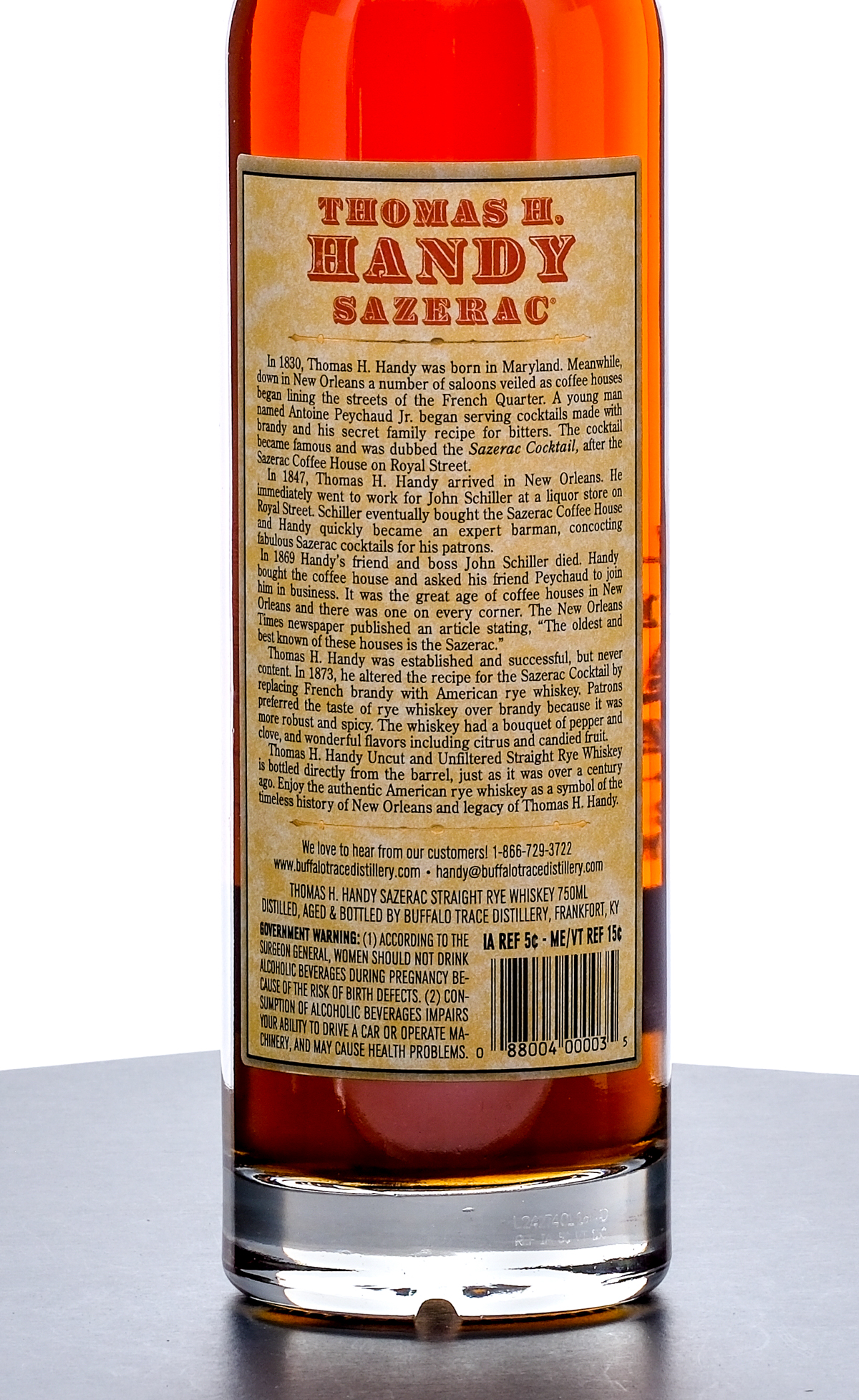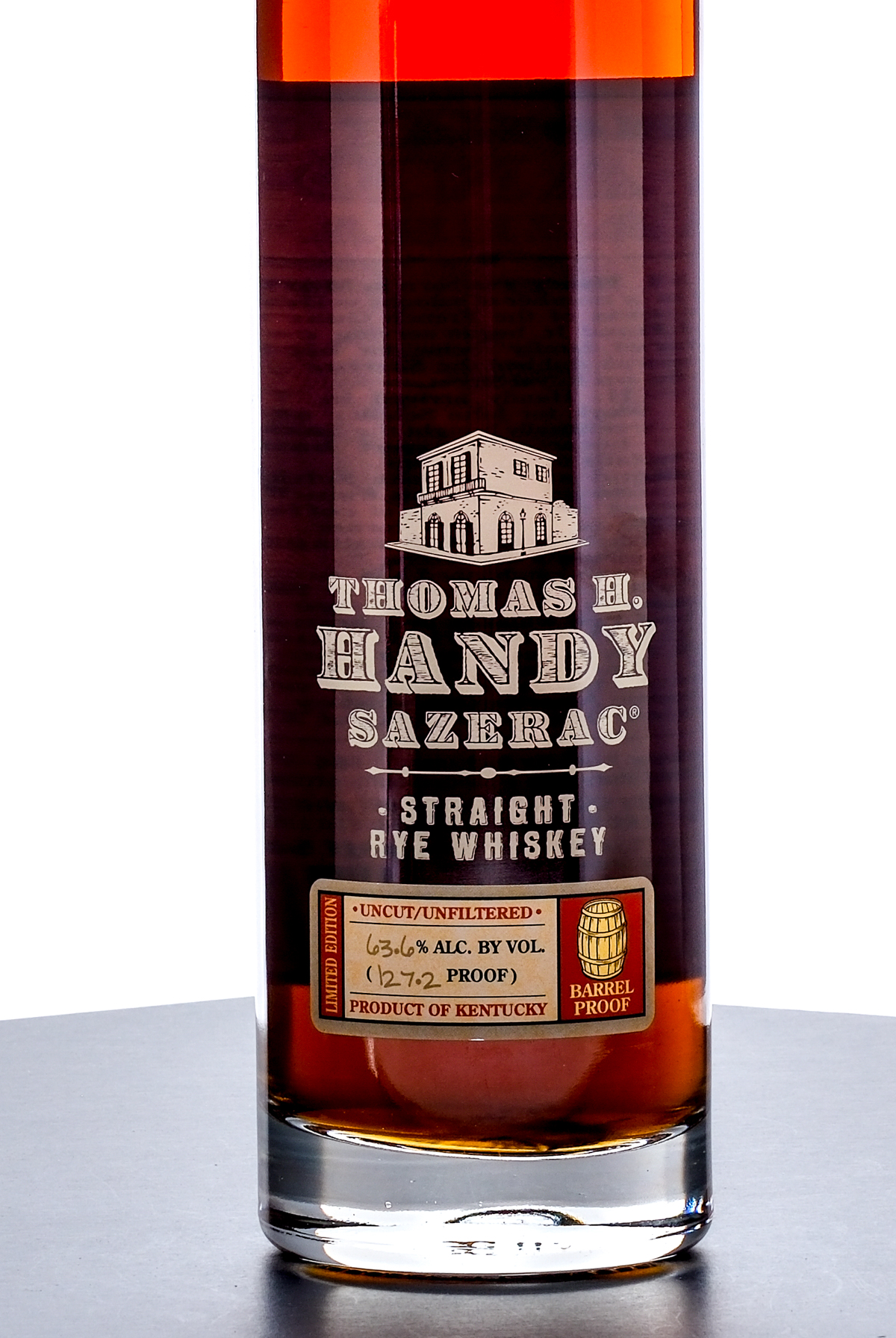 Thomas H. Handy Sazerac Limited Edition Straight Rye Whiskey Barrel Proof (2024). Laser Code: L242740118:44D. 63.6% ALC/VOL (127.2 Proof). Foil seal excellent. Screened and printed labels excellent. 750ml. Distilled, Aged & Bottled by Buffalo Trace Distillery.