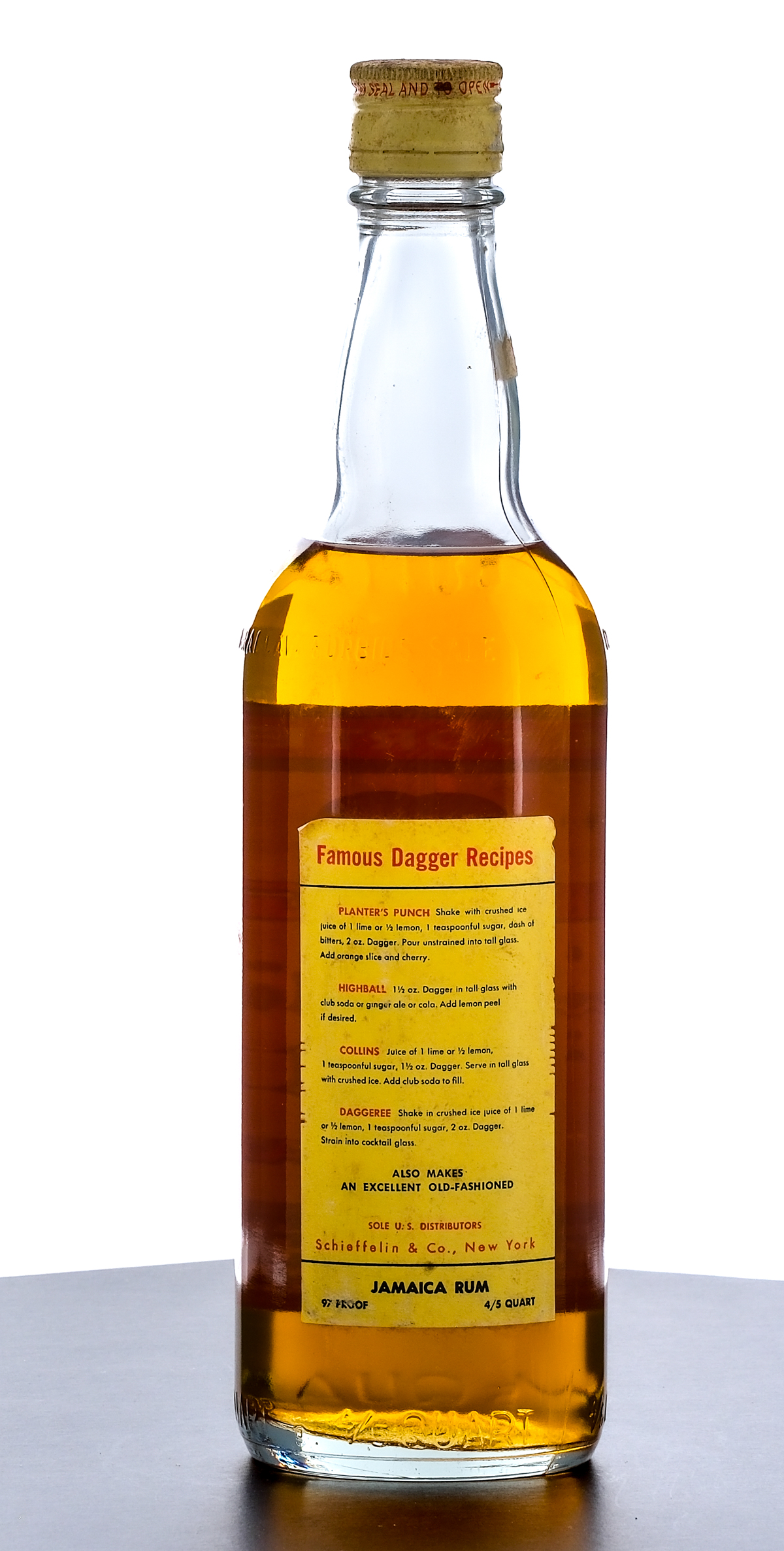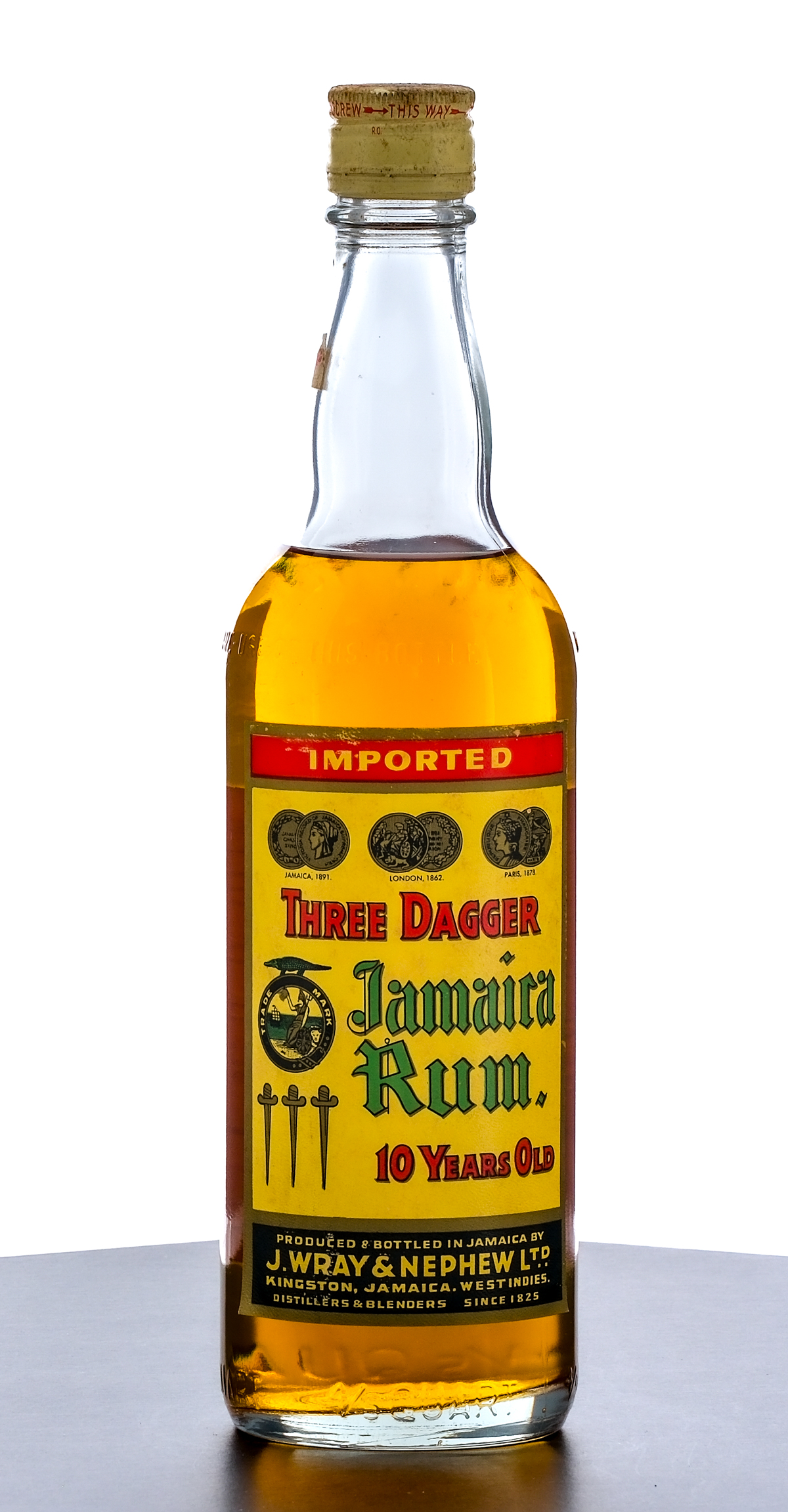 Three Dagger 10 Year Jamaica Rum. Circa 1961-1977. 97 Proof. Screw top seal intact. Printed labels very good given their age with small nicks, tears and losses throughout. 4/5 Qt. Produced & bottled by J. Wray & Nephew Ltd (Kingston, Jamaica, West Indies). Sole U.S. Distributors Schieffelin & Co. (New York).