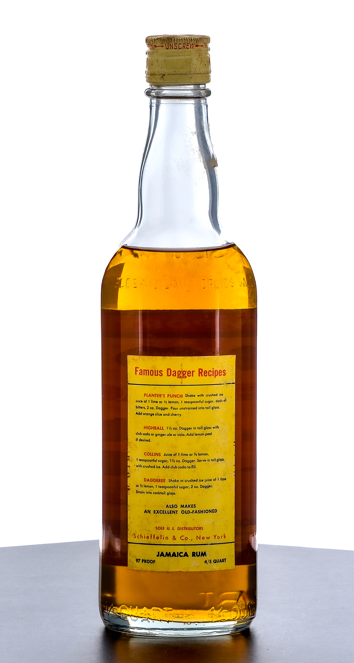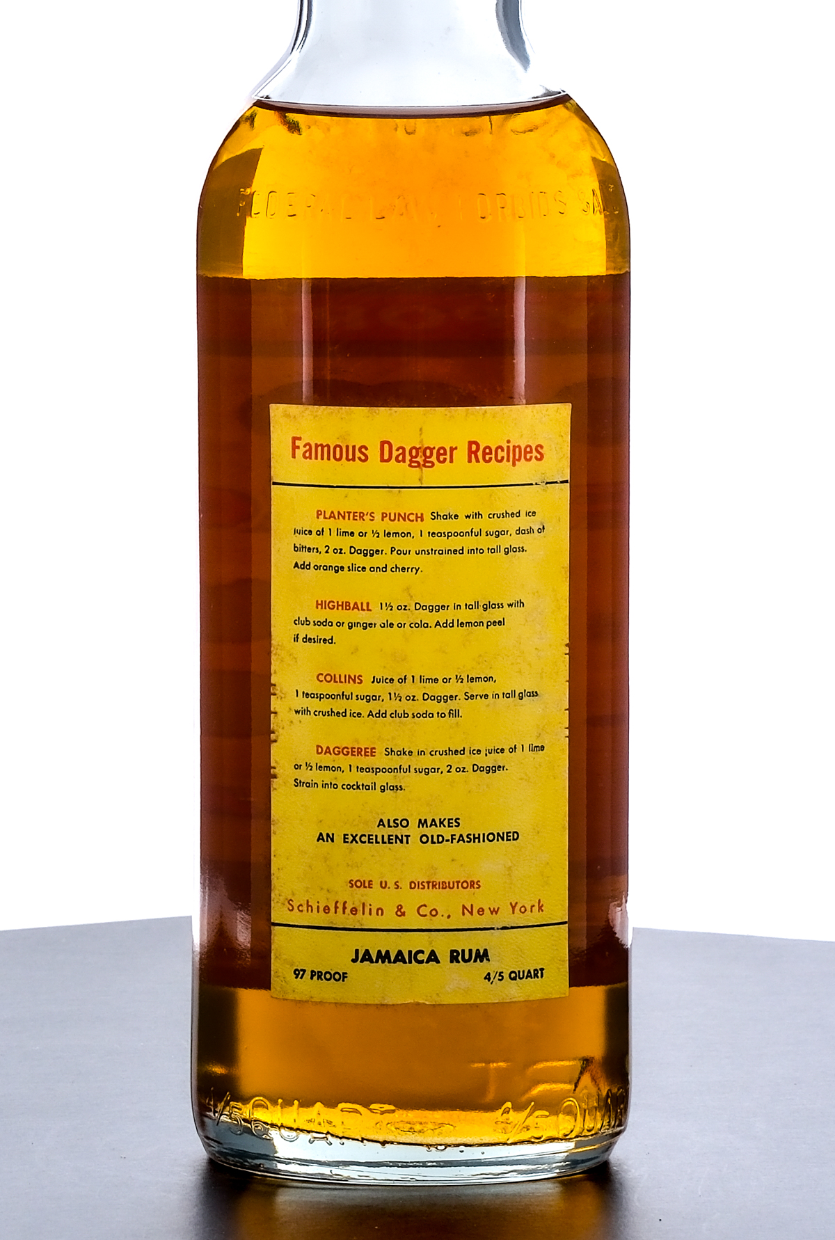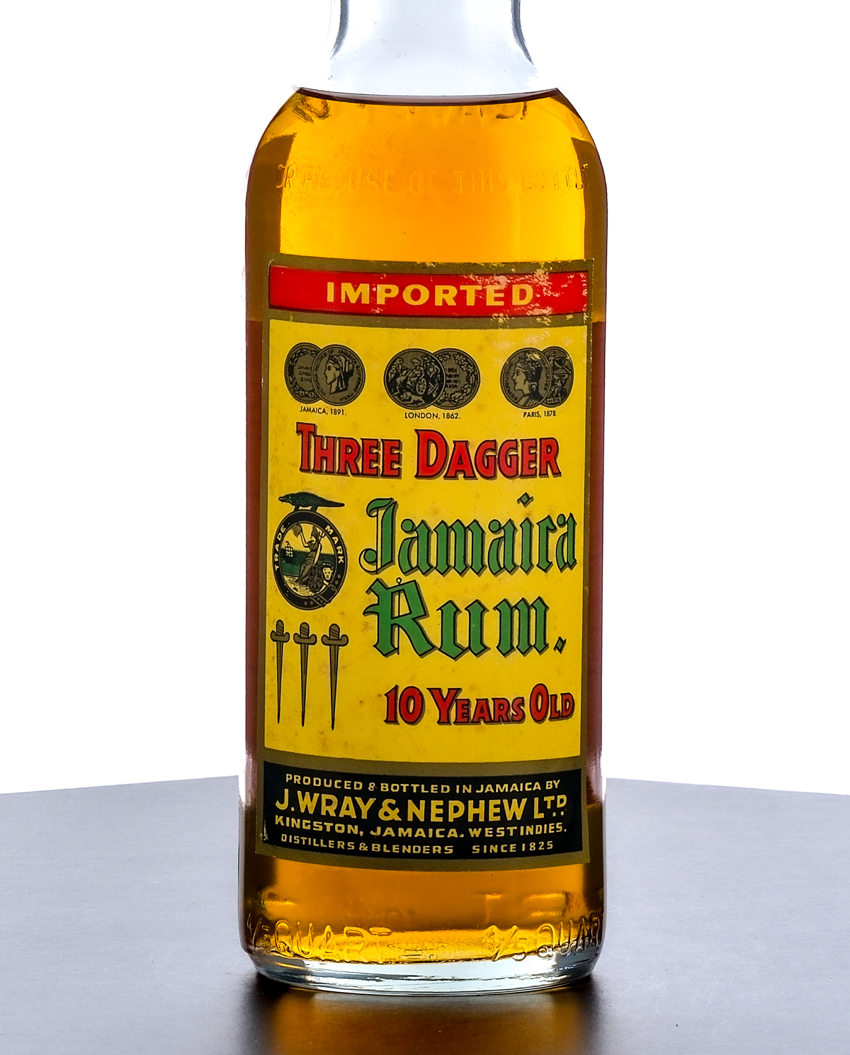 Three Dagger 10 Year Jamaica Rum. Circa 1961-1977. 97 Proof. Screw top seal intact. Printed labels very good given their age with small nicks, tears and losses throughout. 4/5 Qt. Produced & bottled by J. Wray & Nephew Ltd (Kingston, Jamaica, West Indies). Sole U.S. Distributors Schieffelin & Co. (New York).