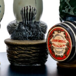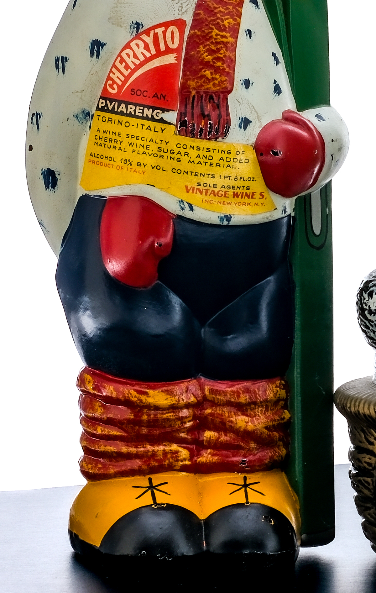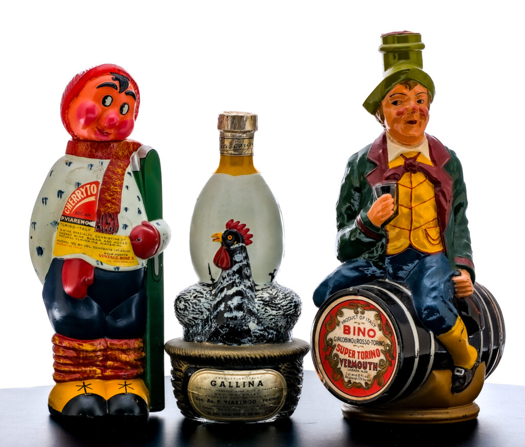 Group of 3 vintage ceramic decanters: 1x 1 Qt 8 fl oz bottle of Super Torino Vermouth. 17% ALC/VOL. Top sticker seal displays some lifting and losses. Printed labels in good condition (exhibiting some staining and discoloration). Decanter itself in overall good condition (displays some losses in the paint). Product of Italy. Giacobino & Rosso-Torino Bino. Sole Agents for United States: John Gross & Co. (Baltimore, MD). Distributors for New York: Star Liquor Dealers Inc. (Long Island City, N.Y). 1x 1 Pt 8 fl oz bottle of Cherryto Soc. An. P. Viarengo Vintage Hand Painted Skier decanter. A wine specialty consisting of Cherry Wine, Sugar and added natural flavoring. 18% ALC/VOL. Foil seal excellent. Printed labels in good condition (exhibiting some minor losses). Decanter in overall good condition (exhibiting some minor rubbing losses throughout). Head is only attached by to Earth’s gravitational force. Product of Torino-Italy. Sole Agents: Vintage Wines, Inc. (New York, NY). 1x 1 Pt 9 fl oz bottle of Gallina: a special marsala wine with a trace of egg material. 18% ALC/VOL. Foil seal good. Printed label likewise in good condition (exhibiting some wrinkling). Decanter itself exhibits some minor losses in paint throughout. Product of Italy. Produced and bottled by Soc. AN. P. (Viarengo. Torino). Sole agents: Vintage Wines, Inc. (New York, NY).
