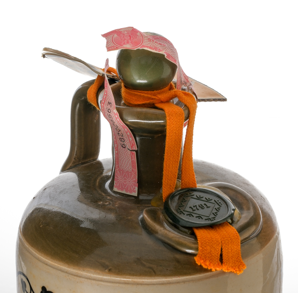 86 Proof. Bottle stamp broken at one end. Ribbon and wax stamp serving as seal intact. Hang tag intact. Ceramic jug exhibits minor stains throughout. Whiskey Blended Tullamore Dew Company Ireland Dublin 1 4/5 Qt.