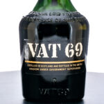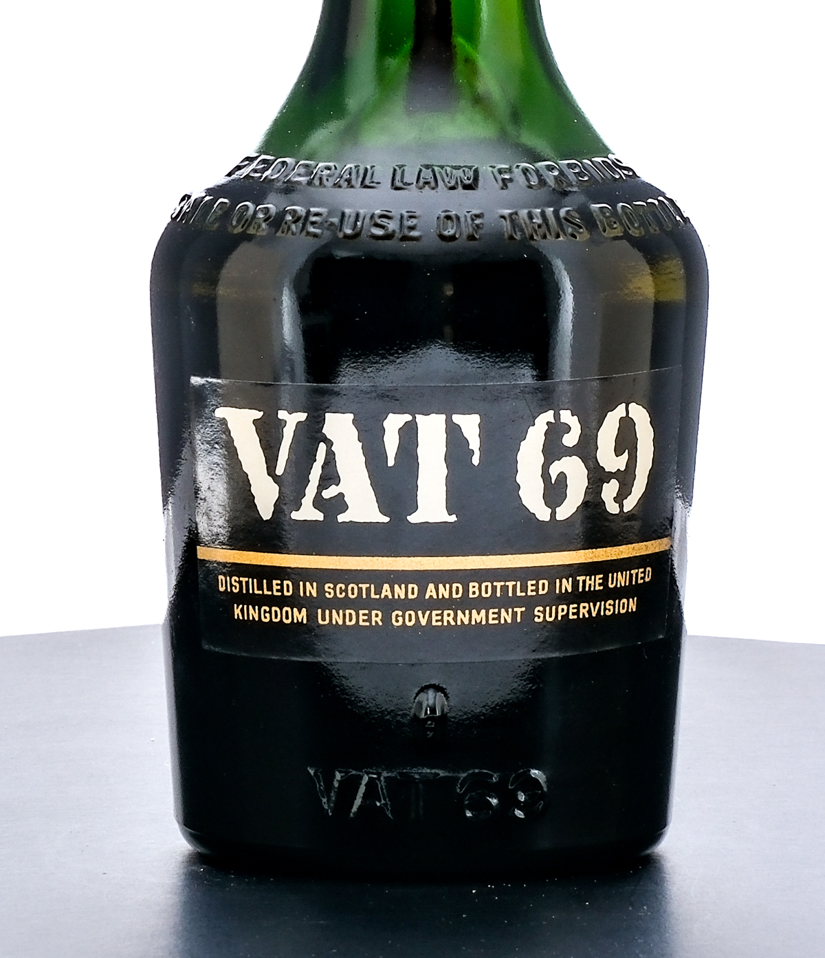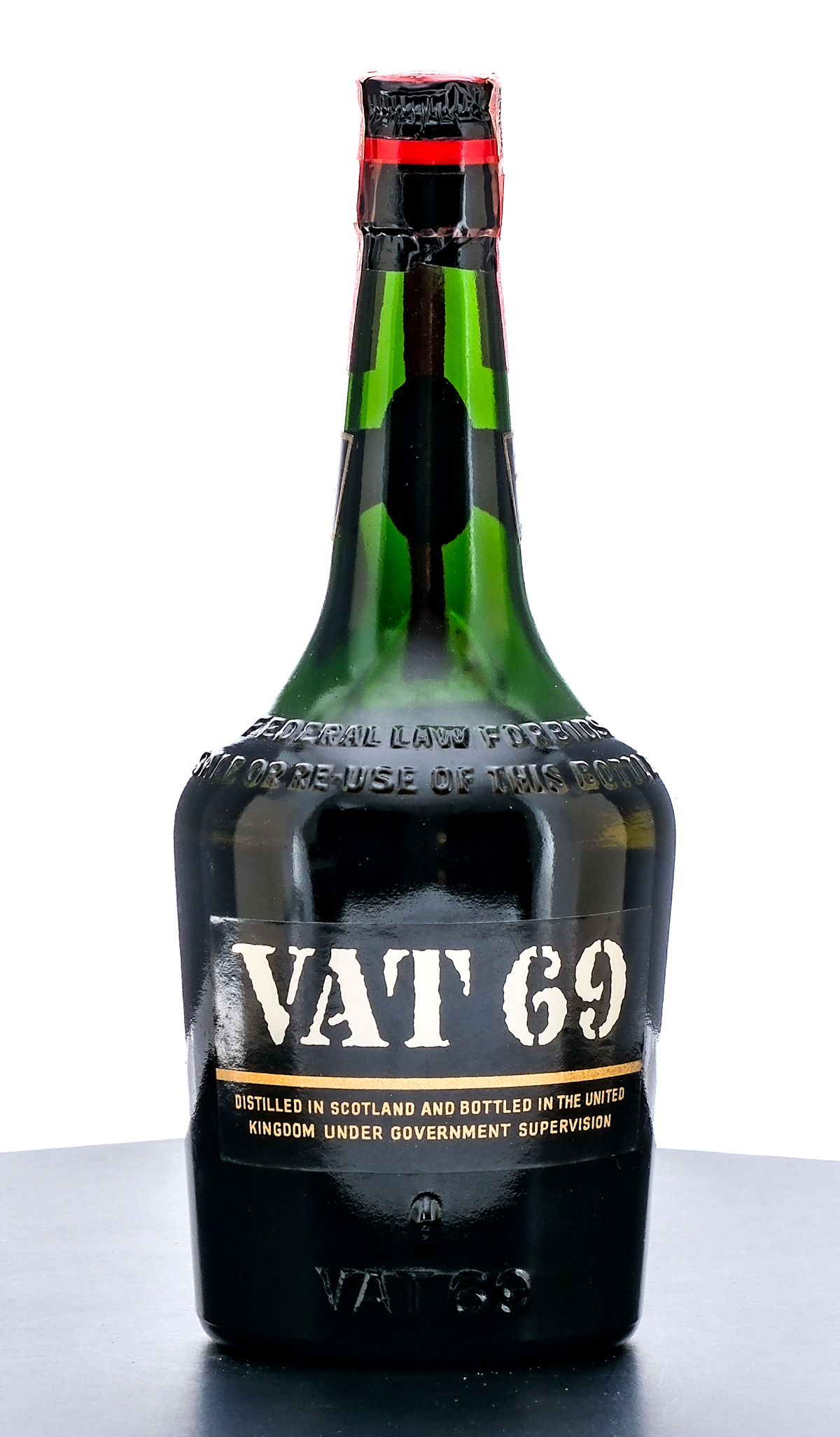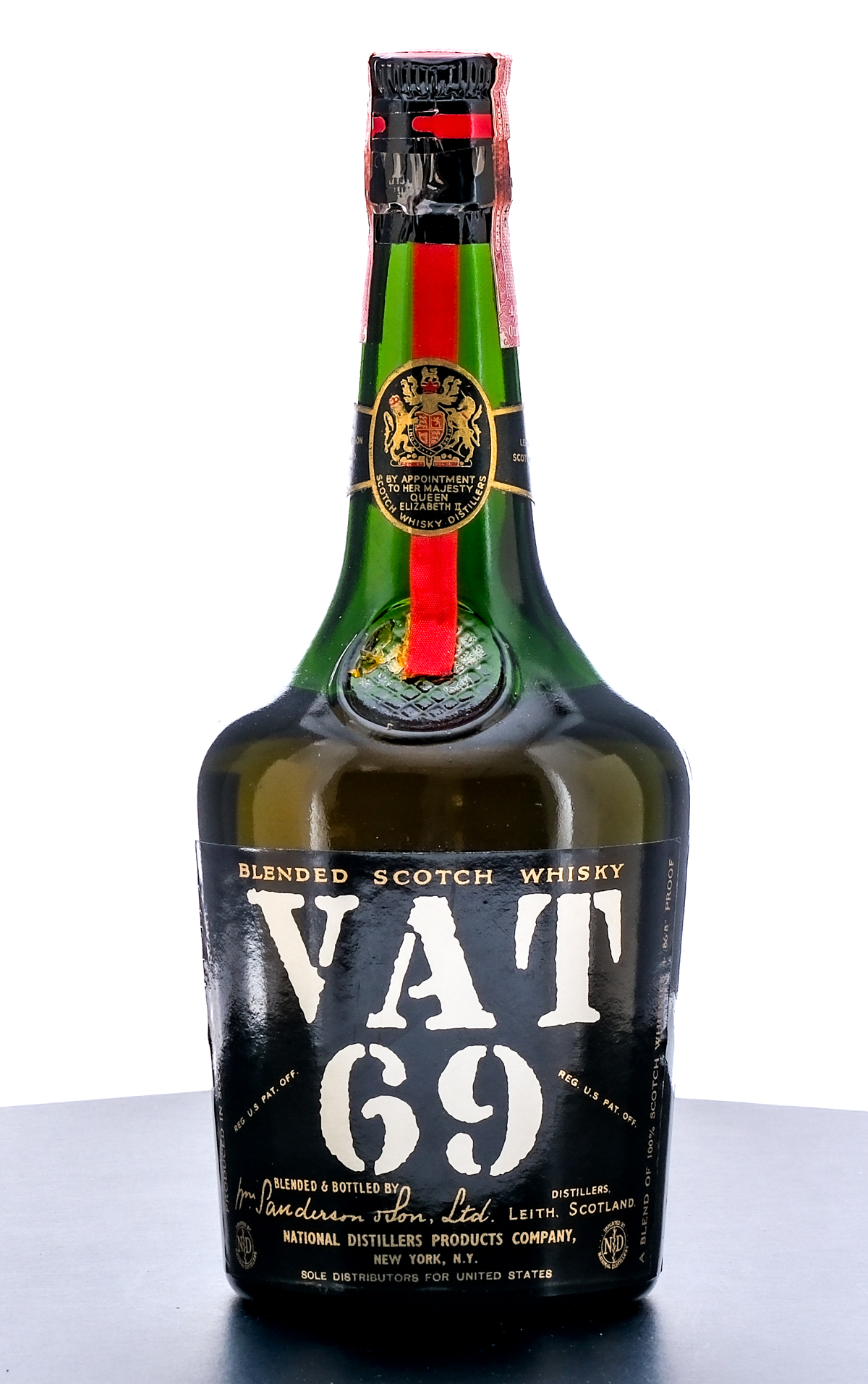Vat 69 Blended Scotch Whiskey Vintage Bottle (circa 1945-1960 based on tax stamp). 86.8 Proof. Foil, stamp and ribbon seal intact. Foil excellent. Stamp seal has been secured with Scotch tape to prevent lifting. Wax medallion applied over end of ribbon is lost to time. Printed labels excellent. 4/5 Qt. Blended & bottled by William Sanderson & Son. Sole distributors for United States: National Distillers Products Co. (New York, NY).