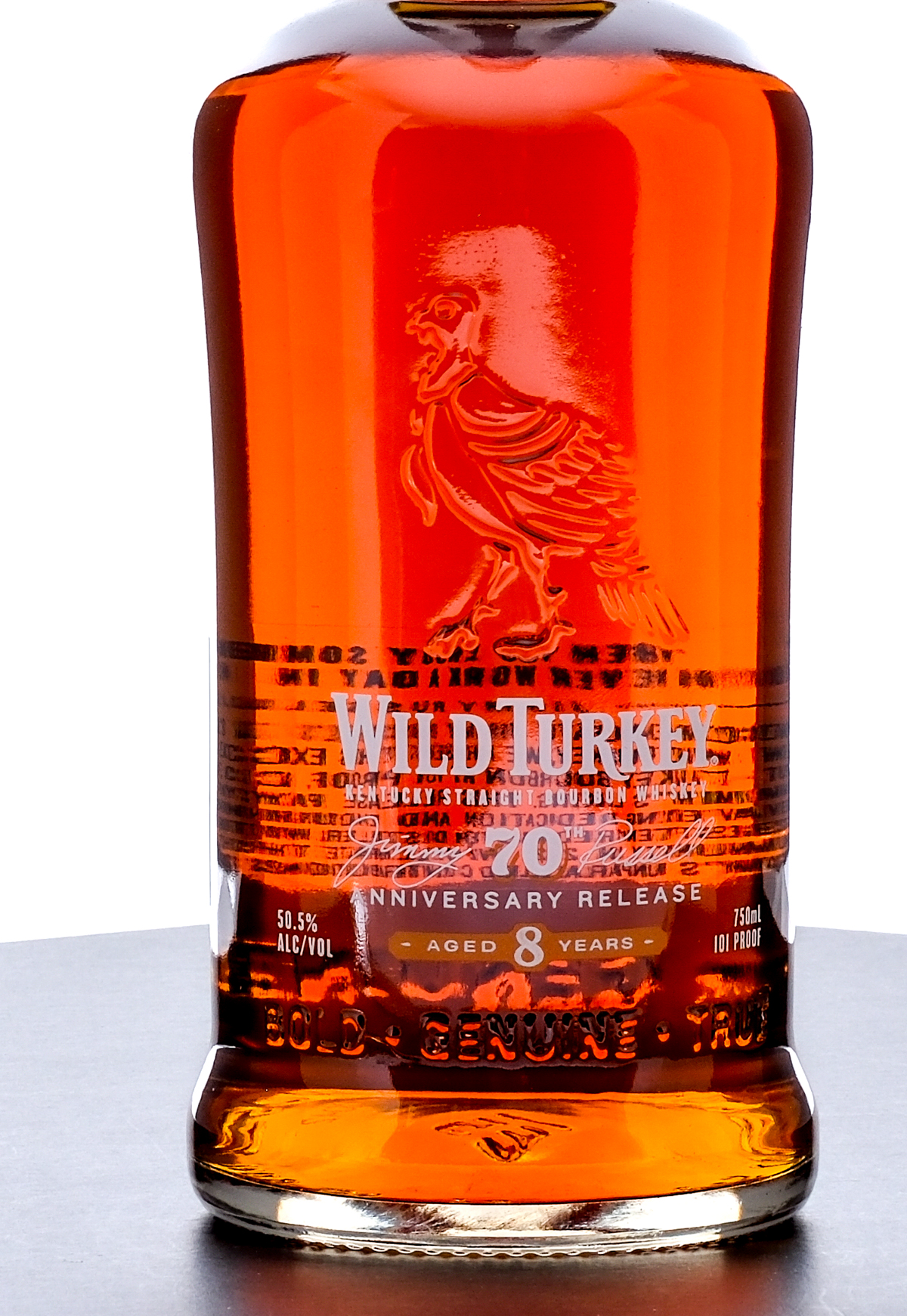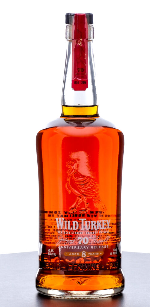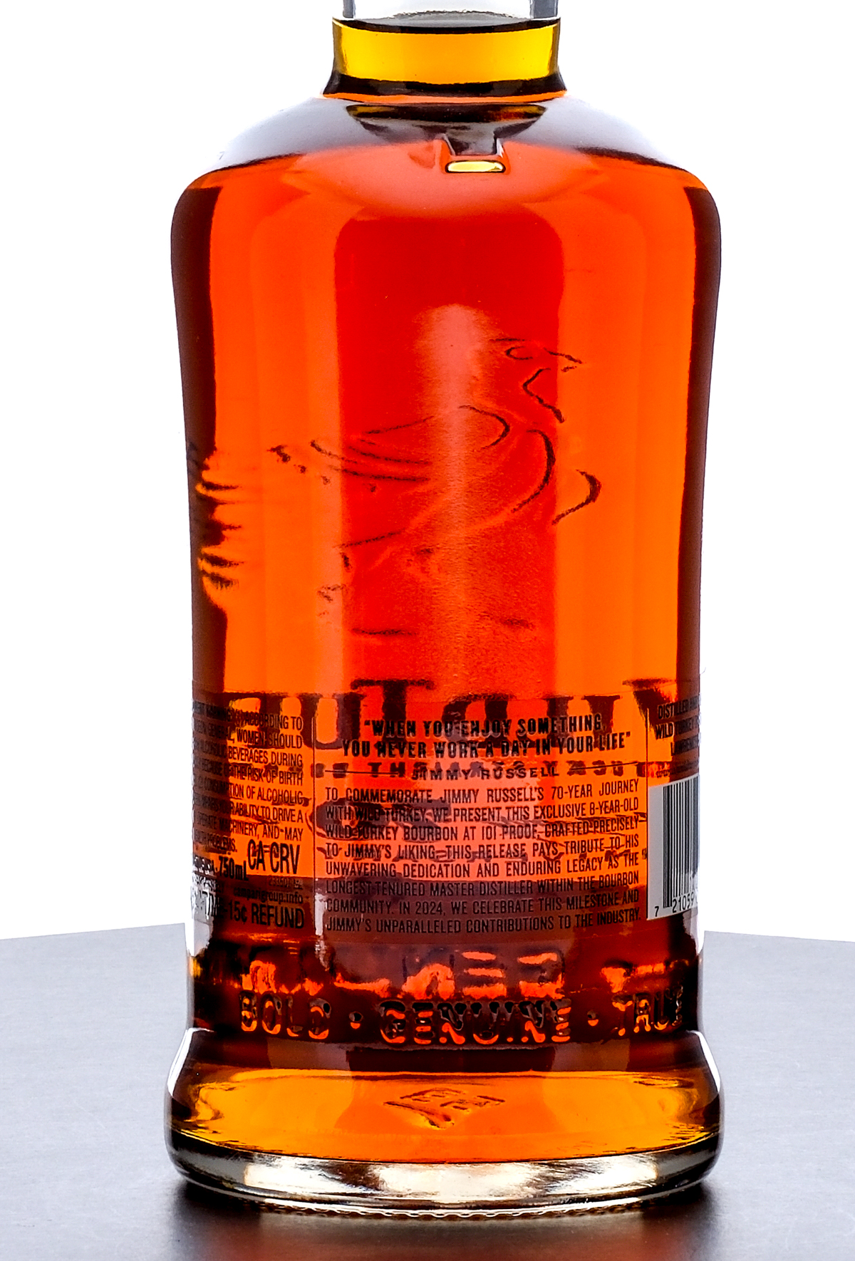 Wild Turkey Jimmy Russell 70th Anniversary Release 8 Year Kentucky Straight Bourbon Whiskey (2024). Commemorating Jimmy Russell’s 70th year with Wild Turkey. 50.5% ALC/VOL (101 Proof). Plastic and stamp seal intact. Screened and printed labels excellent. 750ml. Distilled and bottled by Wild Turkey Distilling Co.