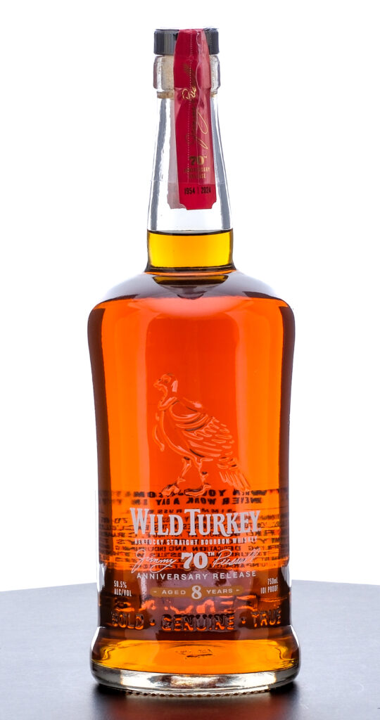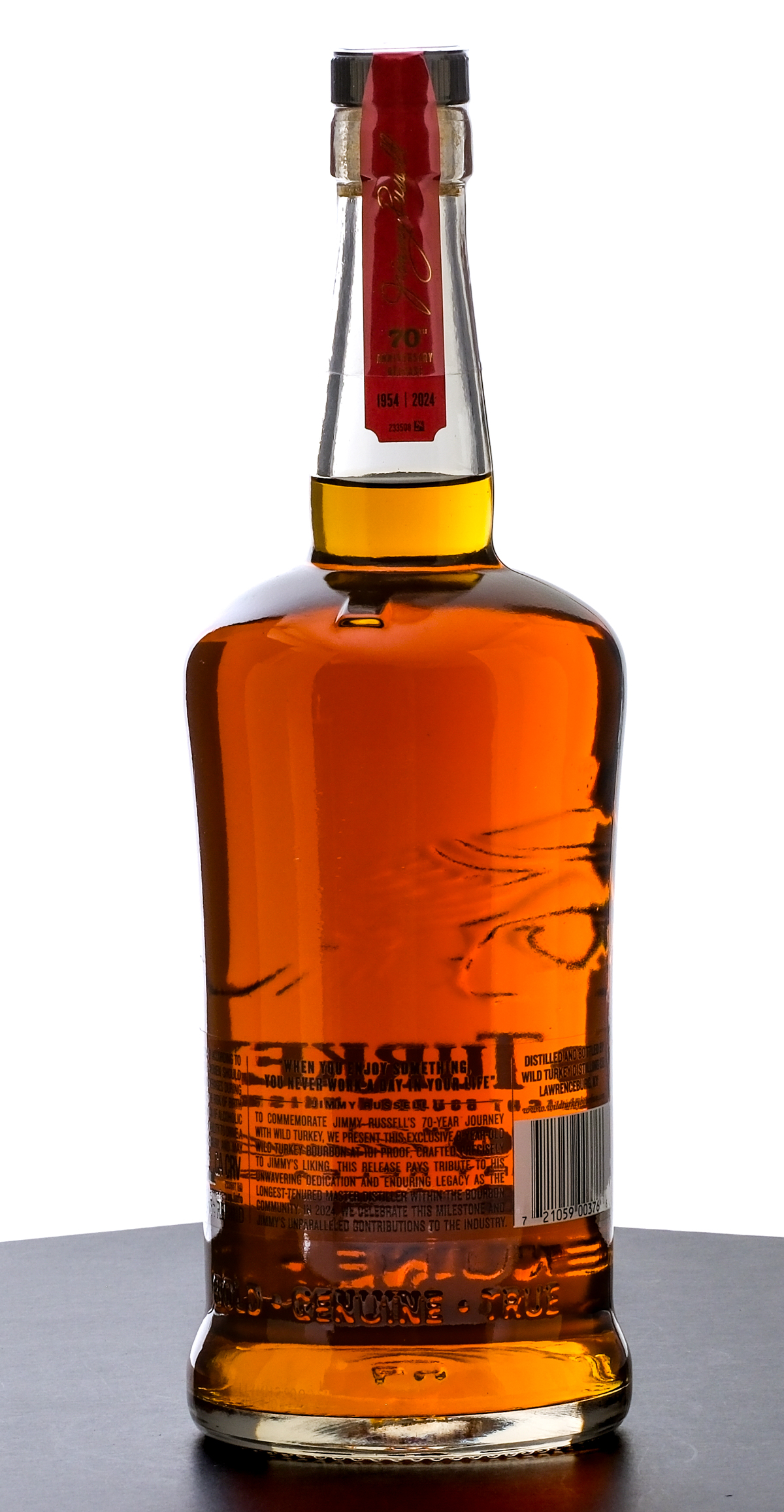 Wild Turkey Jimmy Russell 70th Anniversary Release 8 Year Kentucky Straight Bourbon Whiskey (2024). Commemorating Jimmy Russell’s 70th year with Wild Turkey. 50.5% ALC/VOL (101 Proof). Plastic and stamp seal intact. Screened and printed labels excellent. 750ml. Distilled and bottled by Wild Turkey Distilling Co., Lawrenceburg, KY.