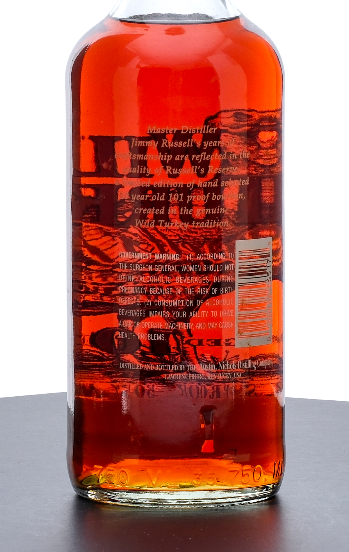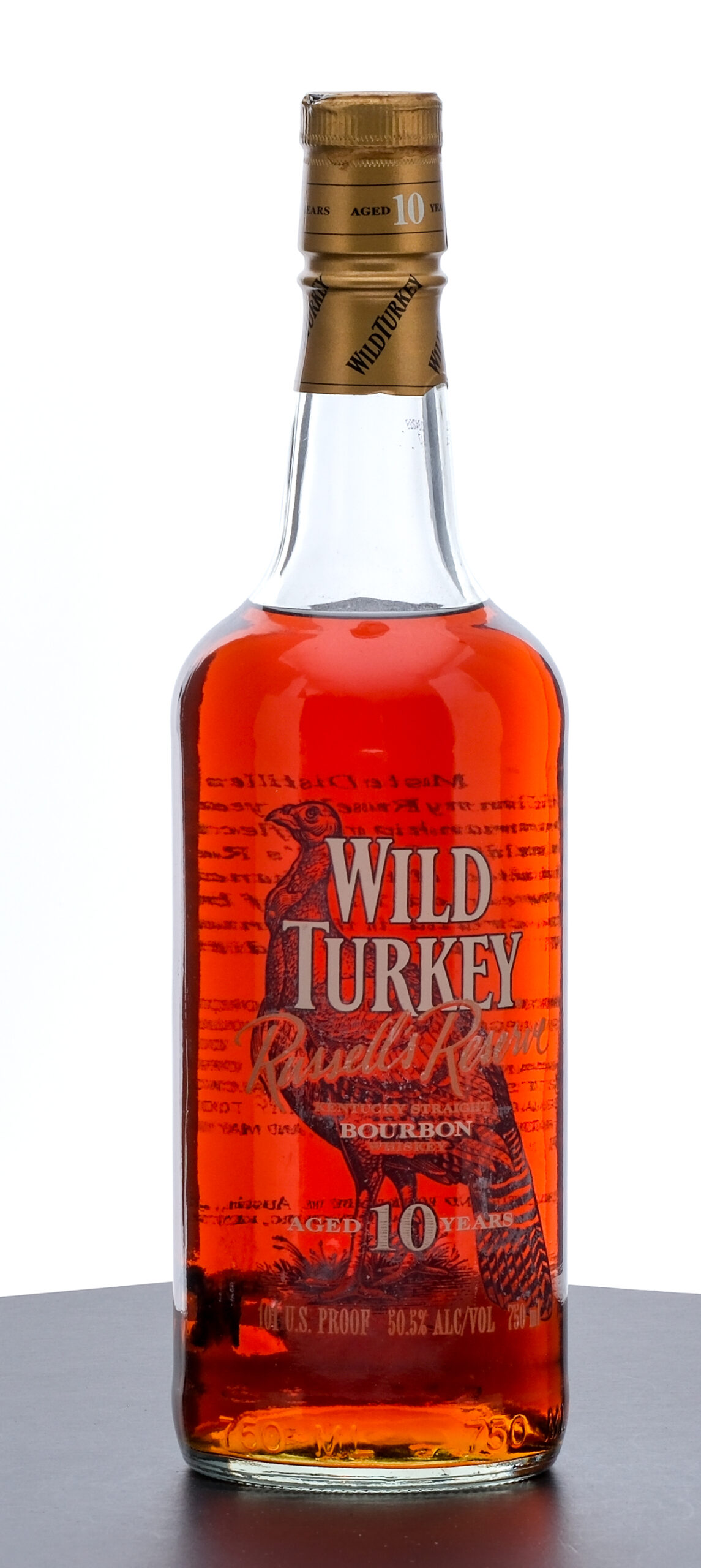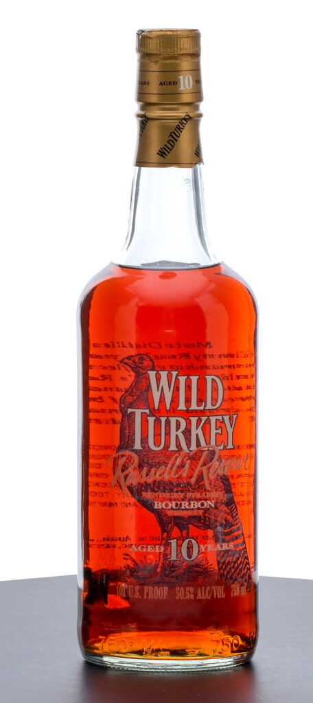 From The Collection of Michael Aronoff: Wild Turkey Russell’s Reserve 10 Year Kentucky Straight Bourbon Whiskey. Limited Edition. 50.5% ALC/VOL (101 Proof). Foil seal exhibits a nick along the rim and evidence of prior seepage. Screened labels excellent. 750ml. Distilled and bottled by the Austin Nichols Distilling Company.
