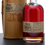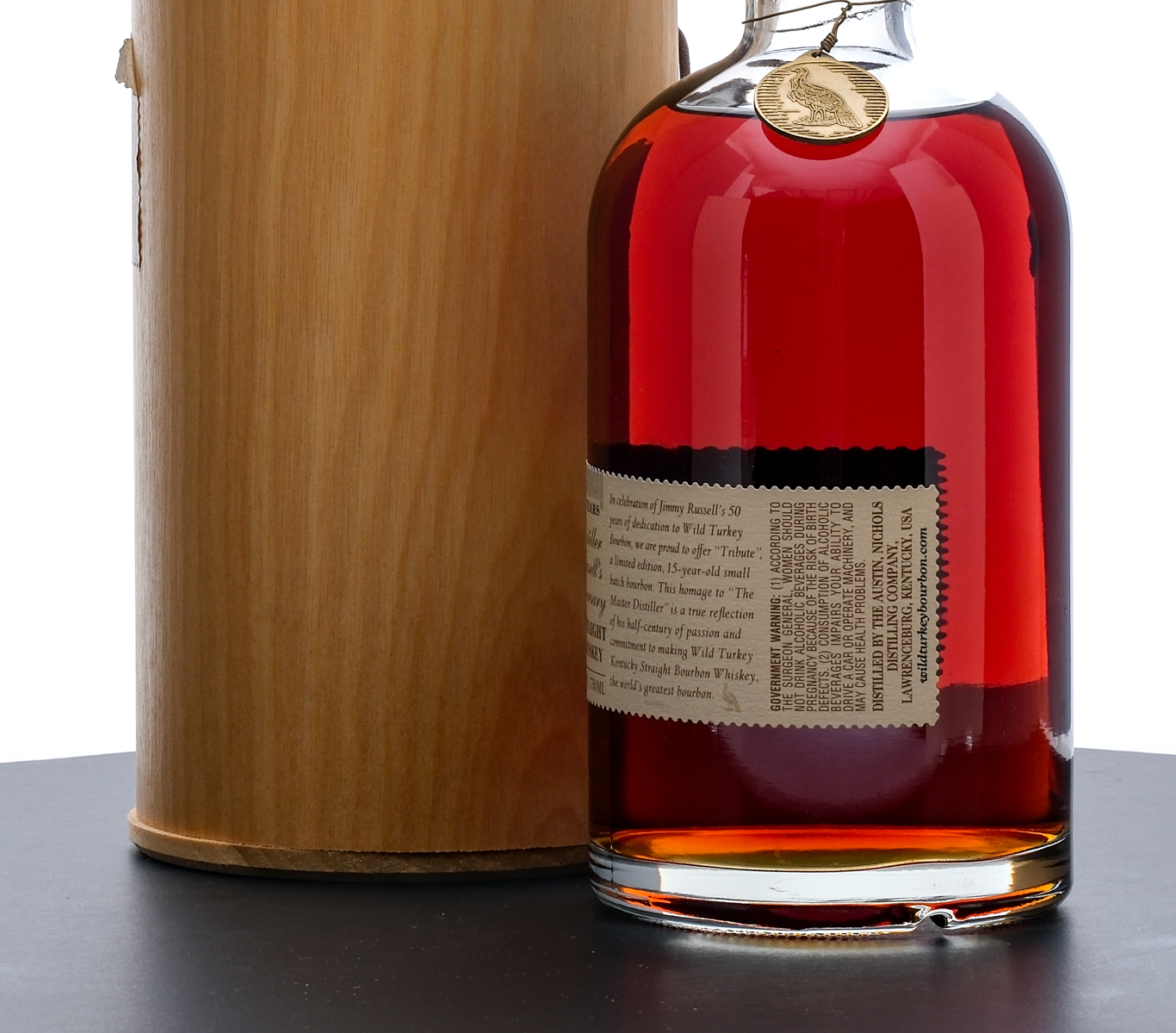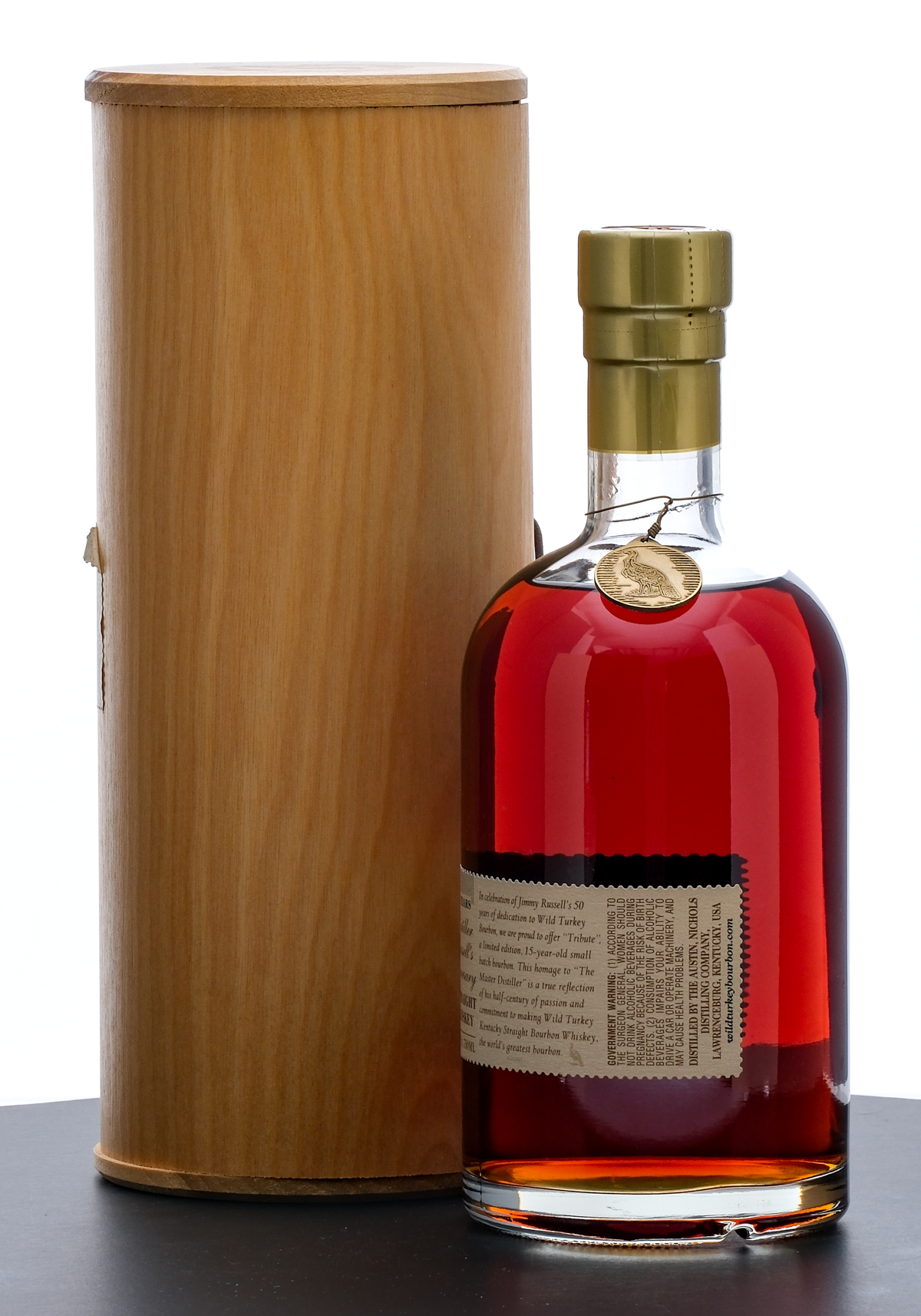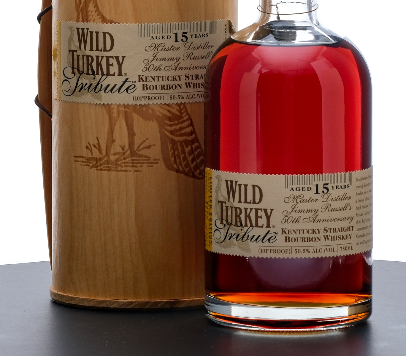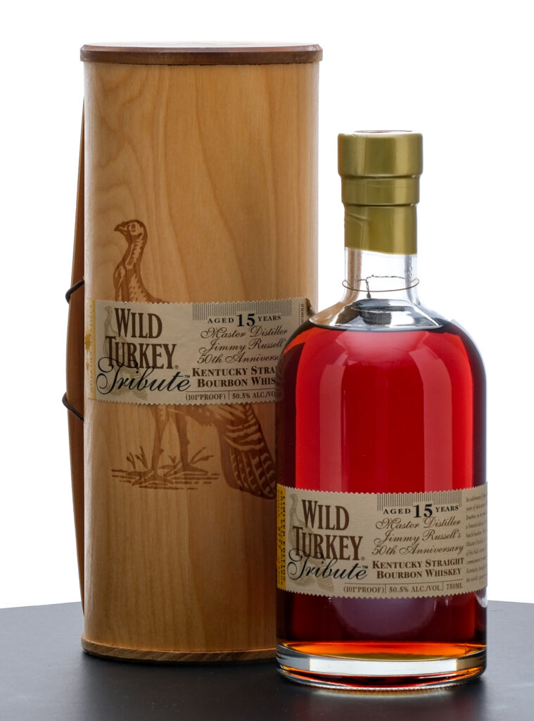 From The Collection of Michael Aronoff: Wild Turkey Tribute 15 Year Kentucky Straight Bourbon Whiskey (2004). Limited Edition. Small Batch. In celebration of Jimmy Russell’s 50 years of dedication to Wild Turkey Bourbon. Bottle 3777 of 5500. 50.5% ALC/VOL (101 Proof). Wooden presentation tube very good (with some scratches along the top portion and some wrinkling/lifting at the corners of the applied label). Plastic seal and hanging medallion intact. Printed label excellent. 750ml. Distilled by the Austin, Nichols Distilling Company.