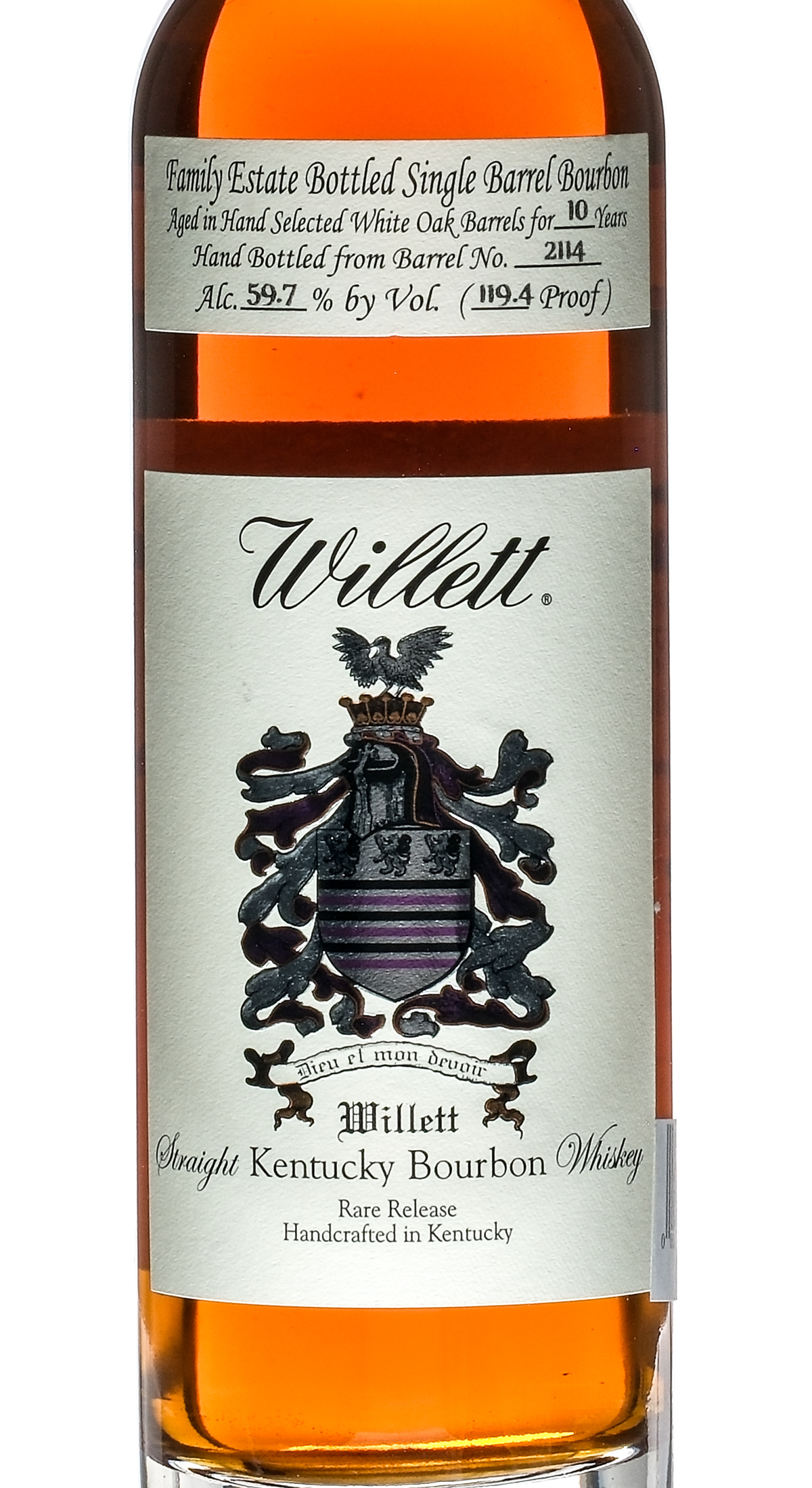 Purple Top NHLC (New Hampshire Liquor Commission) barrel pick. Barrel No. 2114. Bottle No. 98/154. Alc. 59.7% by Vol. 119.4 Proof. Labels and foil excellent. Glass decanter. Cork top. Whiskey Bourbon Willett Family Estate USA Kentucky 2023 10 Years 1 750ml