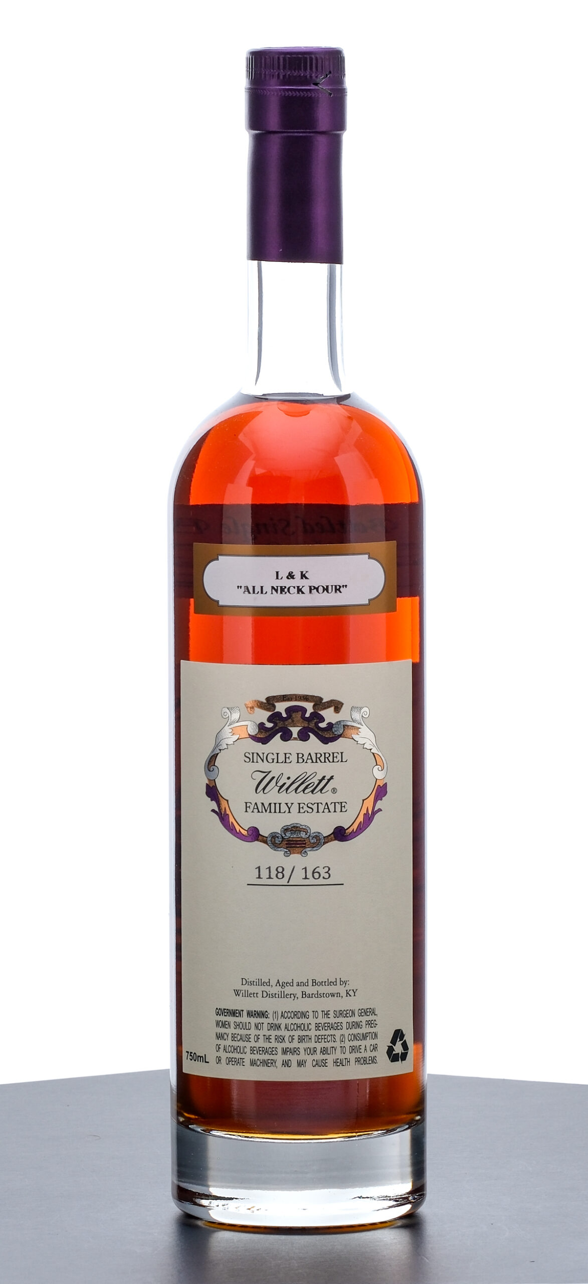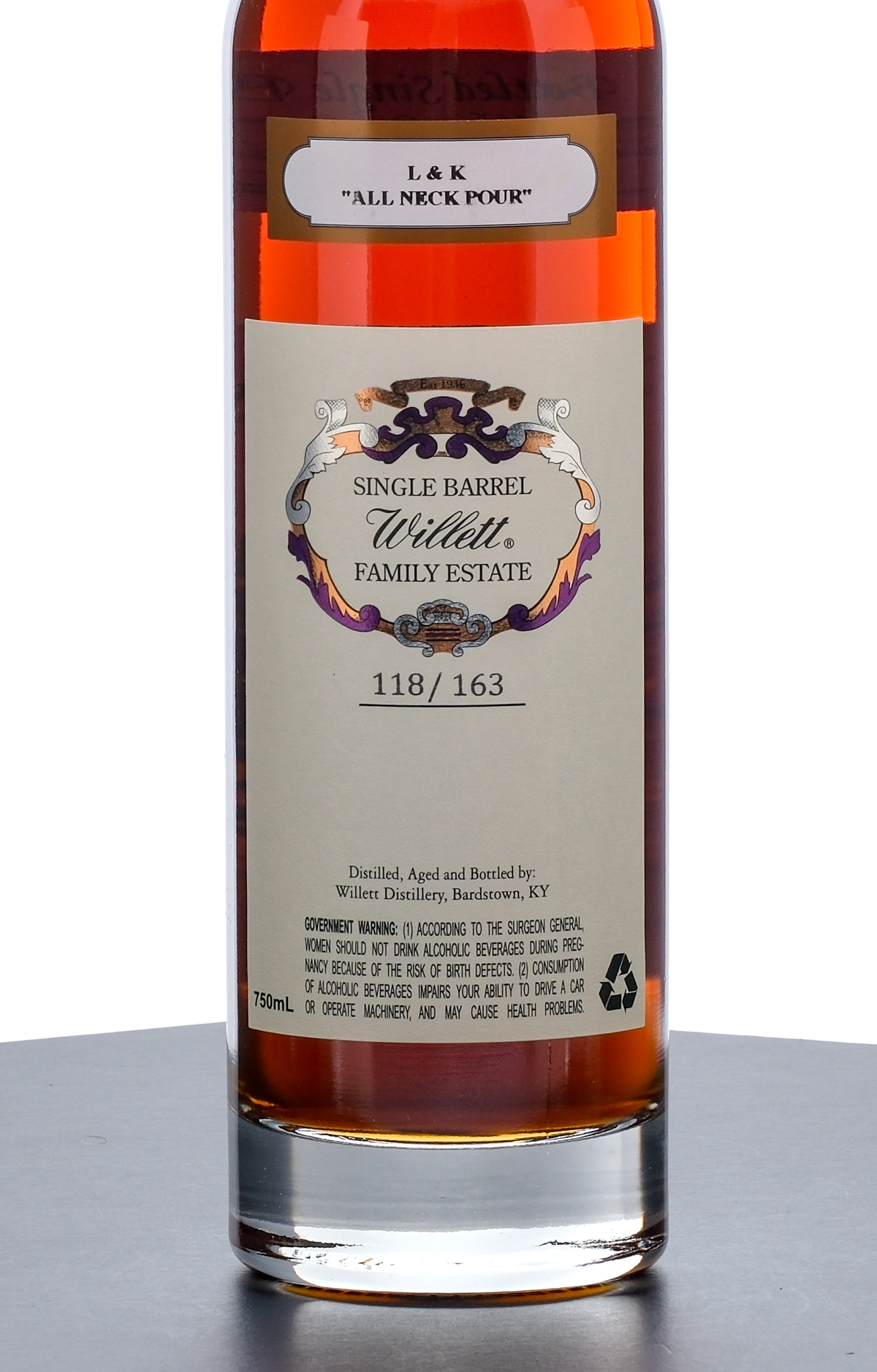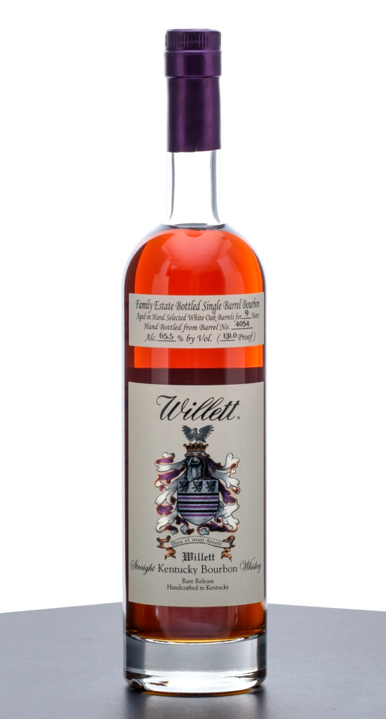 Willett Family Estate Bottled 9 Year Single Barrel Straight Kentucky Bourbon Whiskey. Rare Release. Selected for L&K (“All Neck Pour”). 118/163. Aged in hand selected White Oak barrels. Hand bottled from Barrel No. 4054. 65.5% ALC/VOL (131.0 Proof). Foil seal excellent. Printed labels likewise excellent. 750ml. Distilled, aged and bottled by Willett Distillery.
