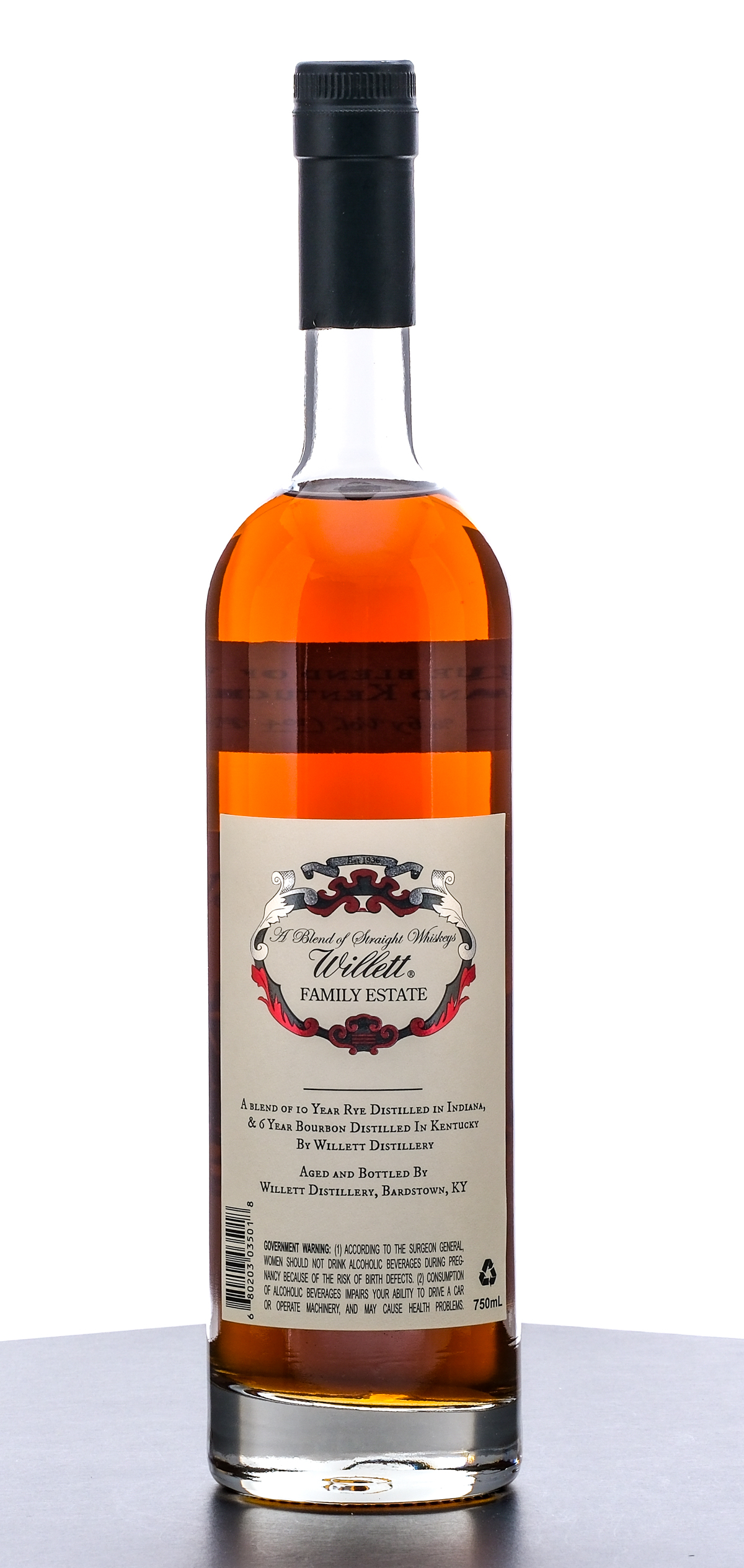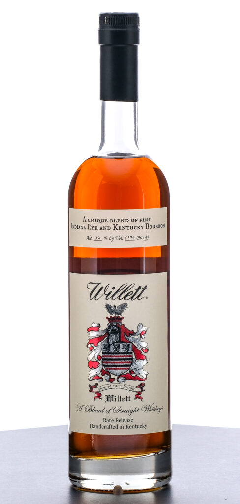 Willett Family Estate Rare Release. Blend of Straight Whiskeys. A Unique Blend of Fine Indiana Rye and Kentucky Bourbon. Blend: 10 Year Rye Distilled in Indiana, & 6 Year Bourbon Distilled in Kentucky. Handcrafted in Kentucky. 52% ALC/VOL. (104 Proof). Foil seal excellent. Printed labels likewise excellent. 750ml. Aged and Bottled by Willet Distillery, Bardstown, KY.